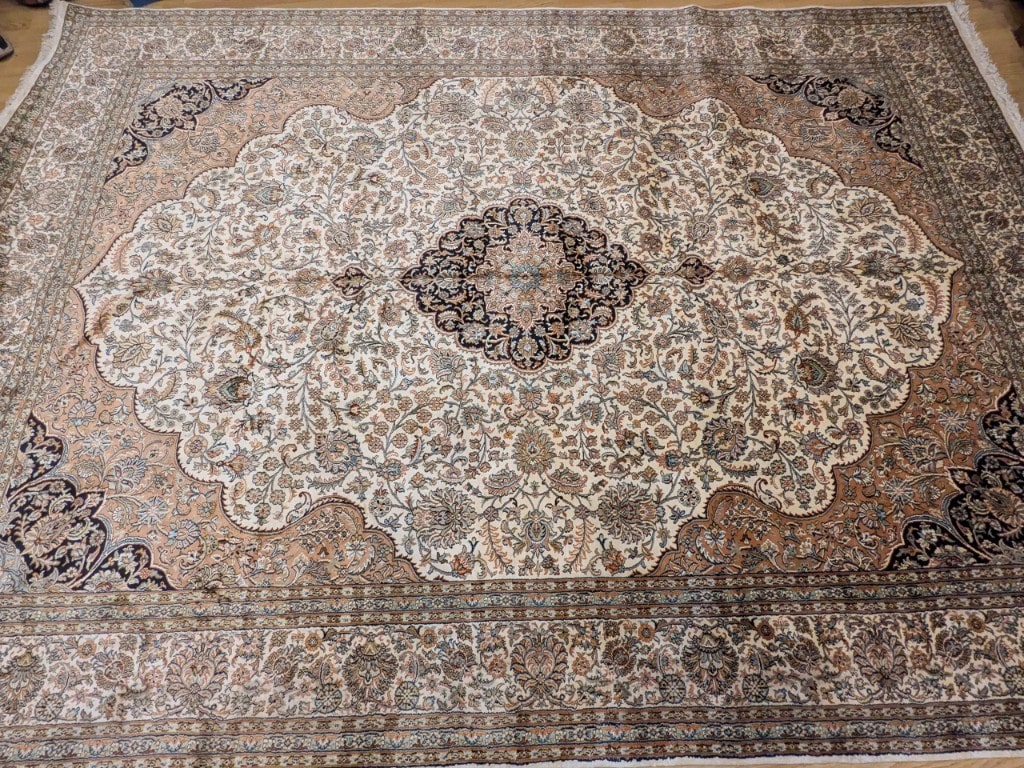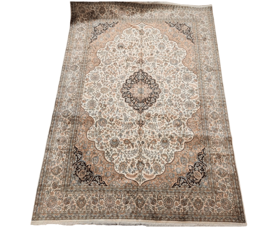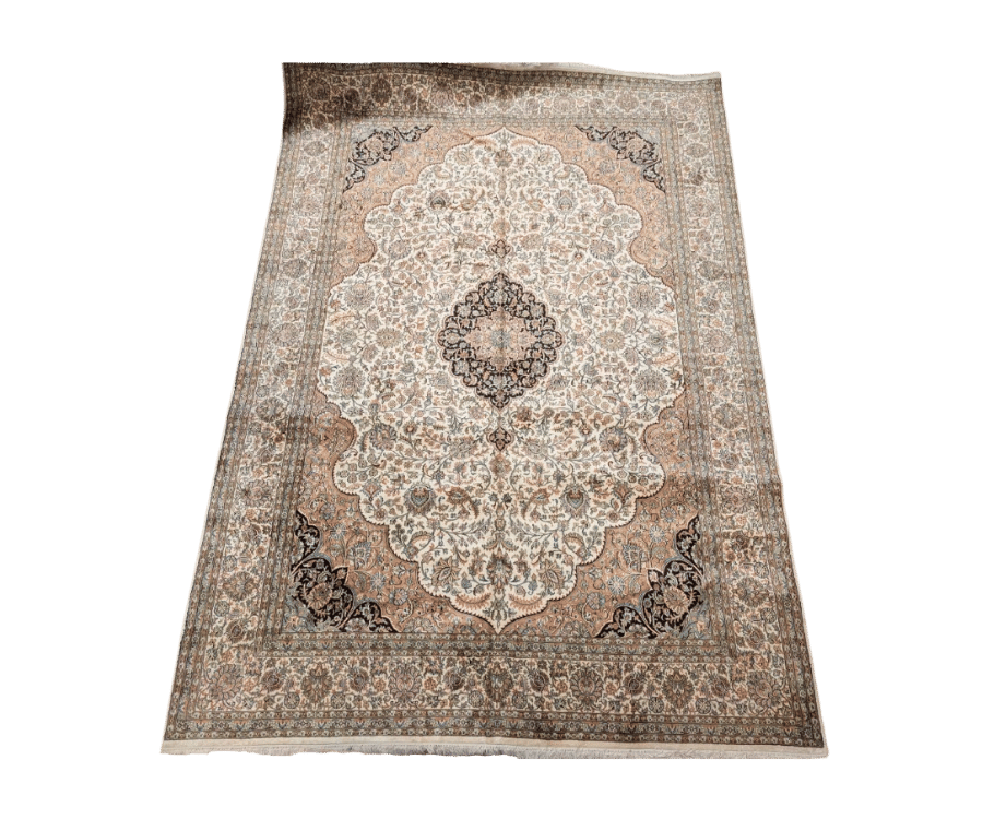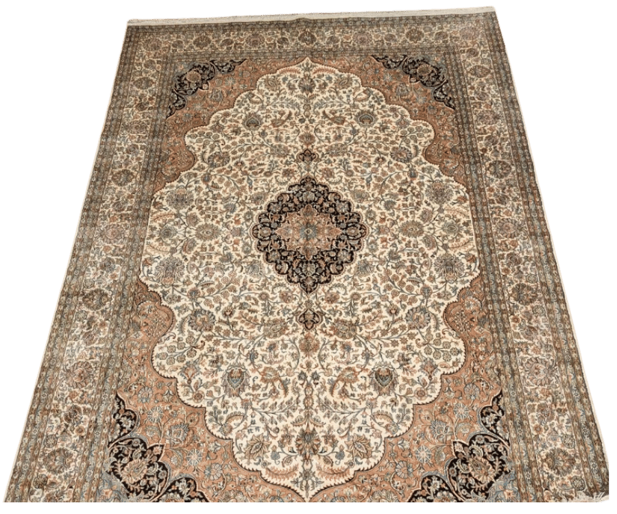 Ce tapis est un hommage à la tradition persane revisitée avec la sensibilité propre au Cachemire indien. Une pièce imposante et lumineuse, parfaite pour sublimer les grands espaces avec finesse.