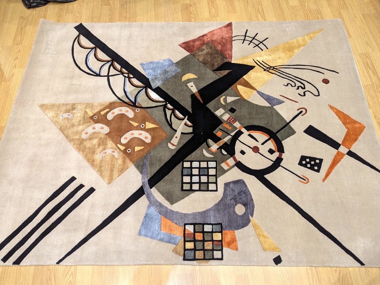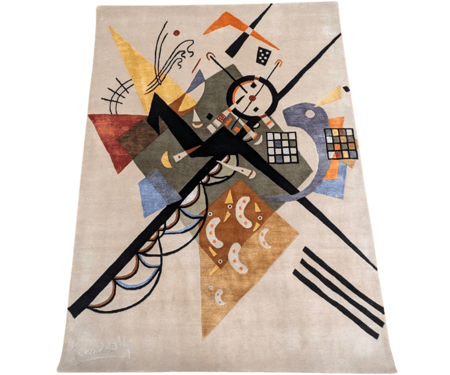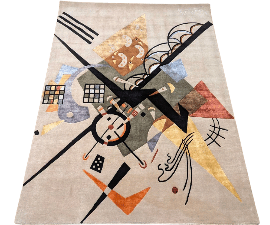 L’inspiration artistique est évidente, presque picturale, avec une construction qui rappelle un collage moderne. Malgré la richesse des éléments graphiques, le fond clair permet au tapis de conserver une grande élégance et de s’intégrer facilement dans un intérieur contemporain.