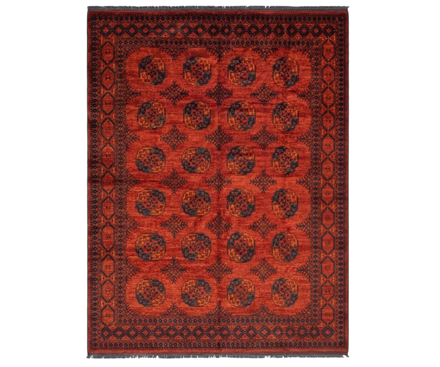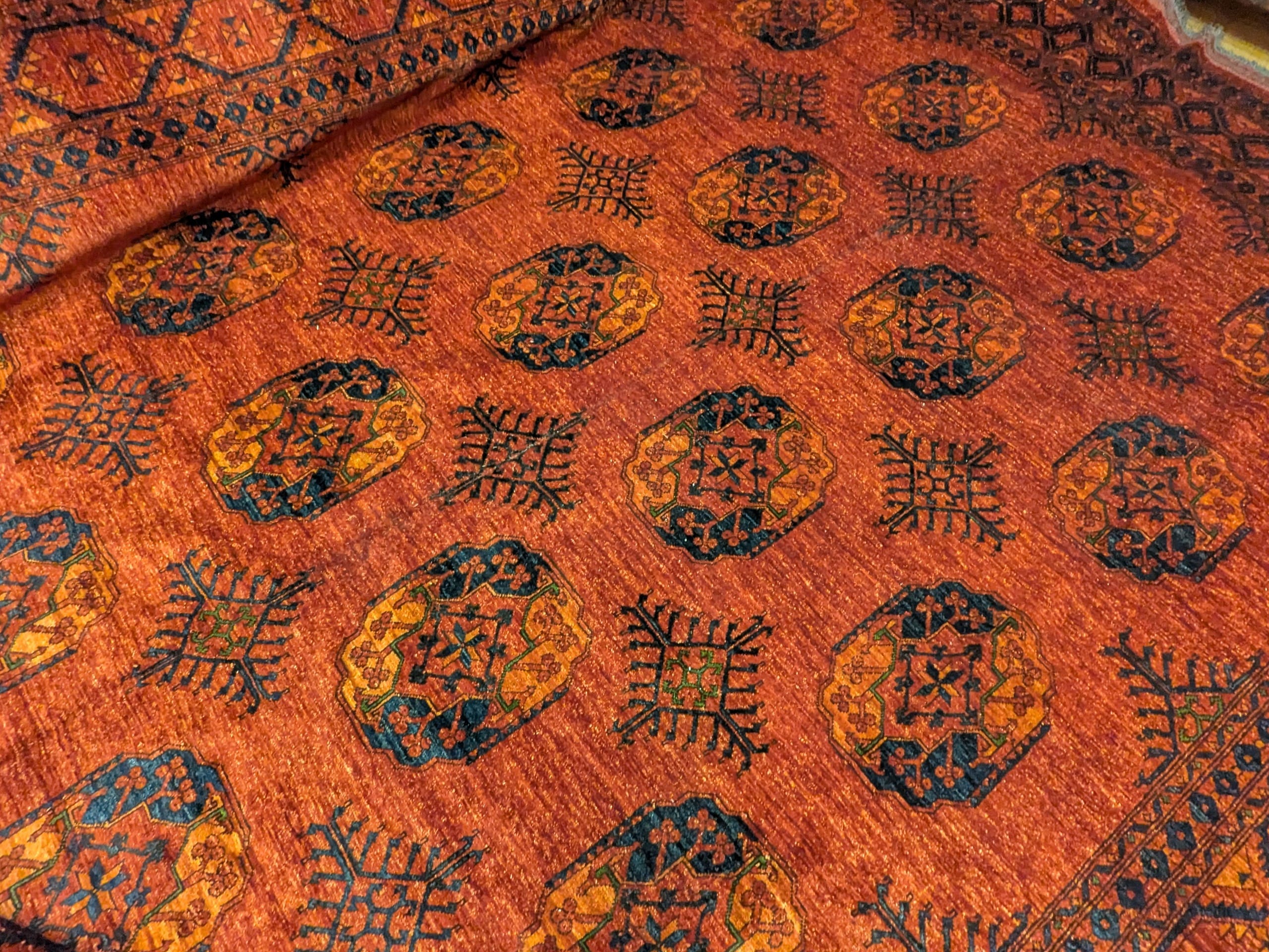 Ce tapis Ersari afghan séduit immédiatement par son champ aux nuances profondes de rouille, une teinte chaleureuse emblématique des tapis tribaux d’Asie centrale. Son décor est structuré par une répétition régulière de motifs guhl, ces emblèmes traditionnels disposés en rangées qui rythment toute la surface du tapis. Cette composition crée une structure graphique forte tout en conservant une grande harmonie visuelle.