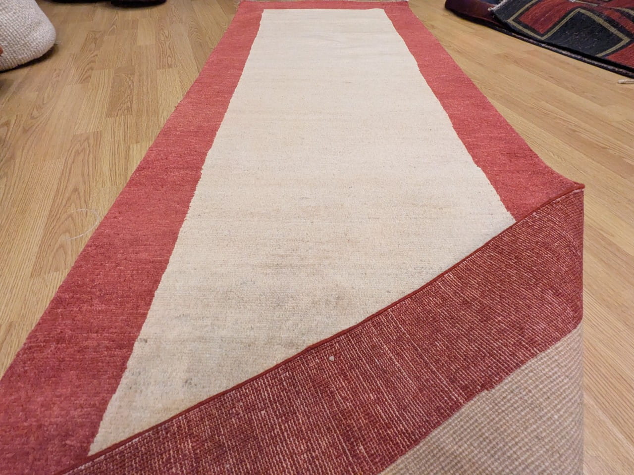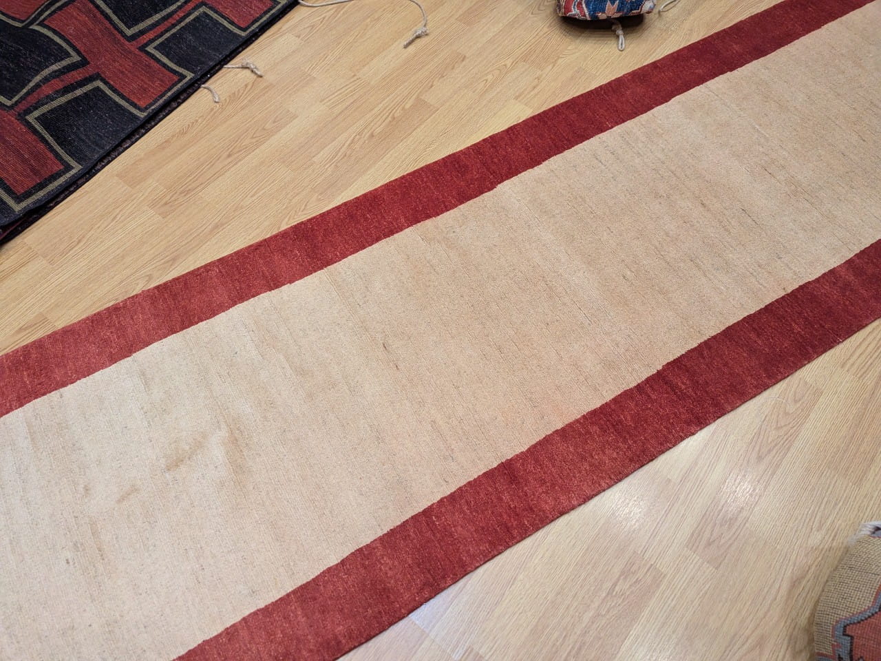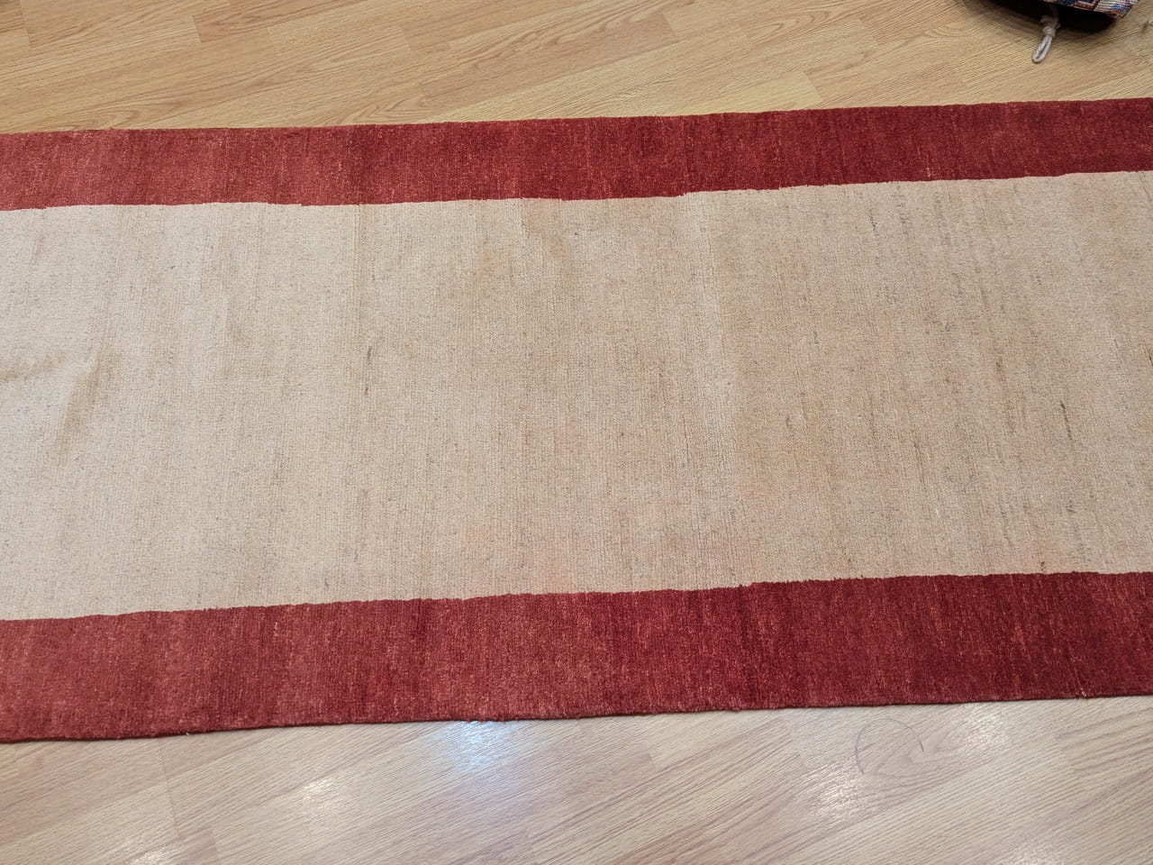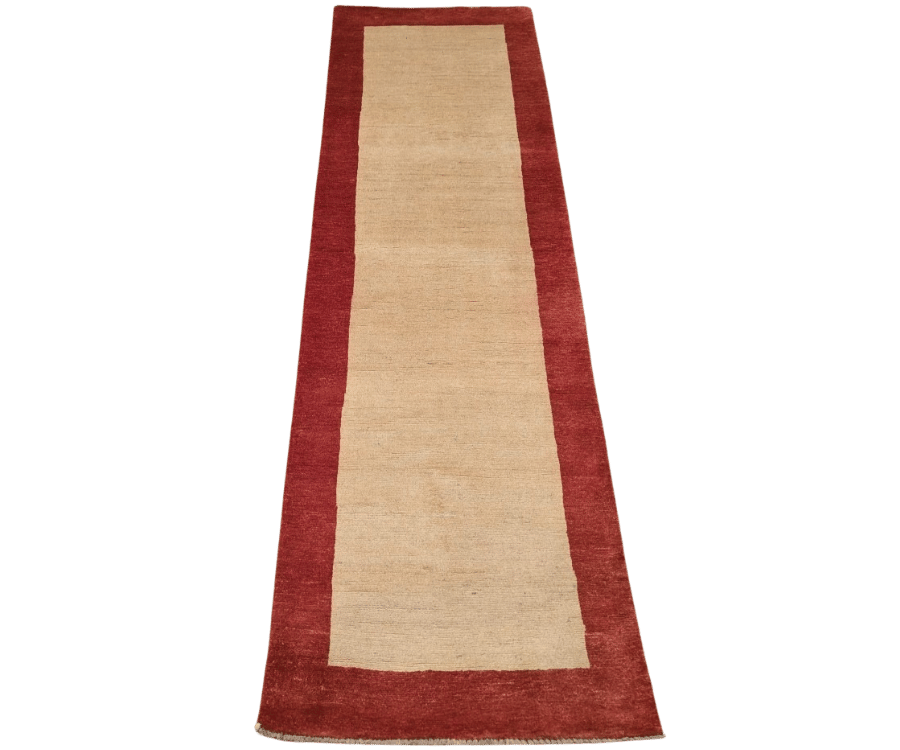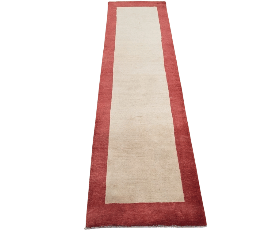 Ce tapis Gabbian noué à la main en Afghanistan incarne la beauté de la simplicité. Son large champ beige uni est encadré par une bordure rouge sourde, formant un contraste doux et chaleureux. Grâce à l’absence de motifs, il laisse respirer l’espace et s’intègre aisément dans tous types d’intérieurs, des plus épurés aux plus contemporains.