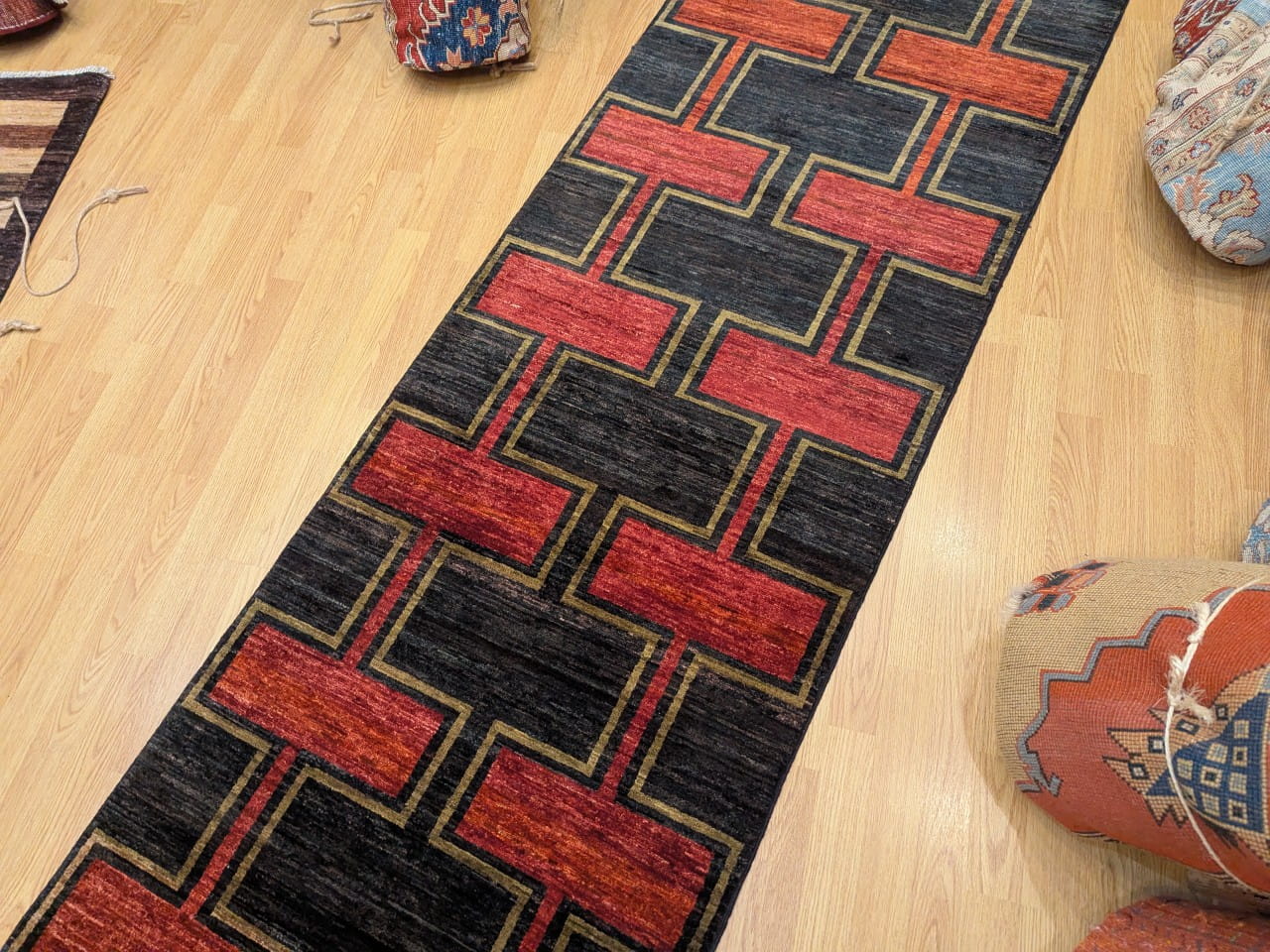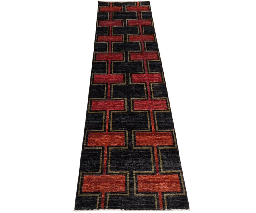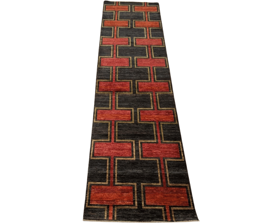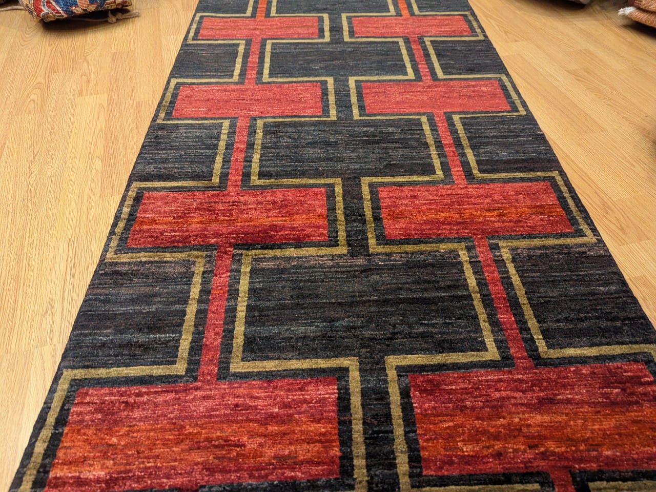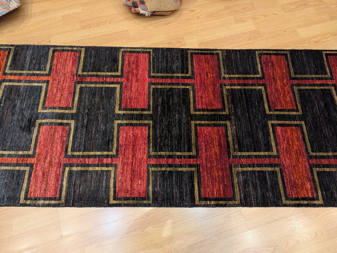 Ce tapis Gabbian d’Afghanistan attire immédiatement l’œil par son contraste puissant entre un fond noir profond et de larges formes géométriques rouge-orangé, encadrées de lignes jaunes safran. Son motif structuré et répétitif évoque une modernité assumée, tandis que la qualité de la laine nouée à la main garantit un toucher dense et agréable. Idéal pour dynamiser un espace tout en conservant une élégance sobre.