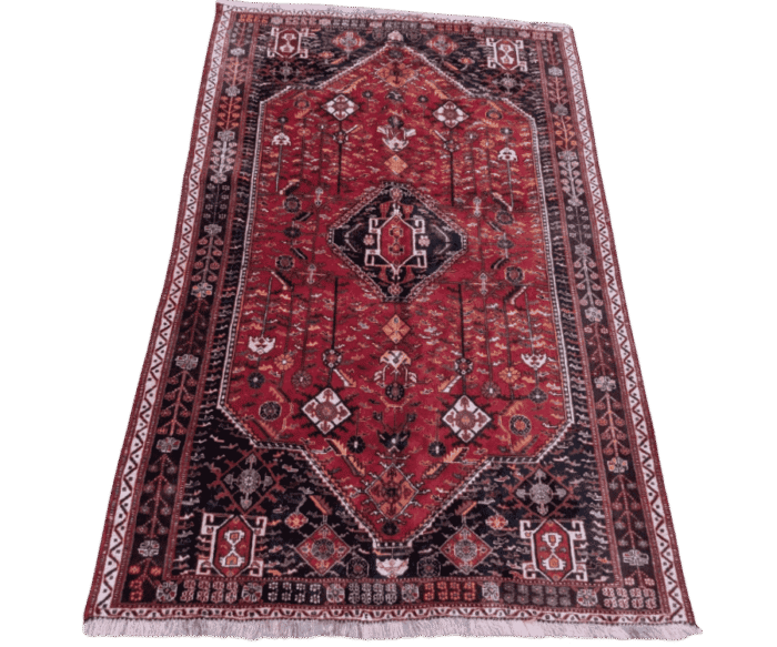 Ce tapis Ghashgai noué à la main, en provenance du sud de l’Iran, est une pièce emblématique de l’art tribal persan. Son fond rouge éclatant, rehaussé de motifs floraux stylisés et de symboles géométriques denses, incarne à merveille le raffinement et la force visuelle caractéristiques des créations ghashgai. Le médaillon central, structuré avec minutie, est encadré d’un foisonnement de petits détails, tous empreints de symbolisme.
