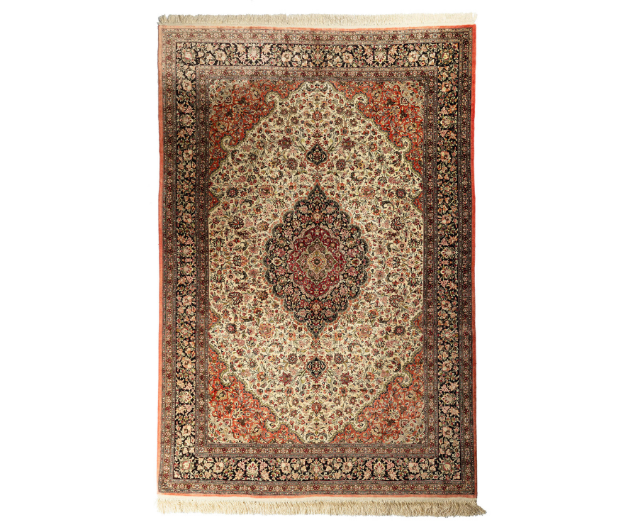 Les tapis de Ghoum (Qom) sont réputés pour leur très grande finesse de nouage et la précision exceptionnelle de leurs motifs, souvent réalisés entièrement en soie. Cette technique permet d’obtenir des dessins extrêmement détaillés et un aspect lumineux caractéristique de ces pièces prestigieuses.