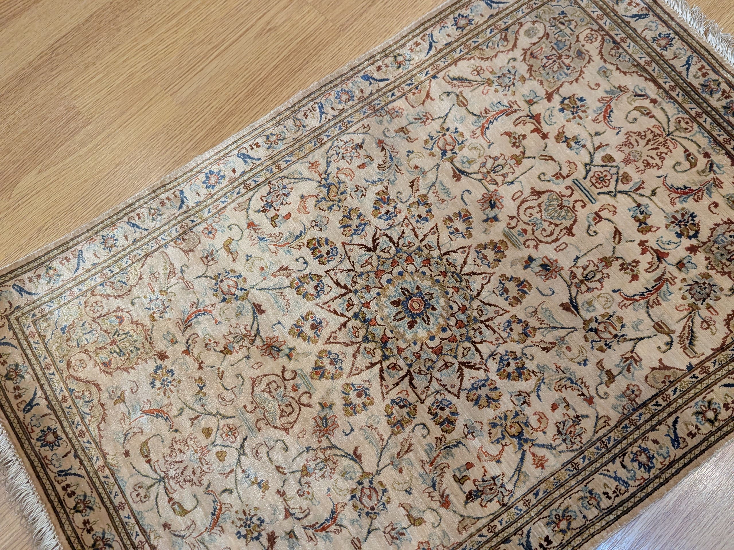 Ce Ghoum en soie incarne l’élégance intemporelle des grands tapis persans, alliant légèreté visuelle et richesse ornementale dans un format compact et harmonieux.