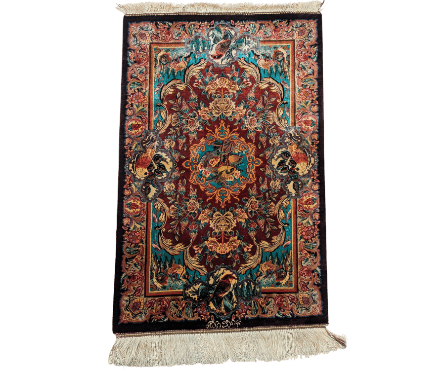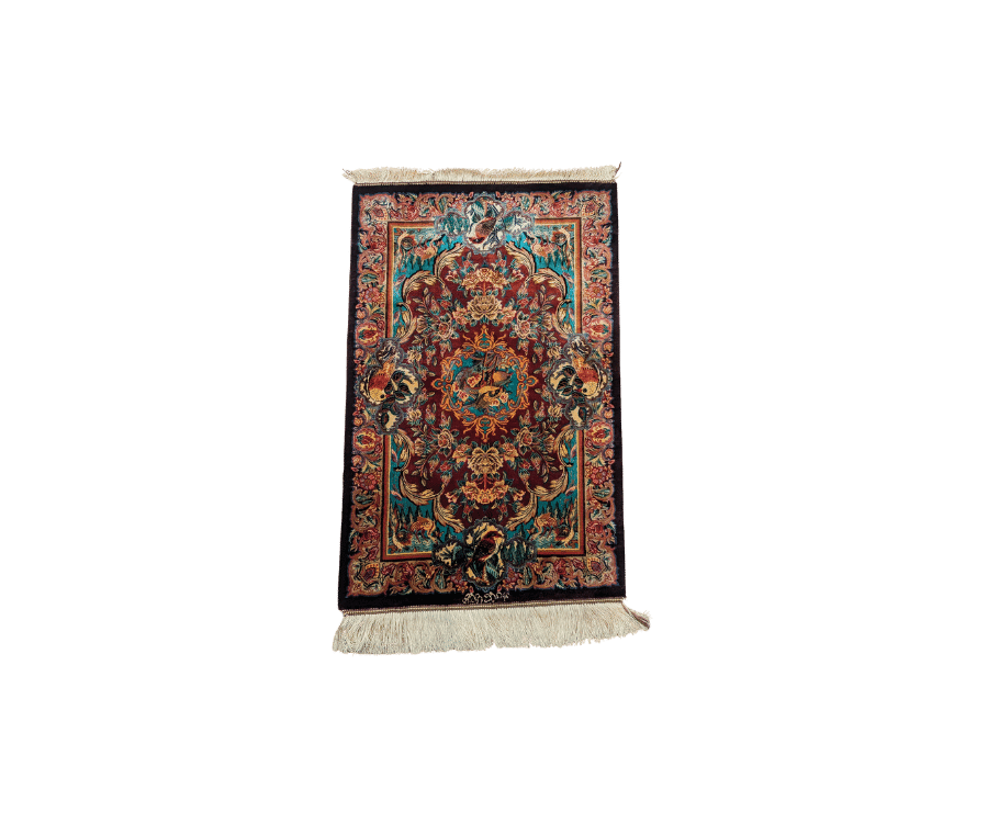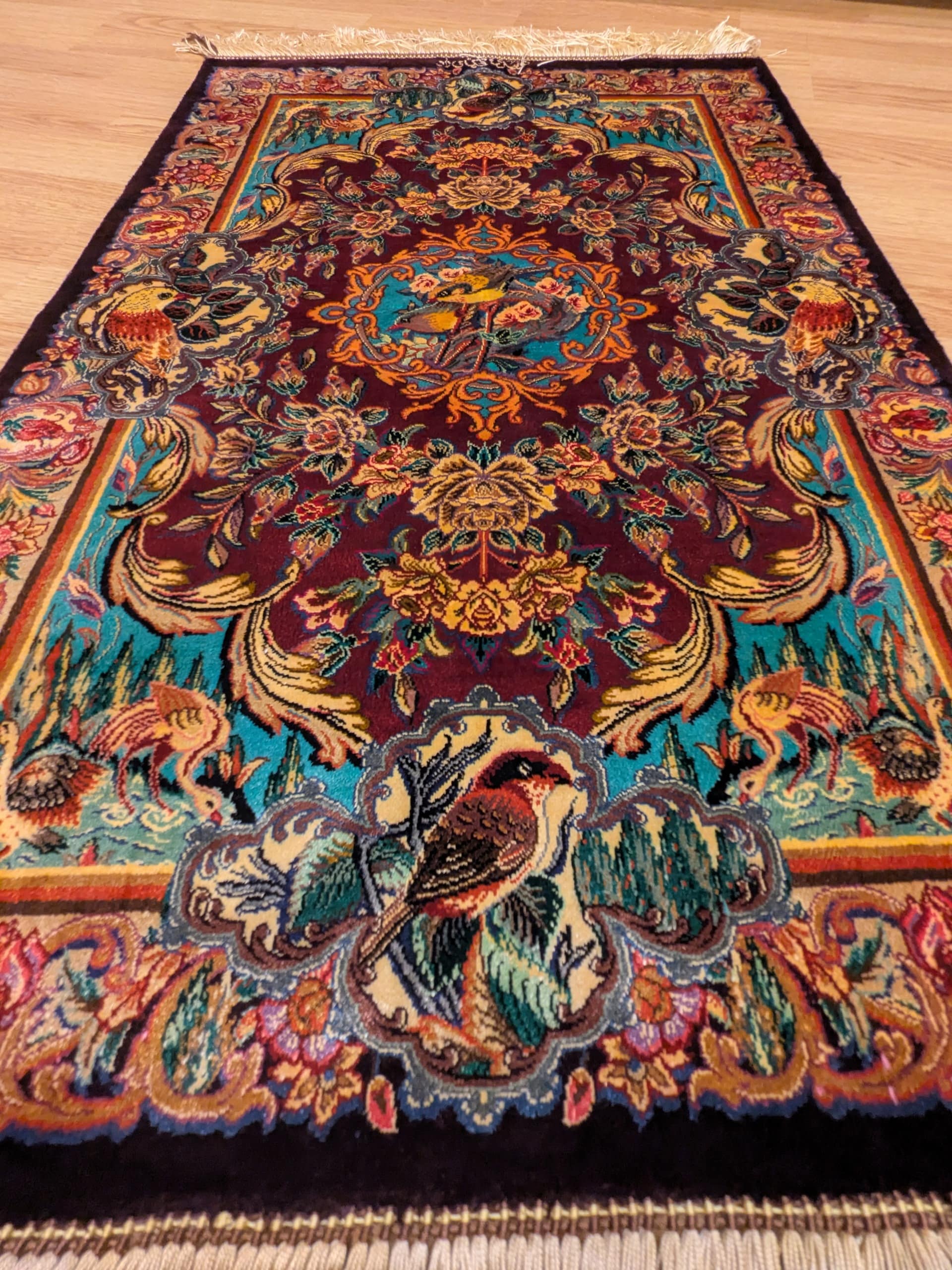 Ce tapis Ghoum en soie noué à la main en Iran est une pièce d’une finesse exceptionnelle. Sur un fond rouge profond, deux oiseaux délicatement représentés se détachent au centre d’un décor richement fleuri. Chaque détail est mis en valeur par les reflets chatoyants de la soie, créant un tableau vibrant de vie et de couleurs. La combinaison des tons chauds et des éléments turquoise apporte un équilibre visuel raffiné et captivant.
