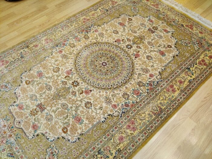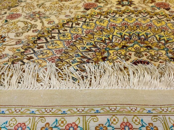 Une brillance incomparable : Grâce à la soie naturelle, ce tapis capte la lumière avec intensité, mettant en valeur la complexité de son dessin.