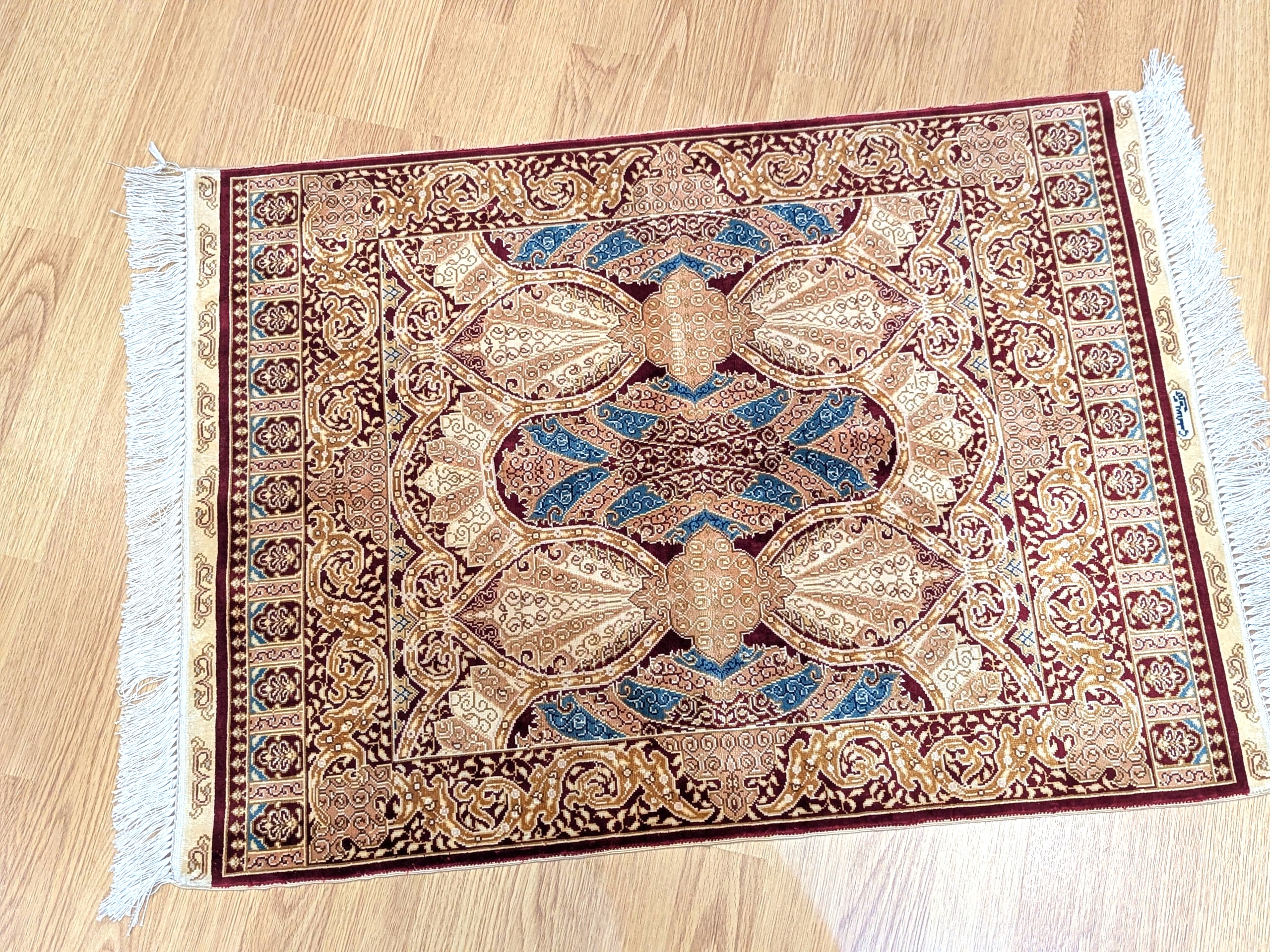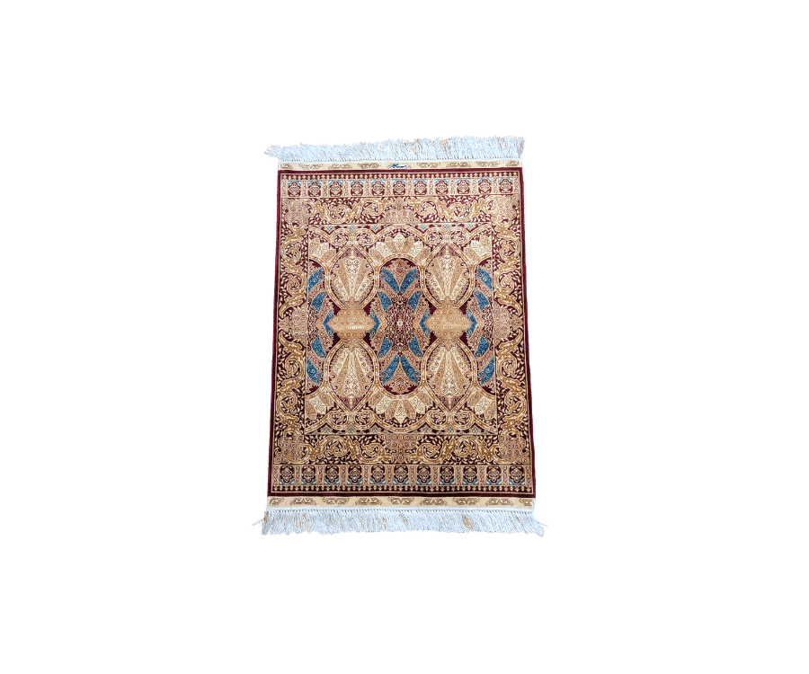 Ce tapis Hereke de Turquie se distingue par son fond beige lumineux, sublimé par une composition d’une grande richesse ornementale. Le décor s’organise autour de médaillons ovalisés imbriqués, reliés par un réseau dense de rinceaux et d’arabesques florales. Les nuances de bordeaux profond, d’ocre doré et de bleu turquoise viennent rythmer l’ensemble avec élégance.