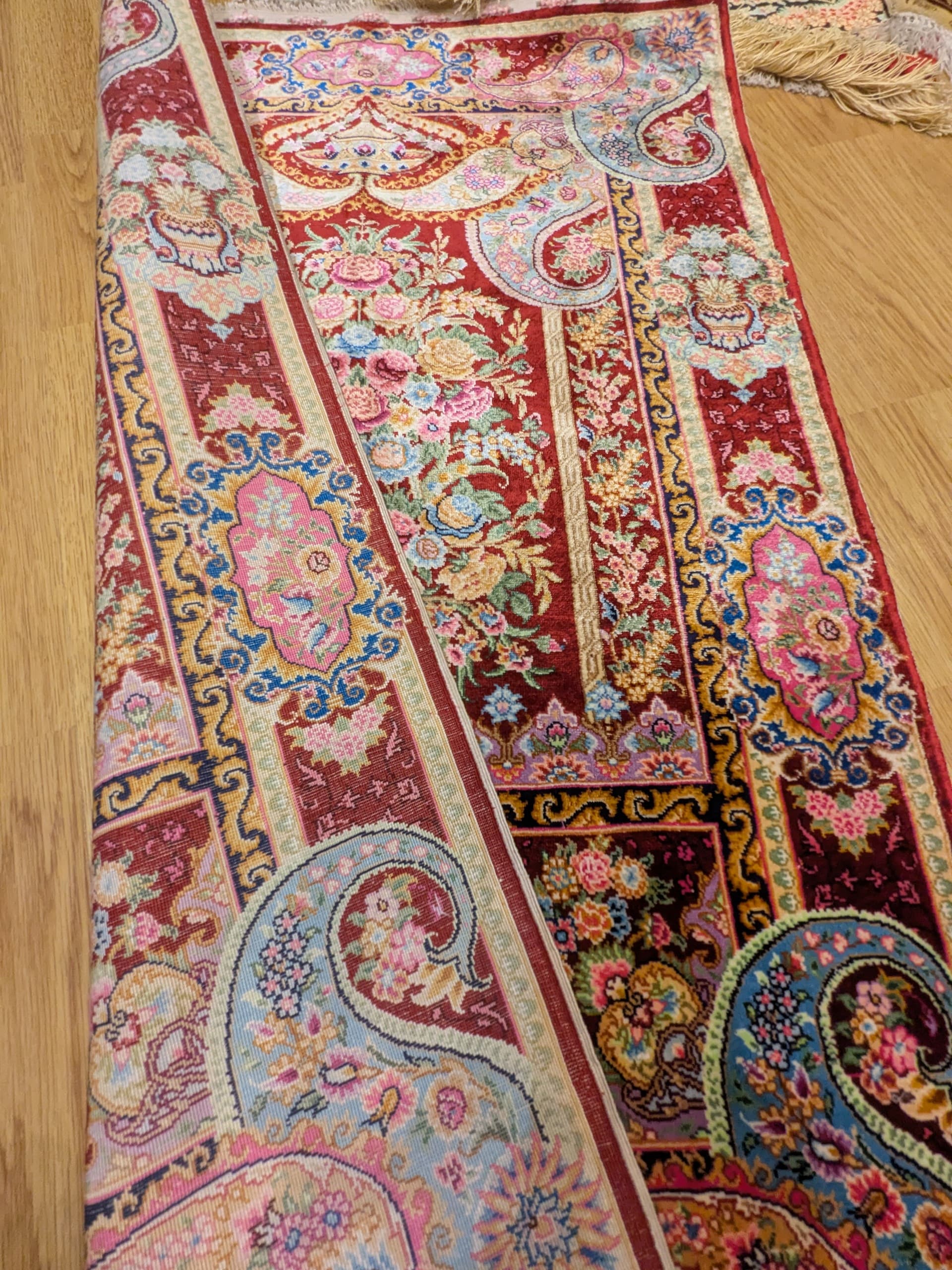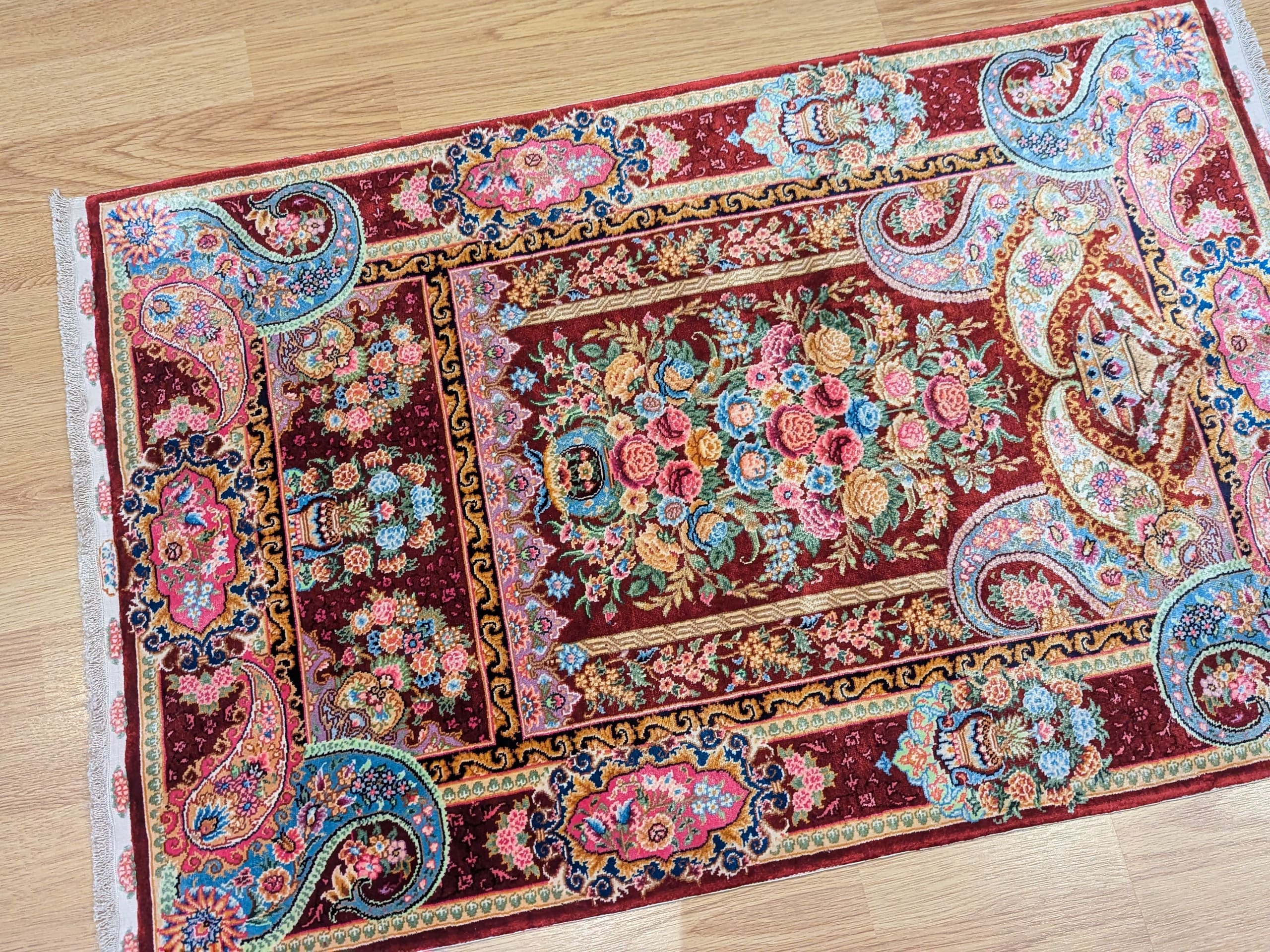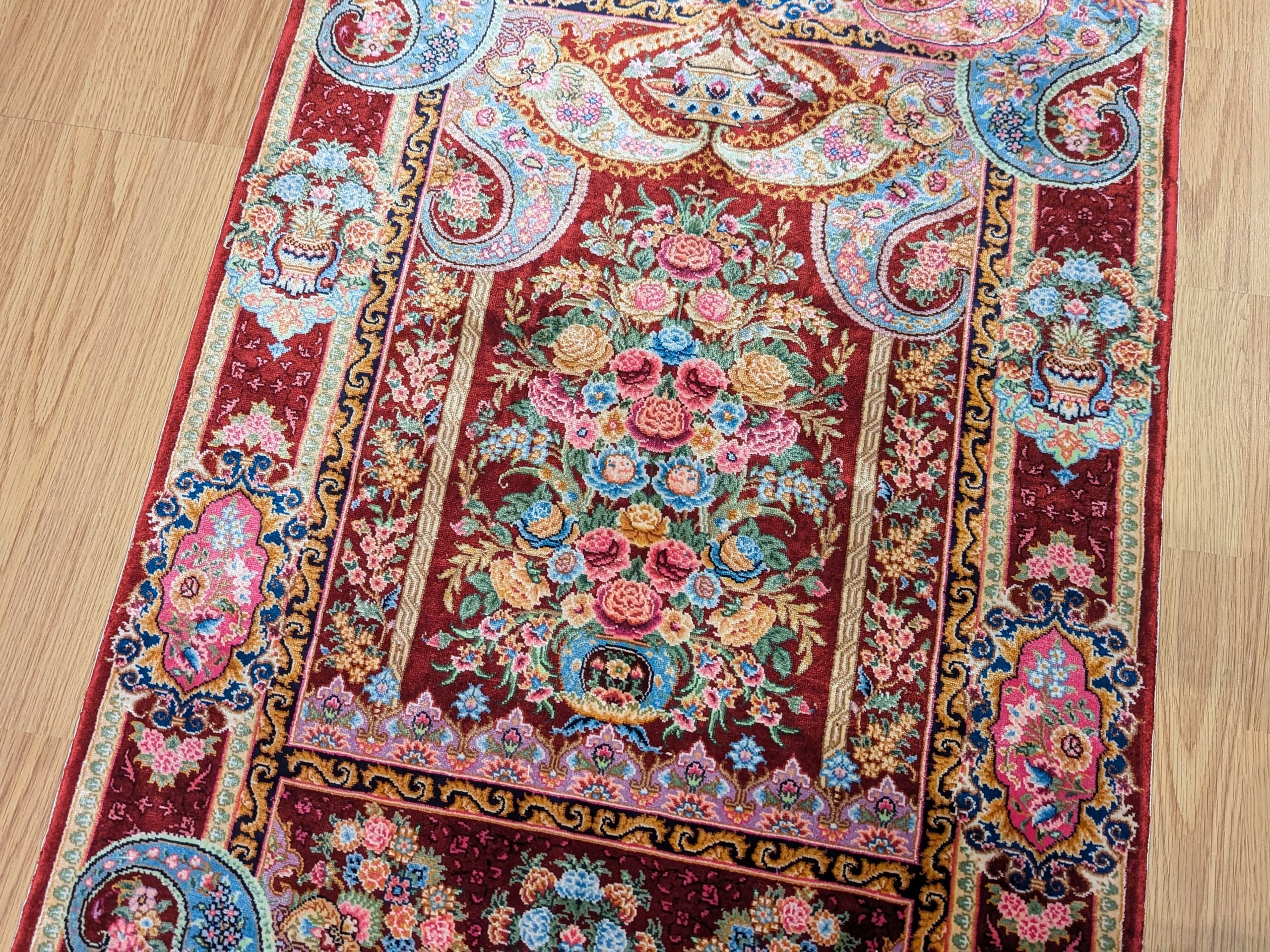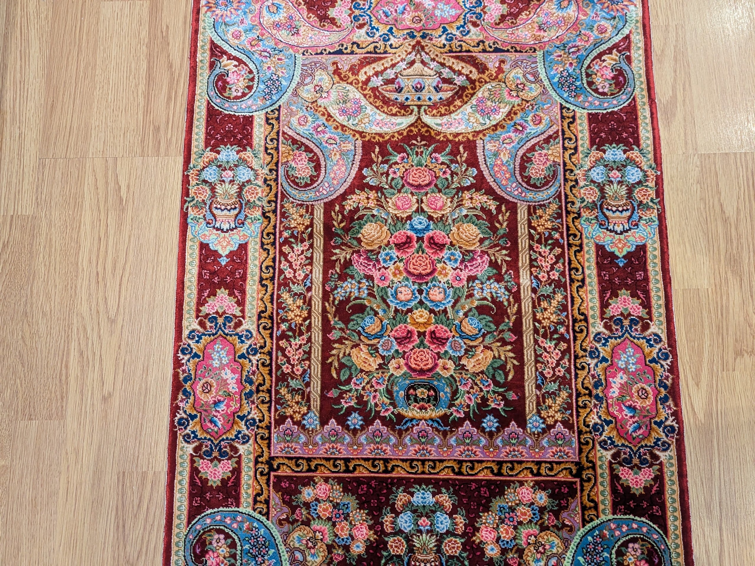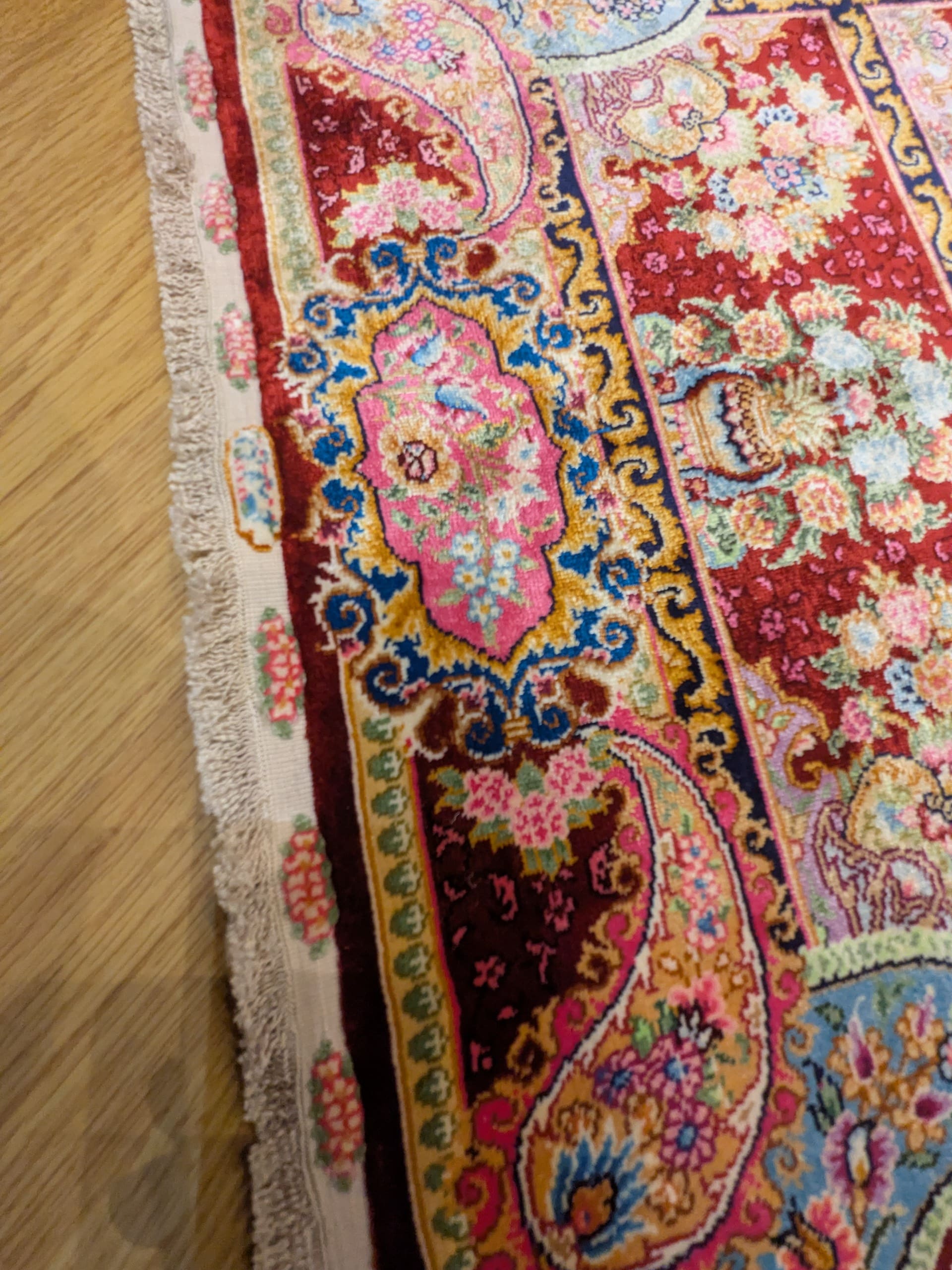 Ce tapis Hereke Chine est un véritable jardin de fleurs figé dans la soie. Son fond rouge intense sert d’écrin à une composition florale symétrique et luxuriante, où les roses, pivoines et autres fleurs stylisées s’épanouissent dans une harmonie de couleurs chatoyantes. La densité du décor et la richesse des ornements en font une pièce précieuse et décorative, idéale pour sublimer un intérieur classique ou raffiné.