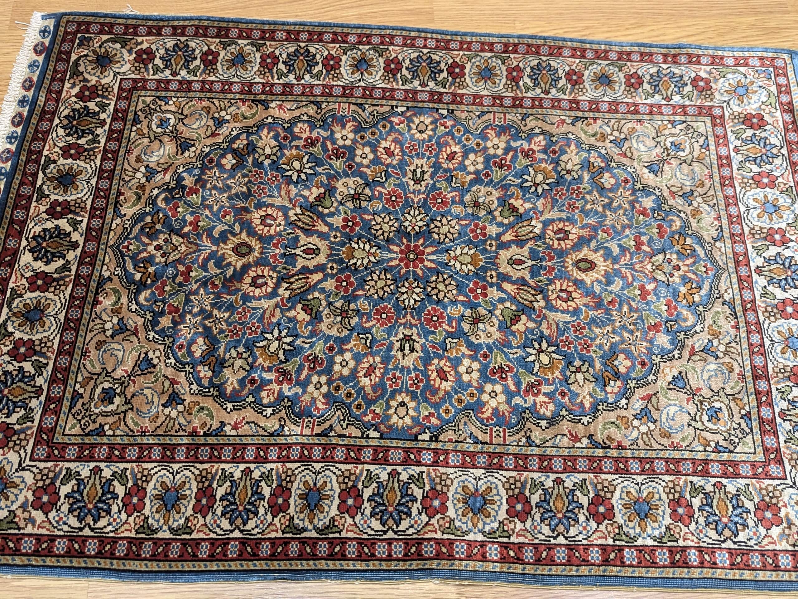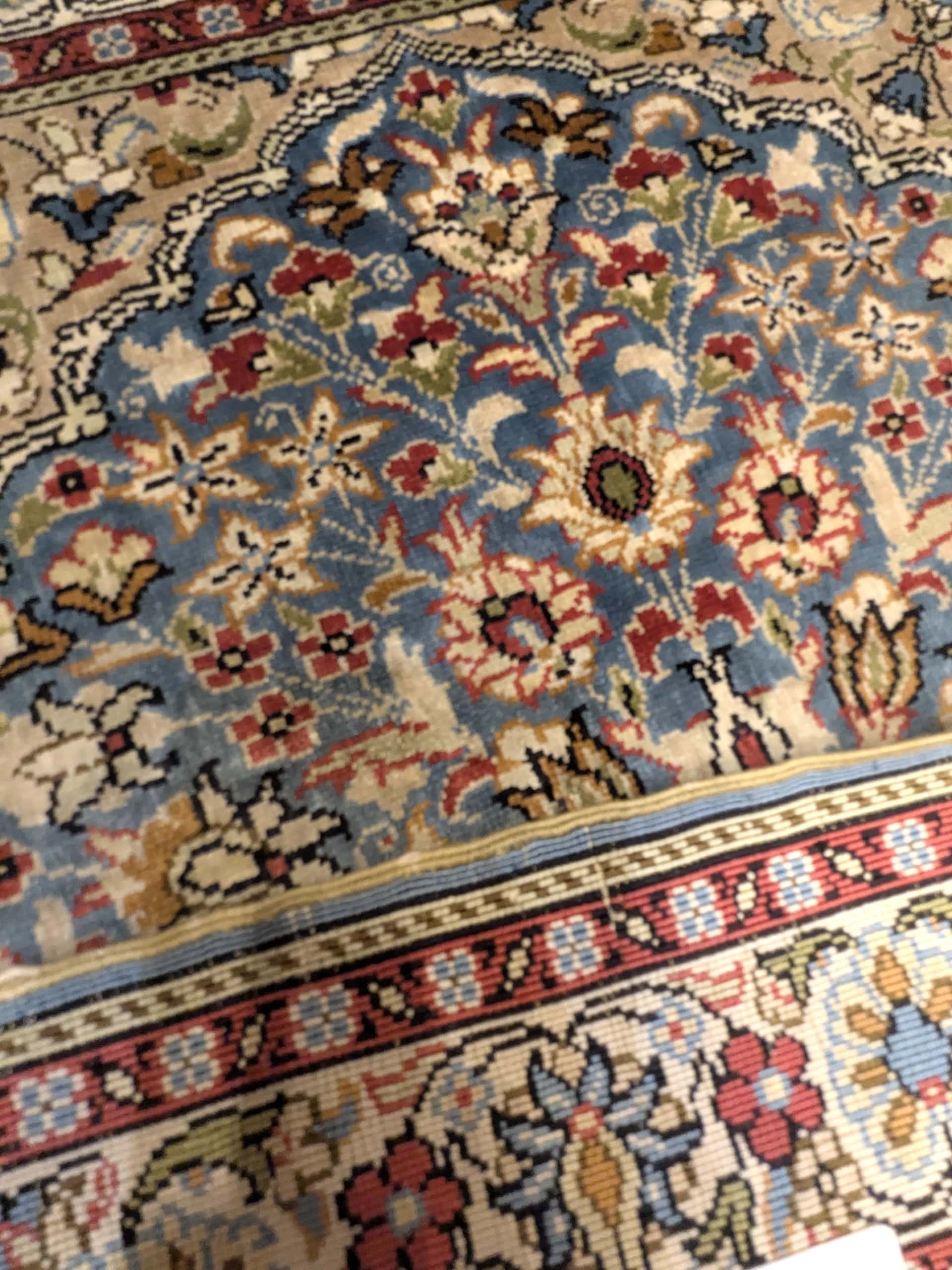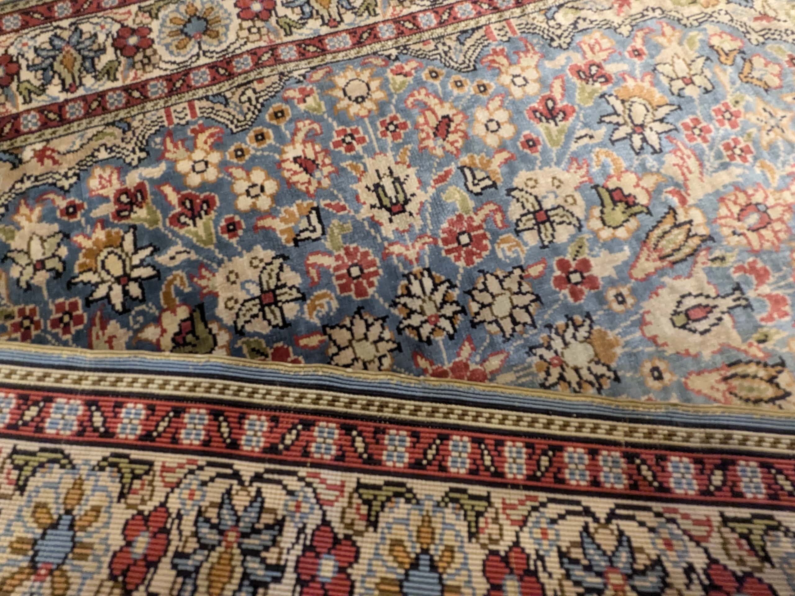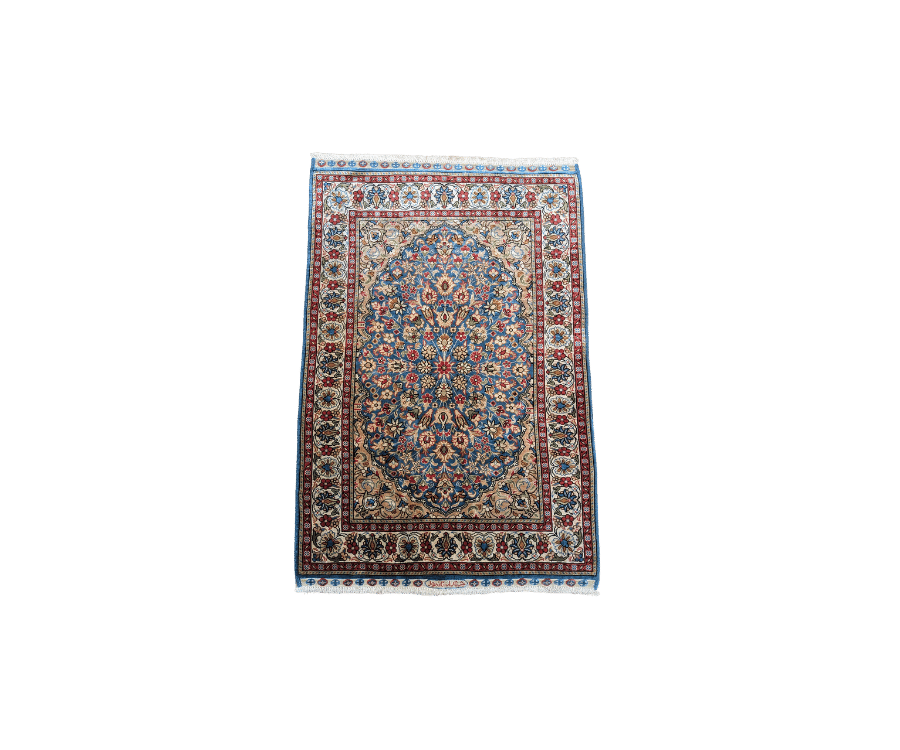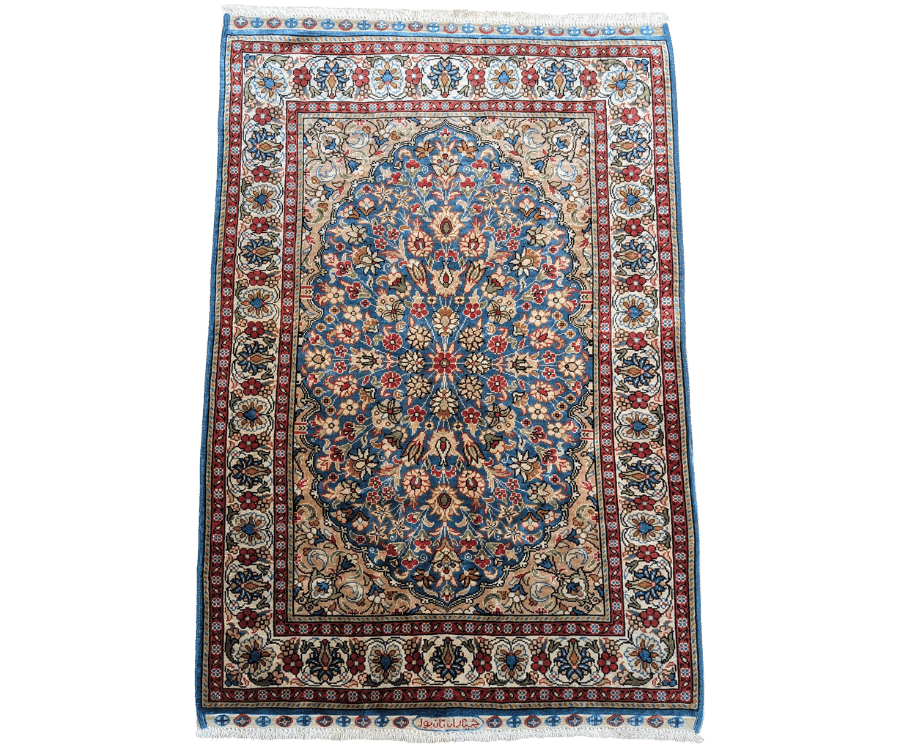 • Une palette riche et profonde : Le bleu dominant s’accompagne de nuances ivoire, brique et beige, conférant au tapis une aura noble et chaleureuse.