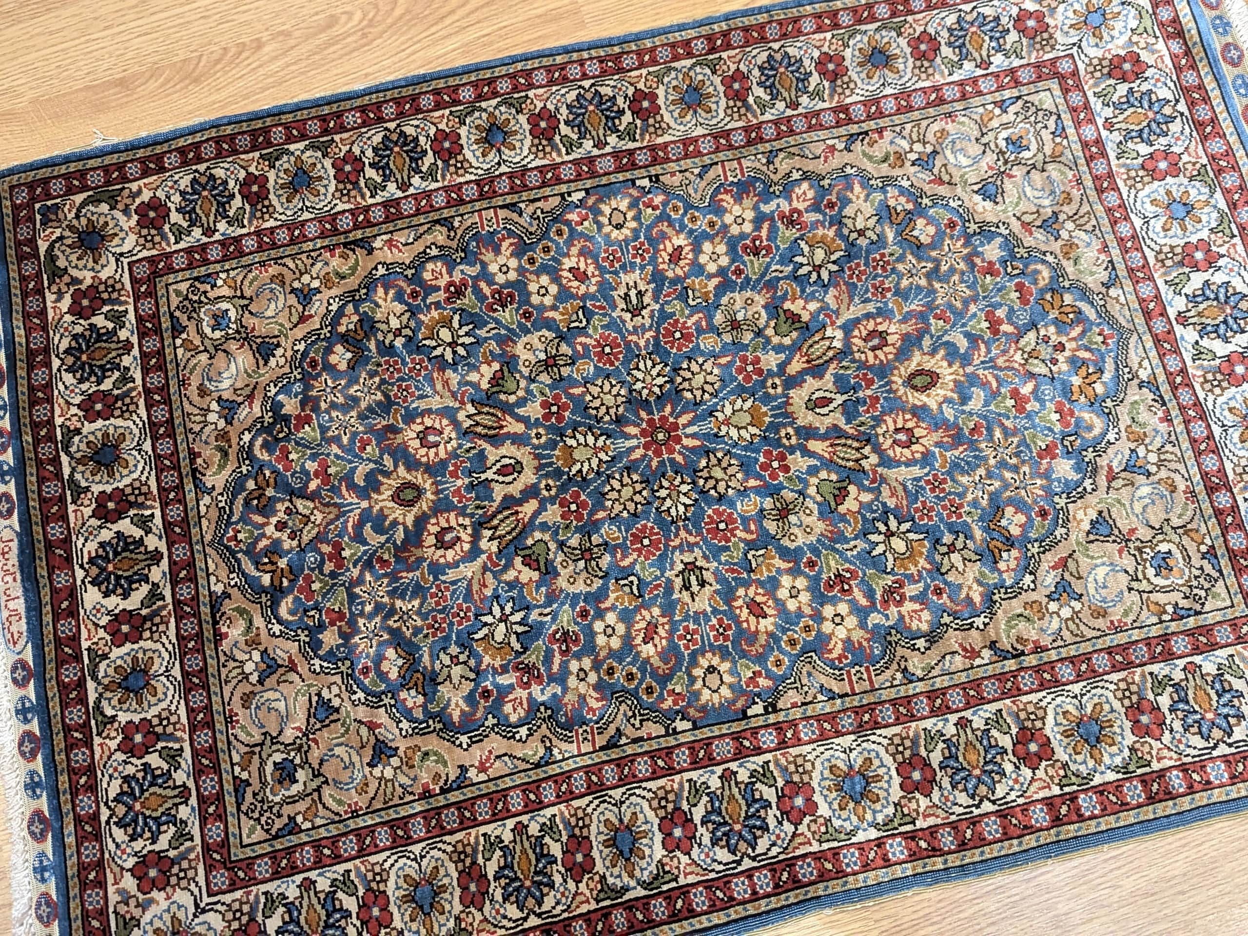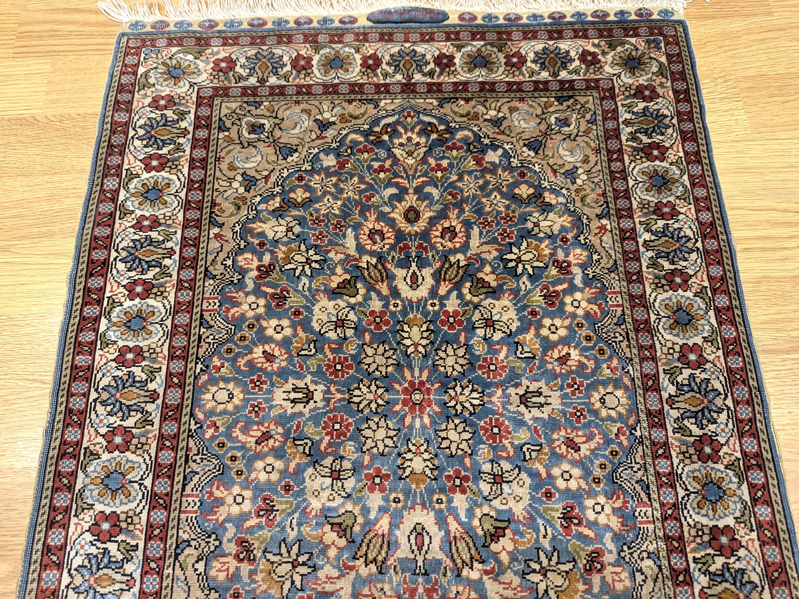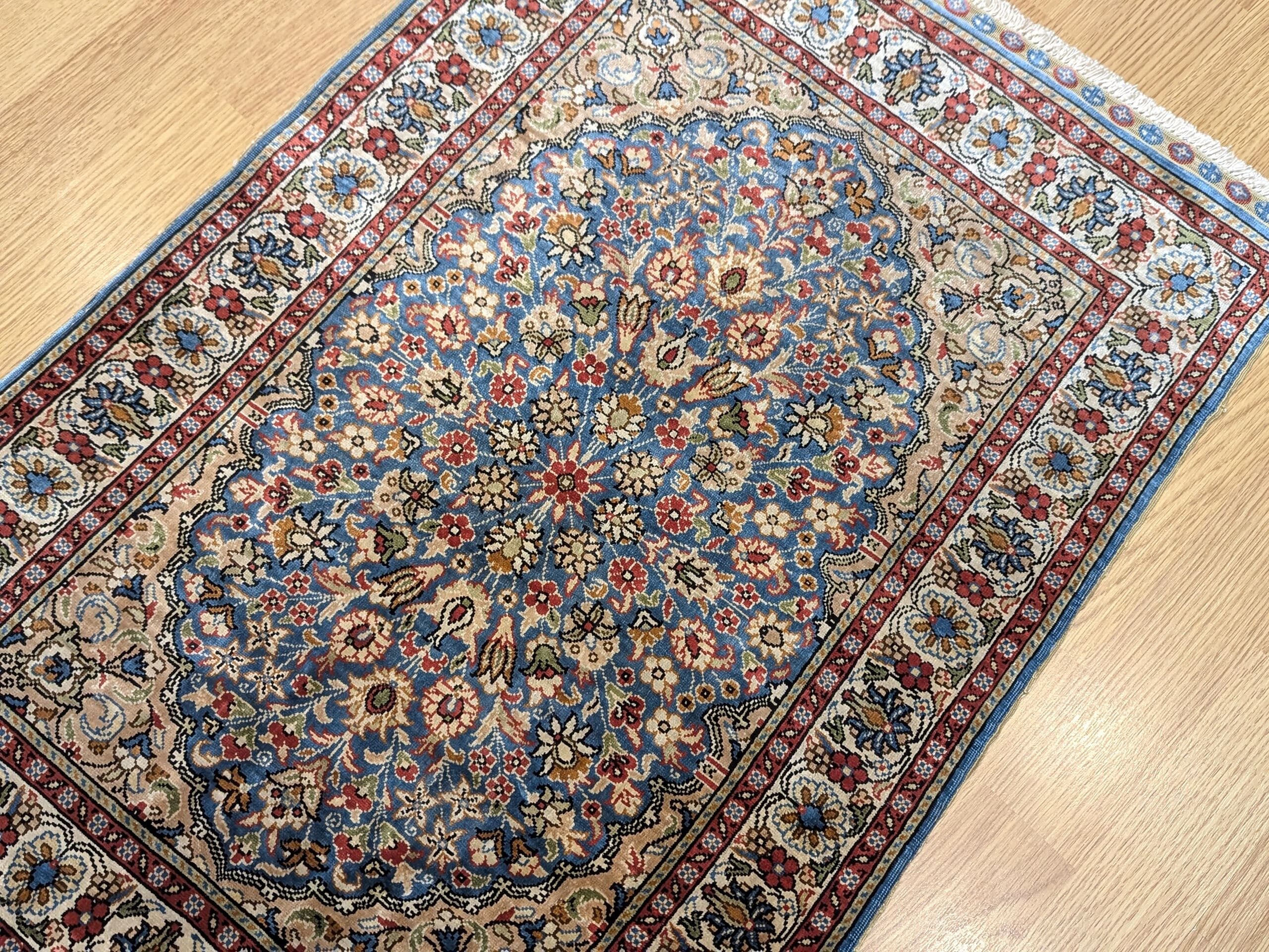 Ce tapis Hereke, noué à la main en Turquie, est une pièce précieuse au style impérial. Son champ bleu est animé par un grand médaillon floral central, encadré par une bordure ivoire ornée de bouquets finement dessinés. Ce format compact offre une richesse décorative saisissante, caractéristique des Hereke traditionnels.