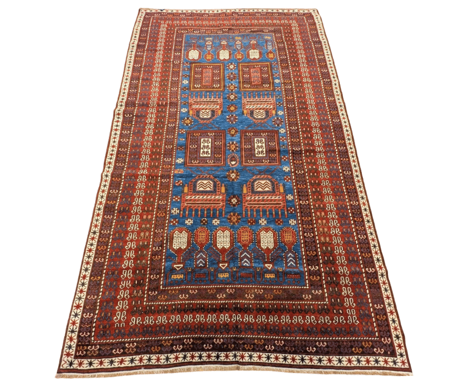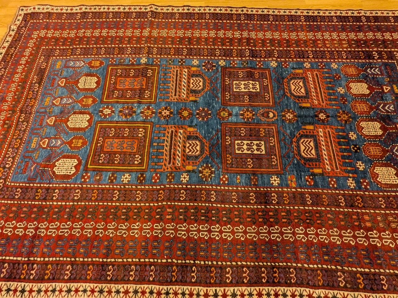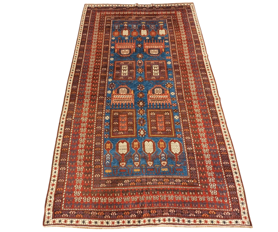 Ce tapis caucasien au champ rouge profond présente une composition particulièrement dynamique, caractérisée par une profusion de motifs géométriques disposés avec régularité. Sa structure dense et équilibrée reflète la richesse décorative typique des tapis de cette région, où chaque détail est pensé pour créer un impact visuel fort. Entièrement noué à la main, il incarne un savoir-faire traditionnel transmis à travers les générations.