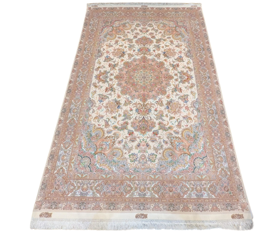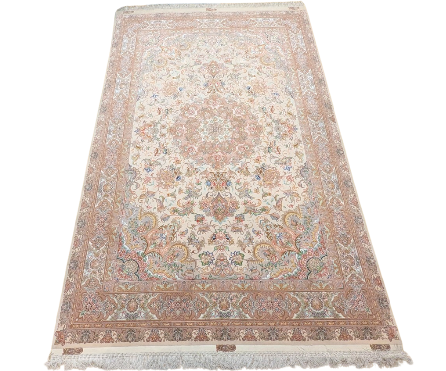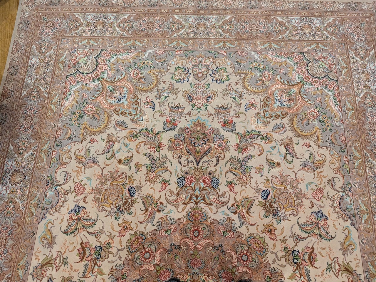 Ce tapis Tabriz noué à la main séduit par sa composition florale dense et raffinée, centrée autour d’un majestueux médaillon. Le fond beige clair, associé à une palette délicate de roses poudrés, verts d’eau et touches bleutées, apporte une atmosphère douce et lumineuse. Chaque motif s’enchevêtre avec précision dans un équilibre parfait entre tradition persane et élégance décorative.