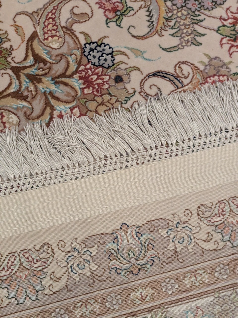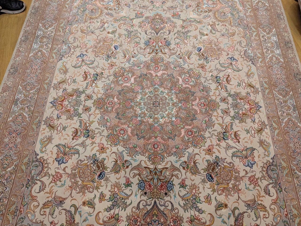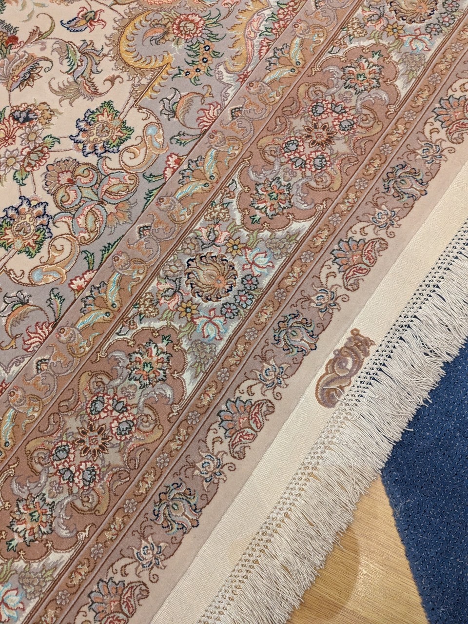 Ce tapis Tabriz est une pièce artisanale de haute qualité, alliant équilibre décoratif et raffinement chromatique. Il s’inscrit comme une valeur sûre pour embellir un intérieur tout en douceur.