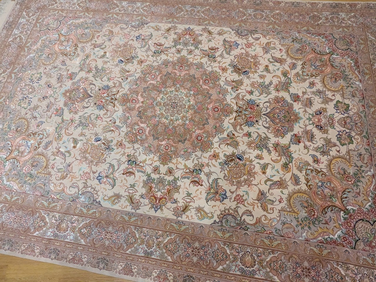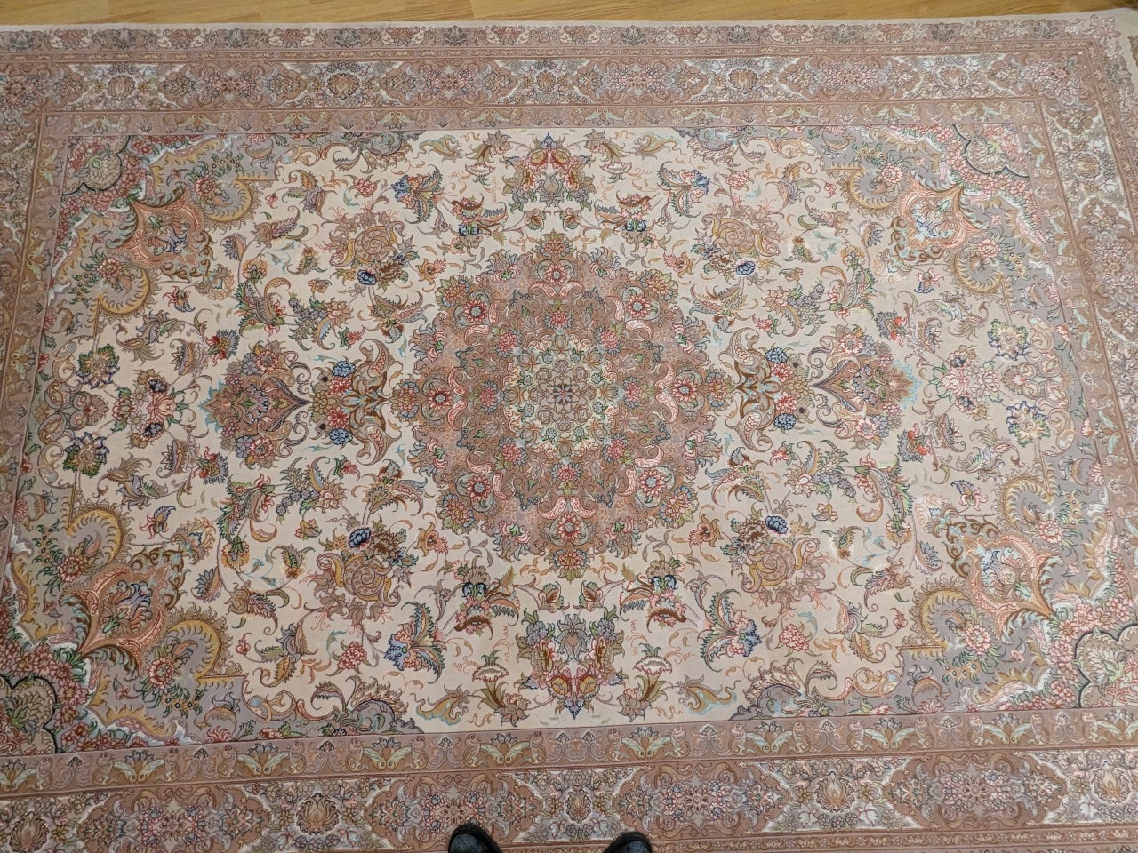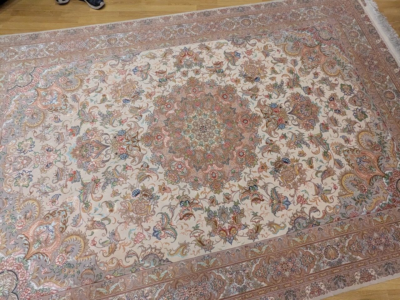 Ce tapis Tabriz est une pièce artisanale de haute qualité, alliant équilibre décoratif et raffinement chromatique. Il s’inscrit comme une valeur sûre pour embellir un intérieur tout en douceur.