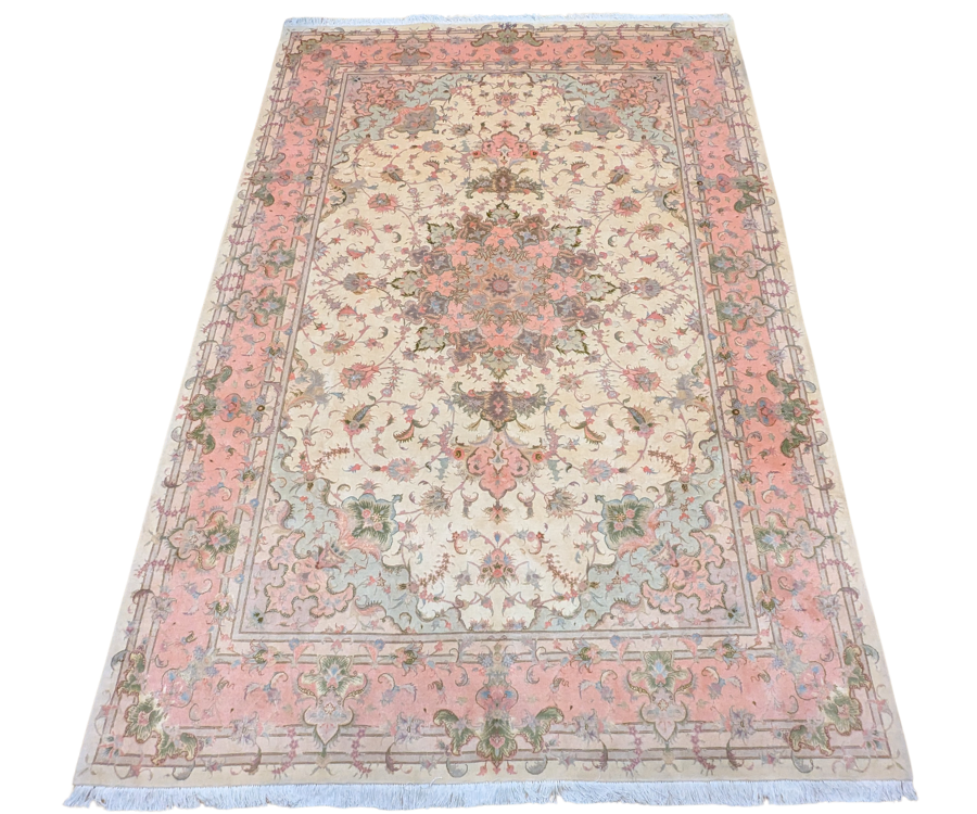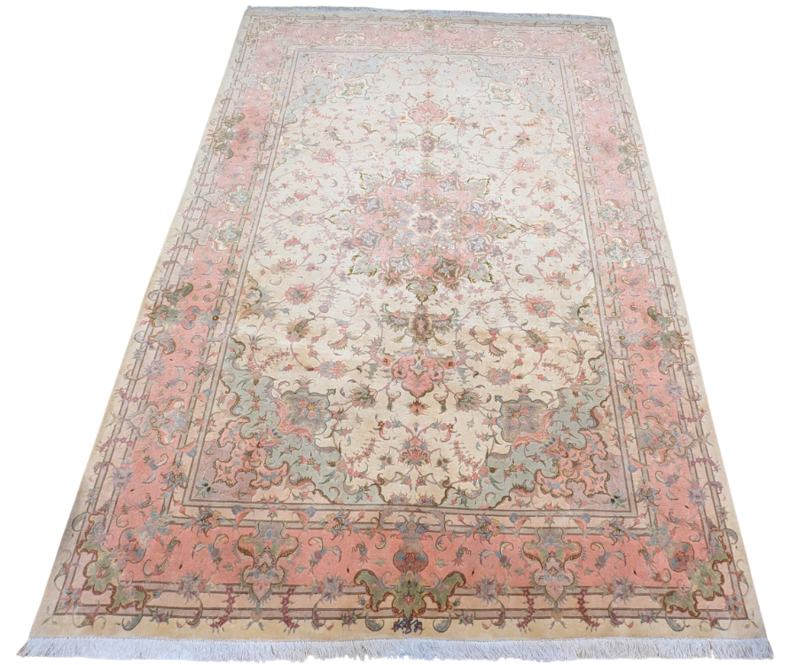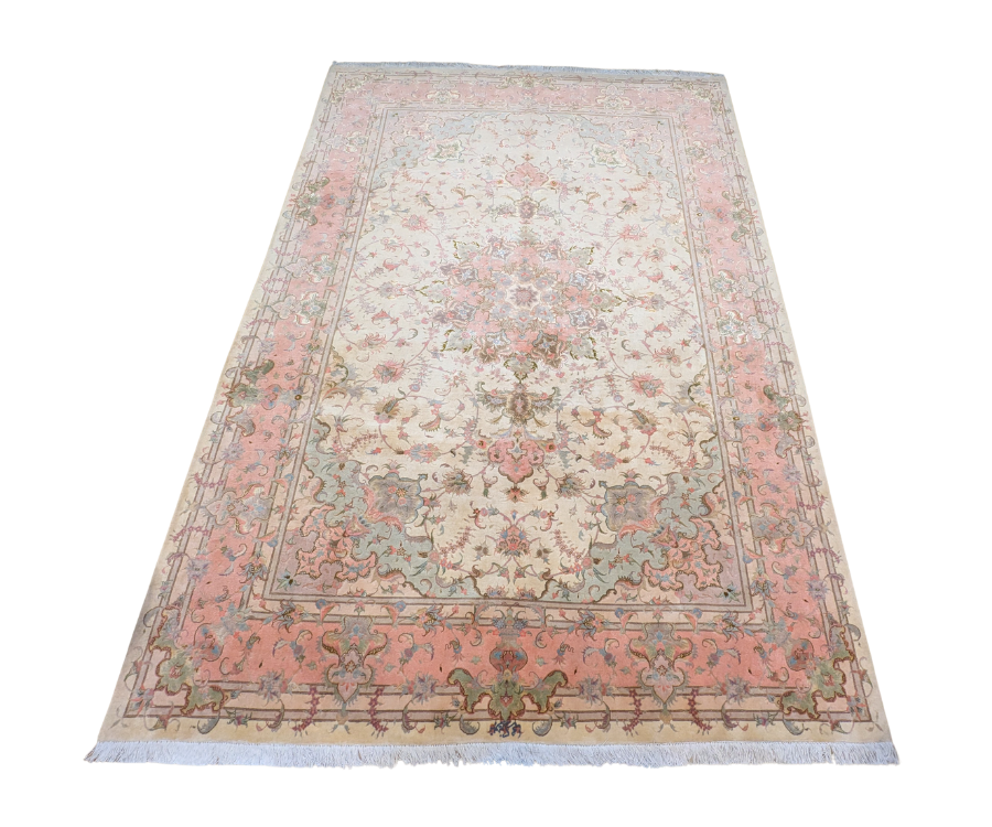 Ce tapis Tabriz, noué à la main en Iran, est une véritable œuvre d’art aux teintes poudrées et subtiles. Son champ beige lumineux est orné d’un médaillon central floral parfaitement symétrique, entouré de volutes végétales délicates. Les nuances pastel de rose, vert amande et bleu ciel évoquent une élégance raffinée, propre aux plus belles créations persanes.