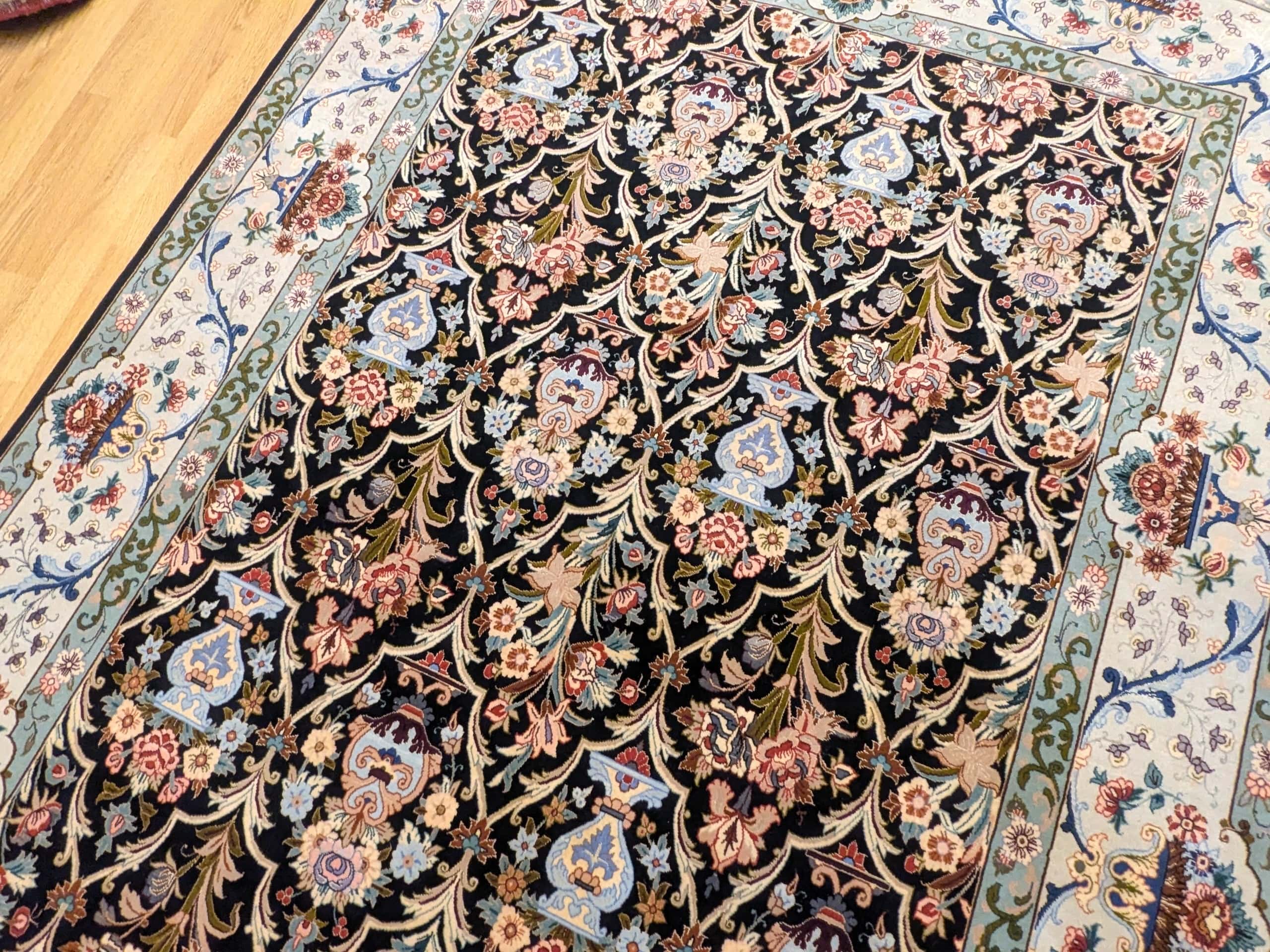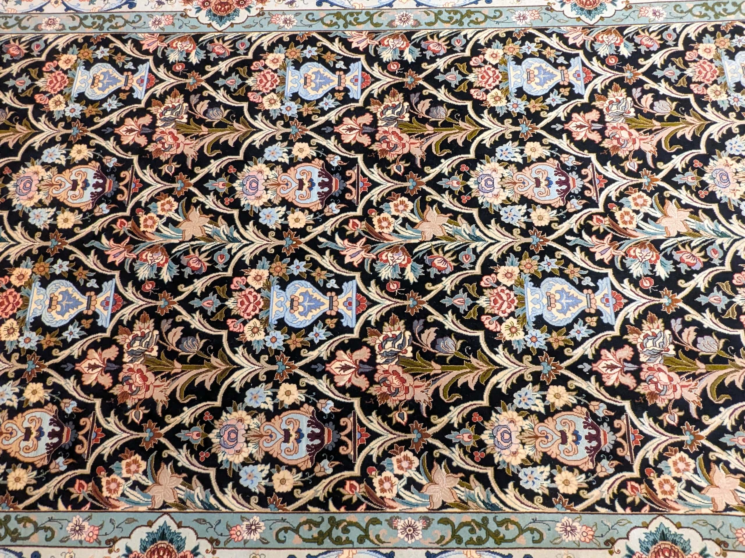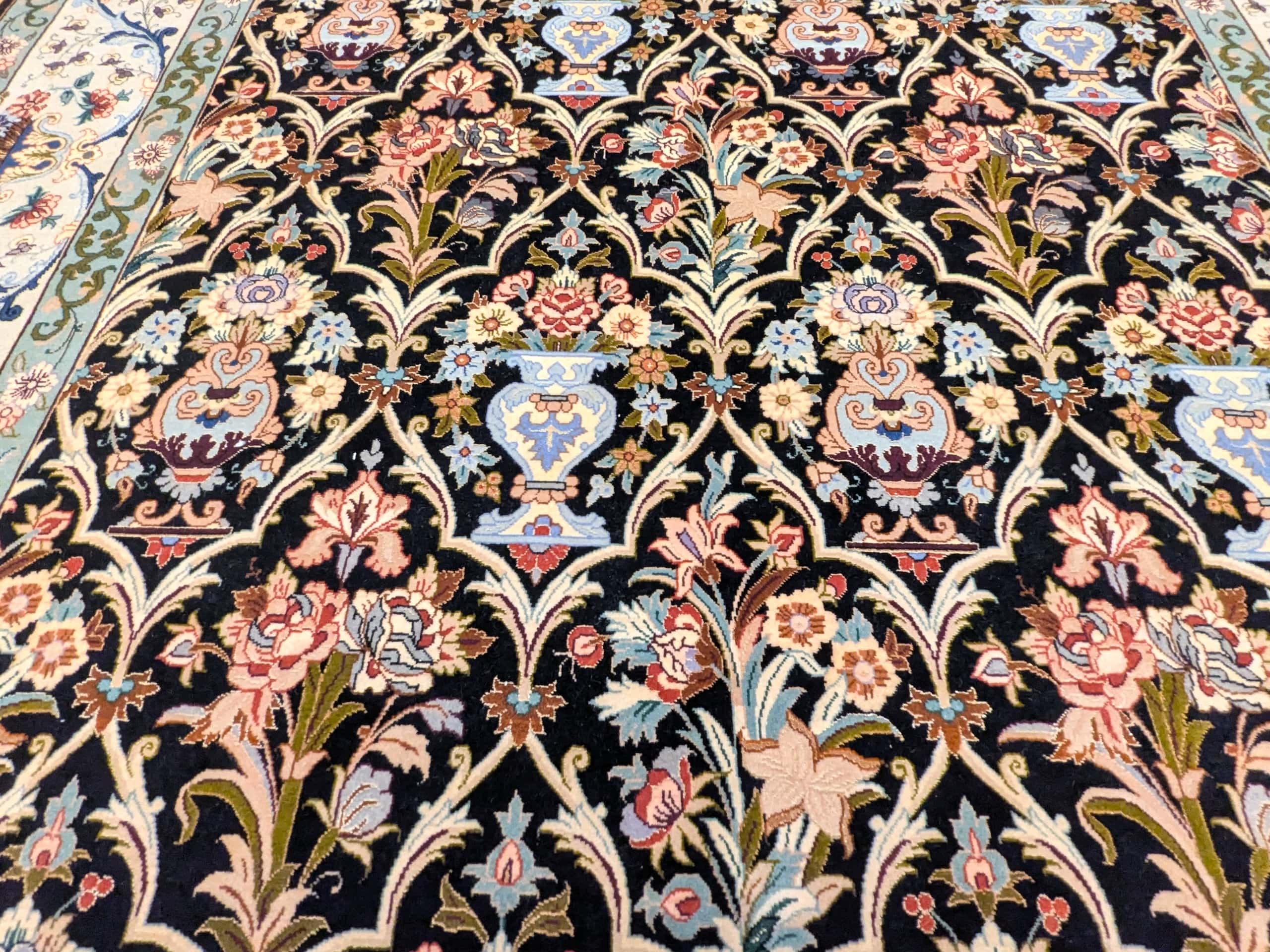 • Un chef-d’œuvre de complexité : Les arabesques florales et les vases stylisés révèlent un travail d’orfèvre, fidèle à la tradition d’Ispahan.