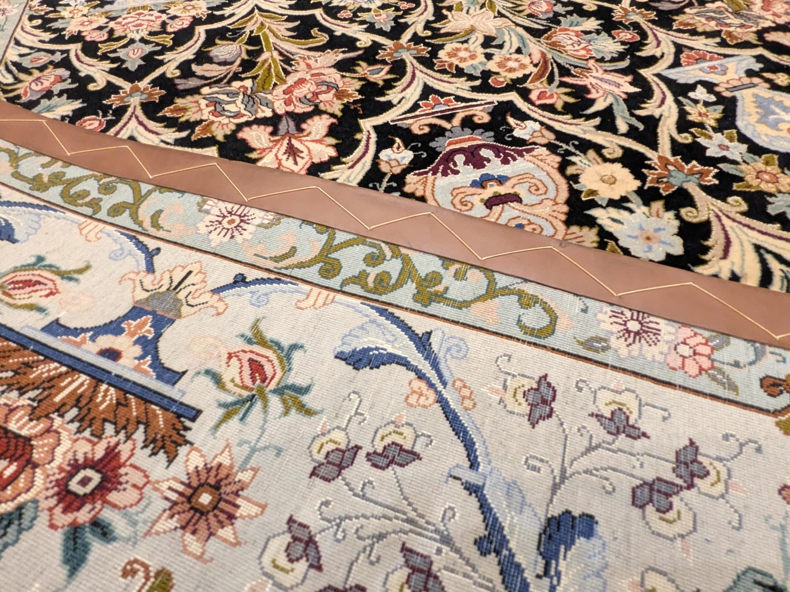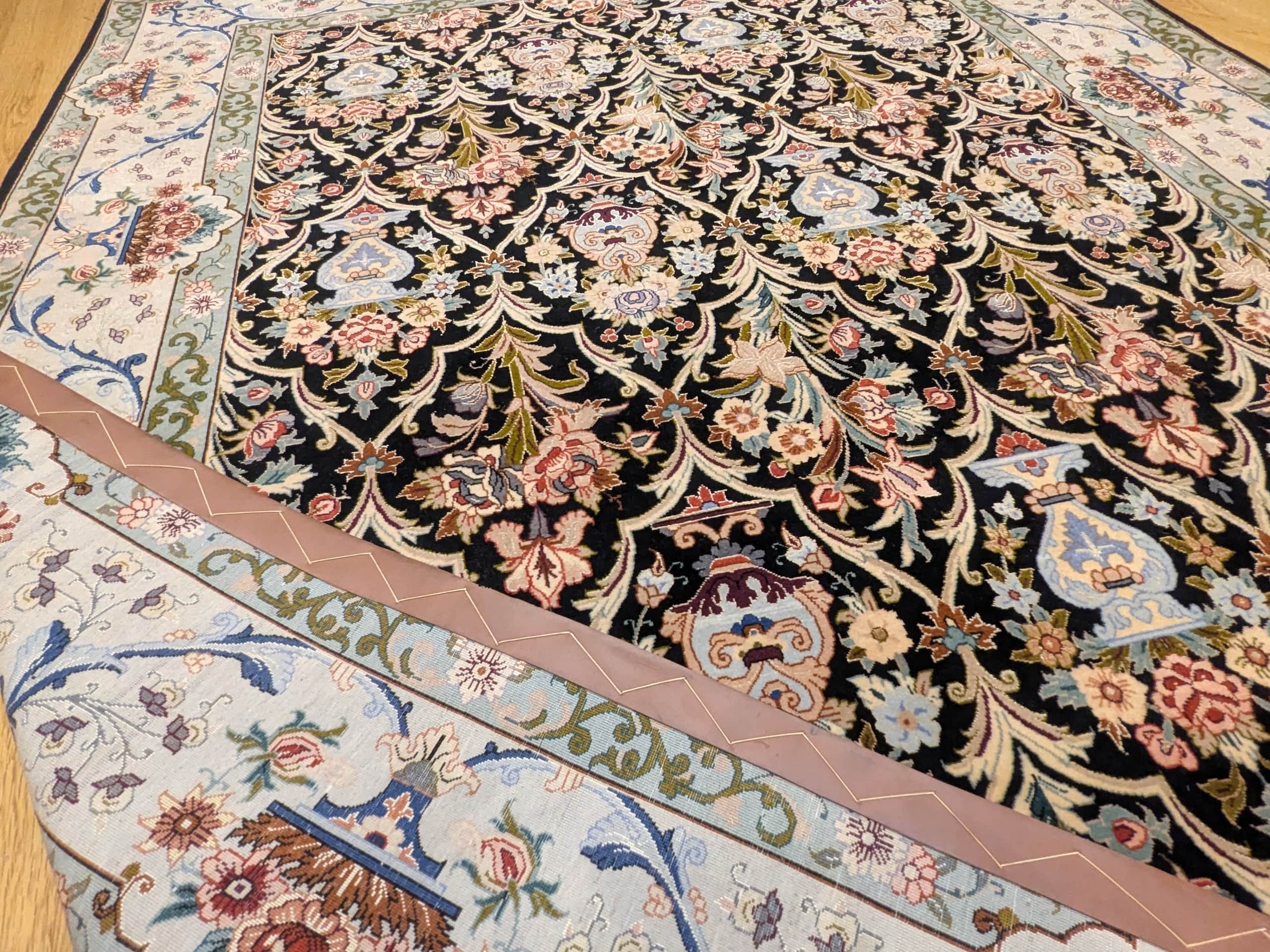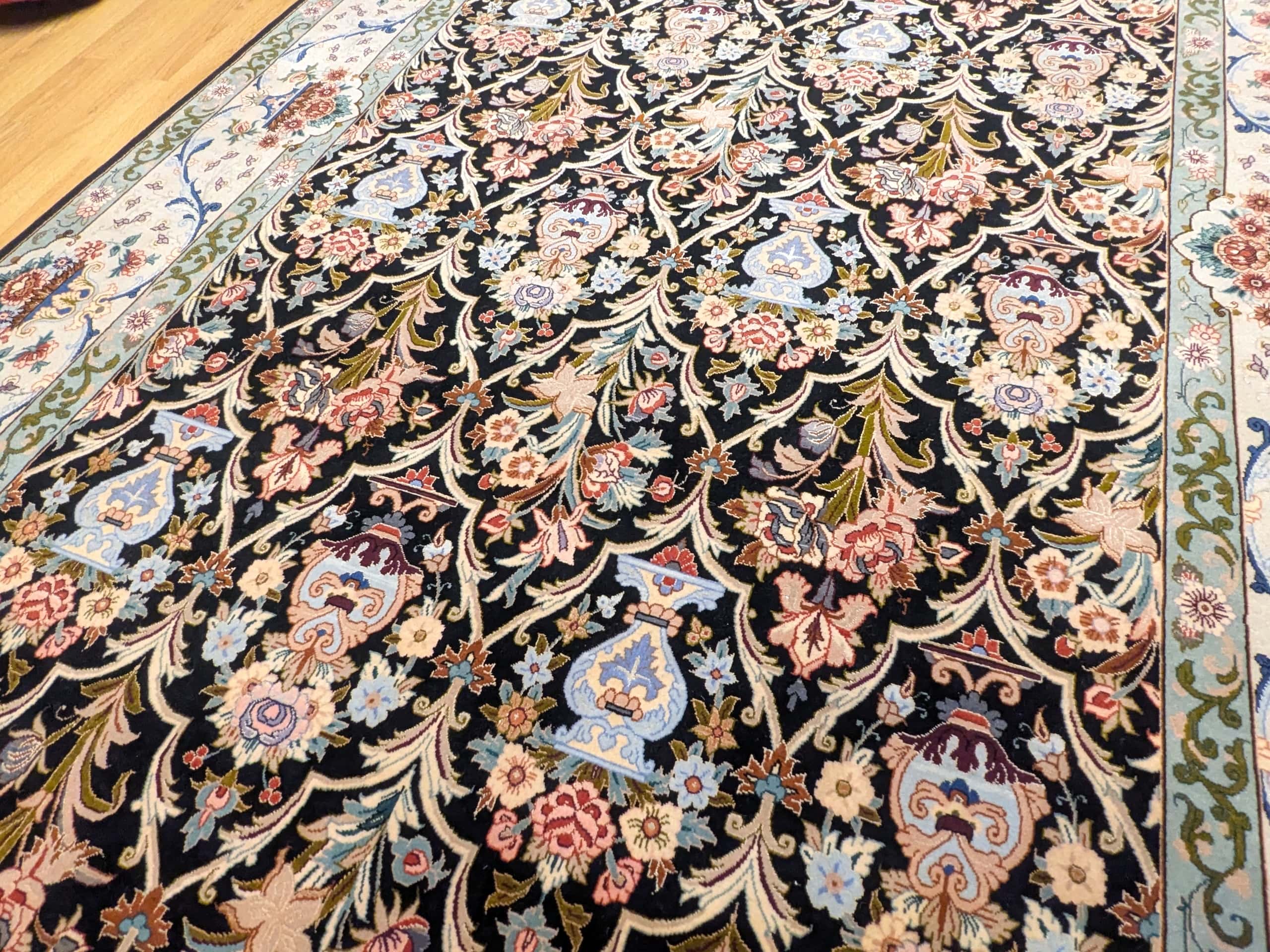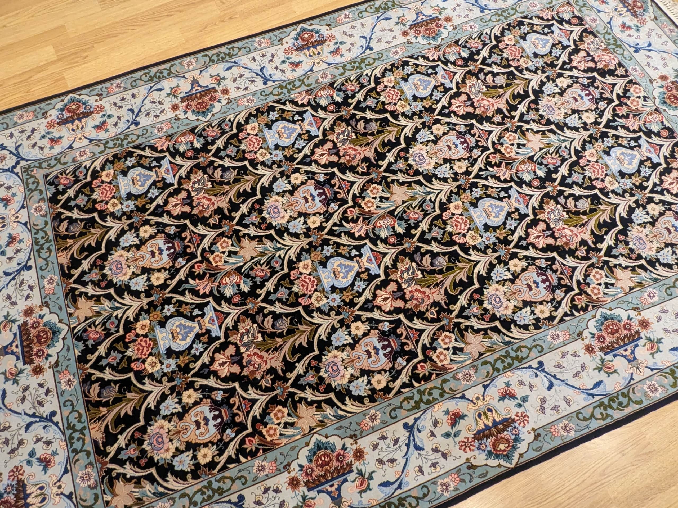 • Un chef-d’œuvre de complexité : Les arabesques florales et les vases stylisés révèlent un travail d’orfèvre, fidèle à la tradition d’Ispahan.