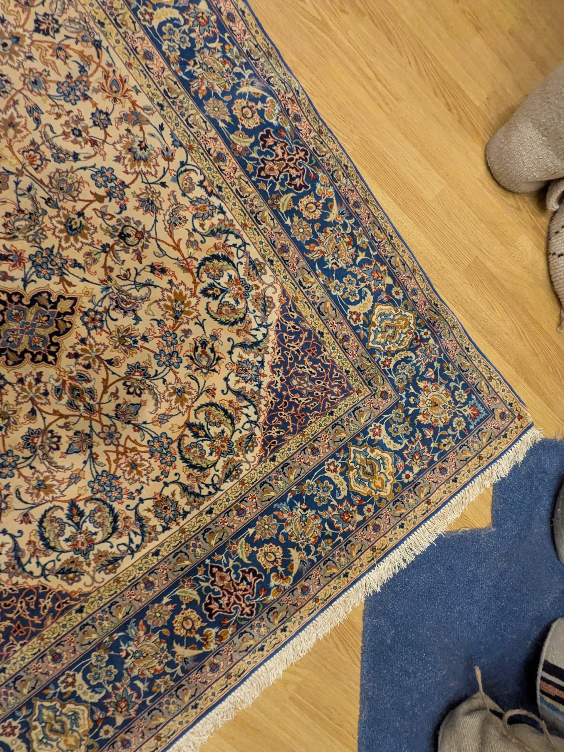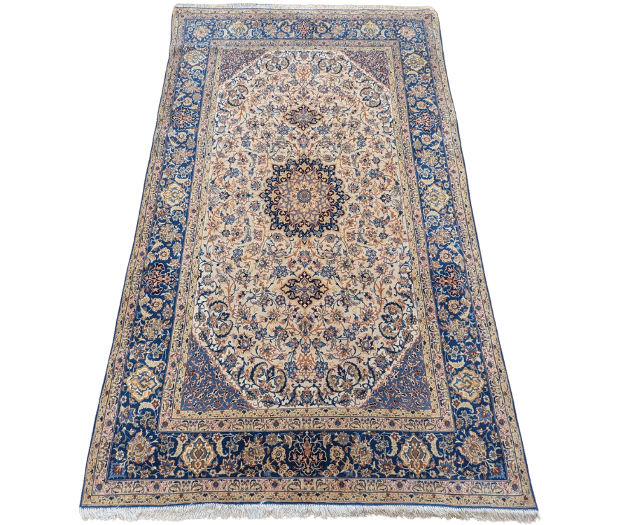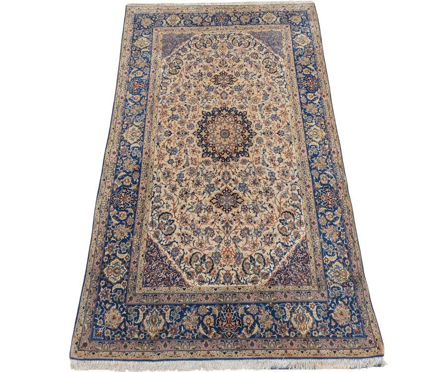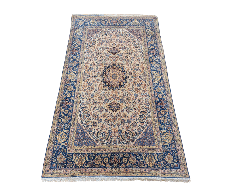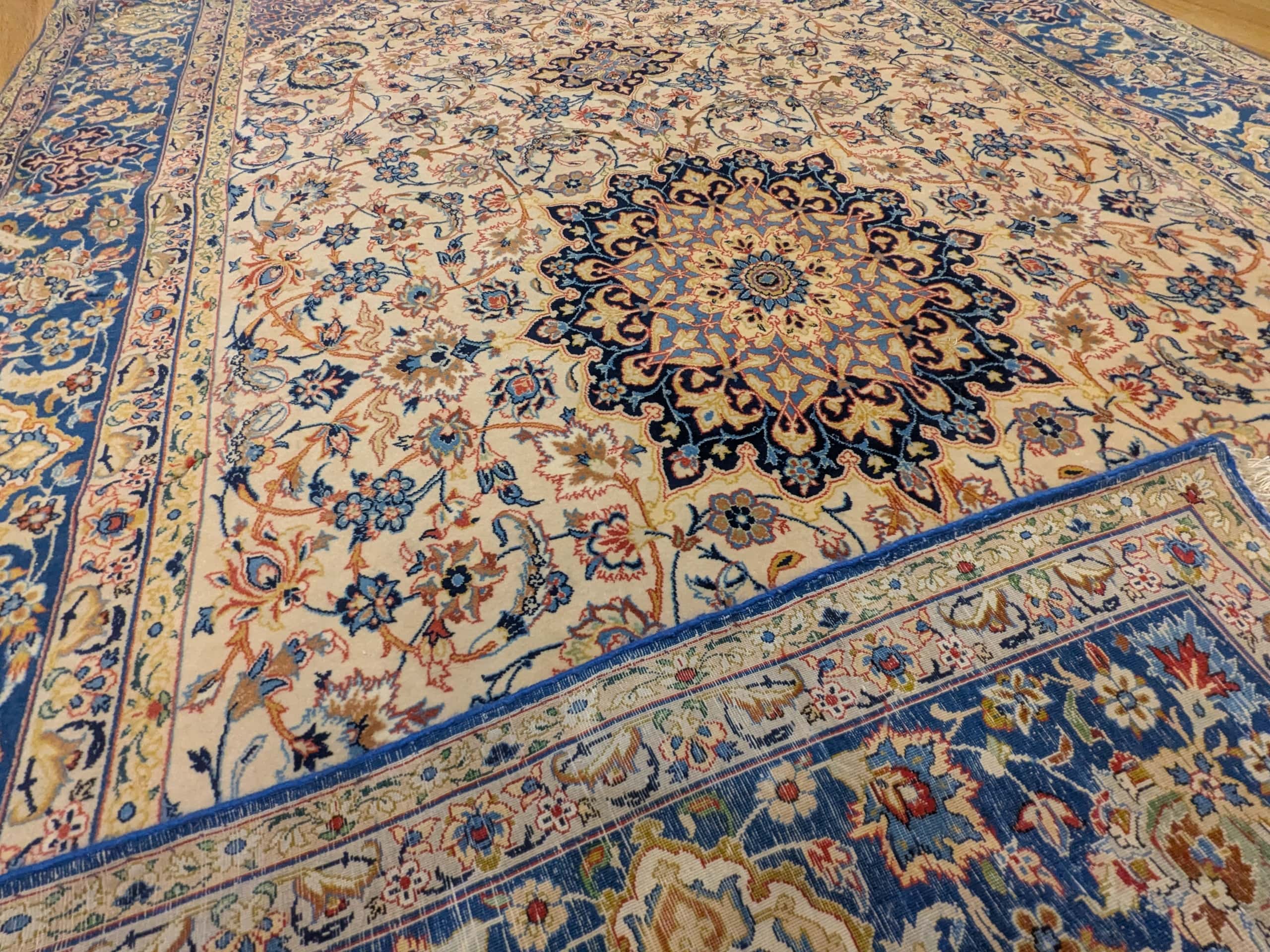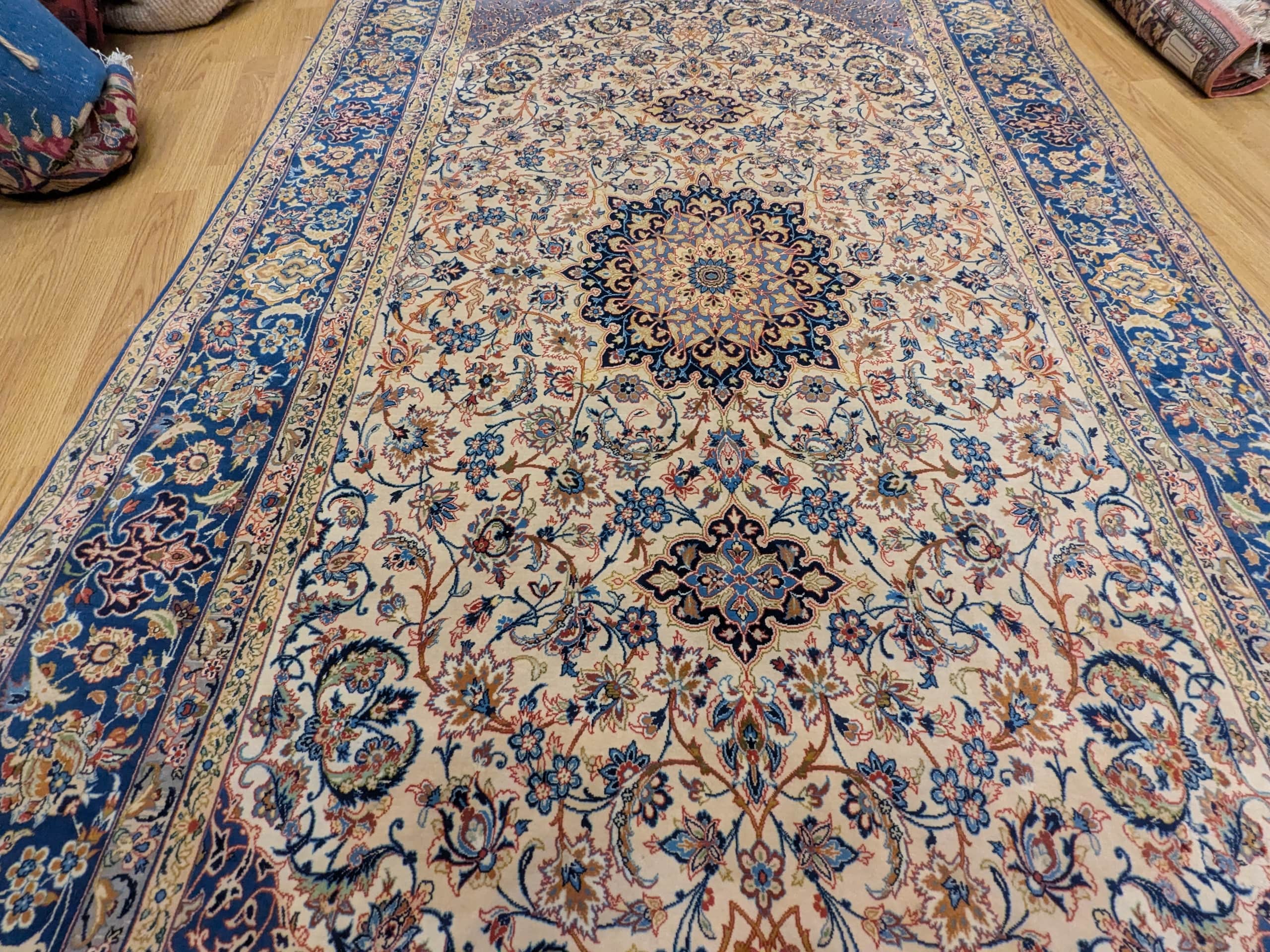 Ce tapis d’Ispahan, haut lieu du tissage iranien, incarne l’excellence artisanale persane. Le champ beige clair est orné d’un médaillon central d’une grande finesse, entouré de motifs floraux stylisés aux teintes bleu ciel, marine et brique. Les bordures, particulièrement raffinées, apportent un encadrement noble à cette composition équilibrée et lumineuse.