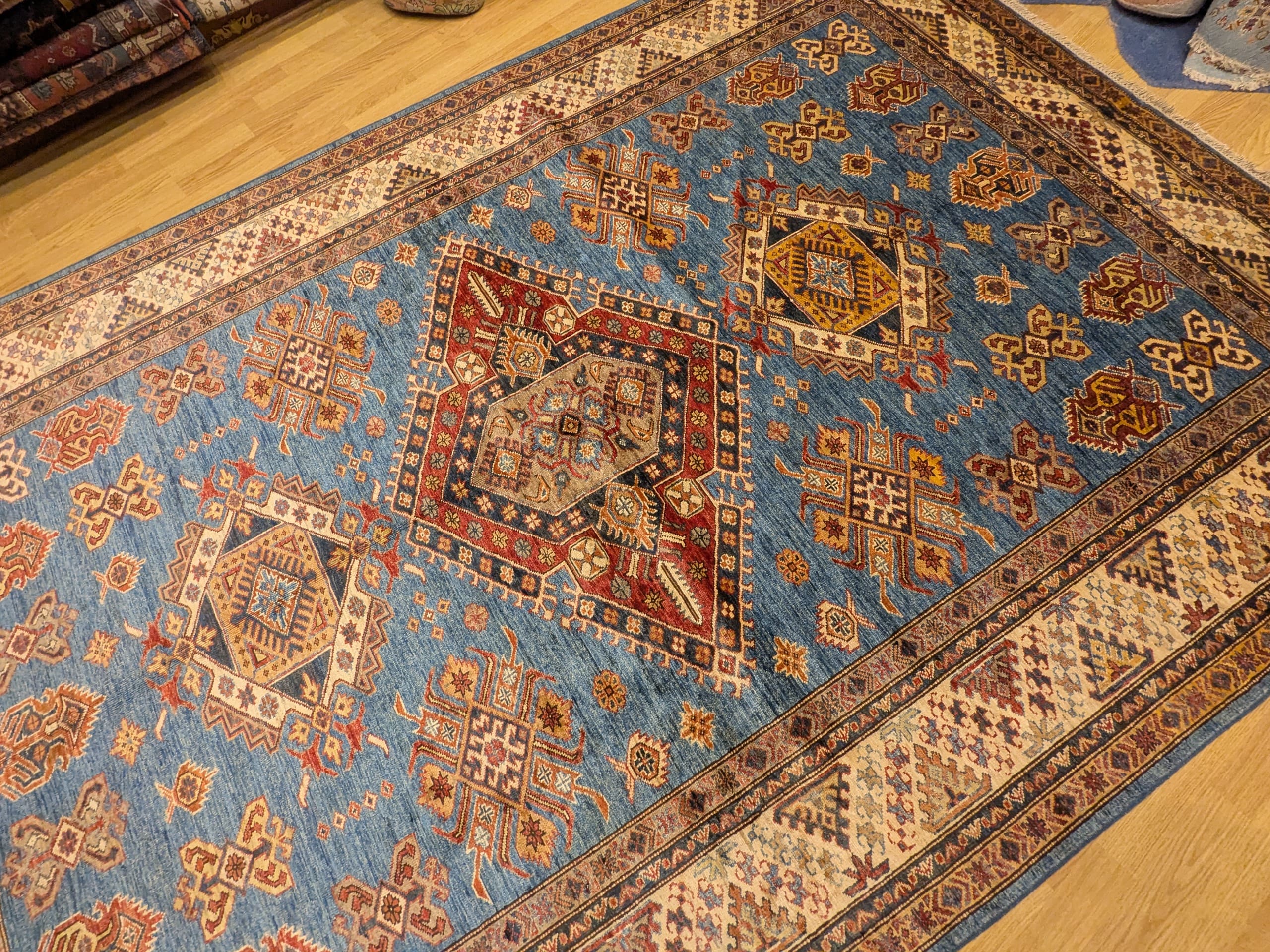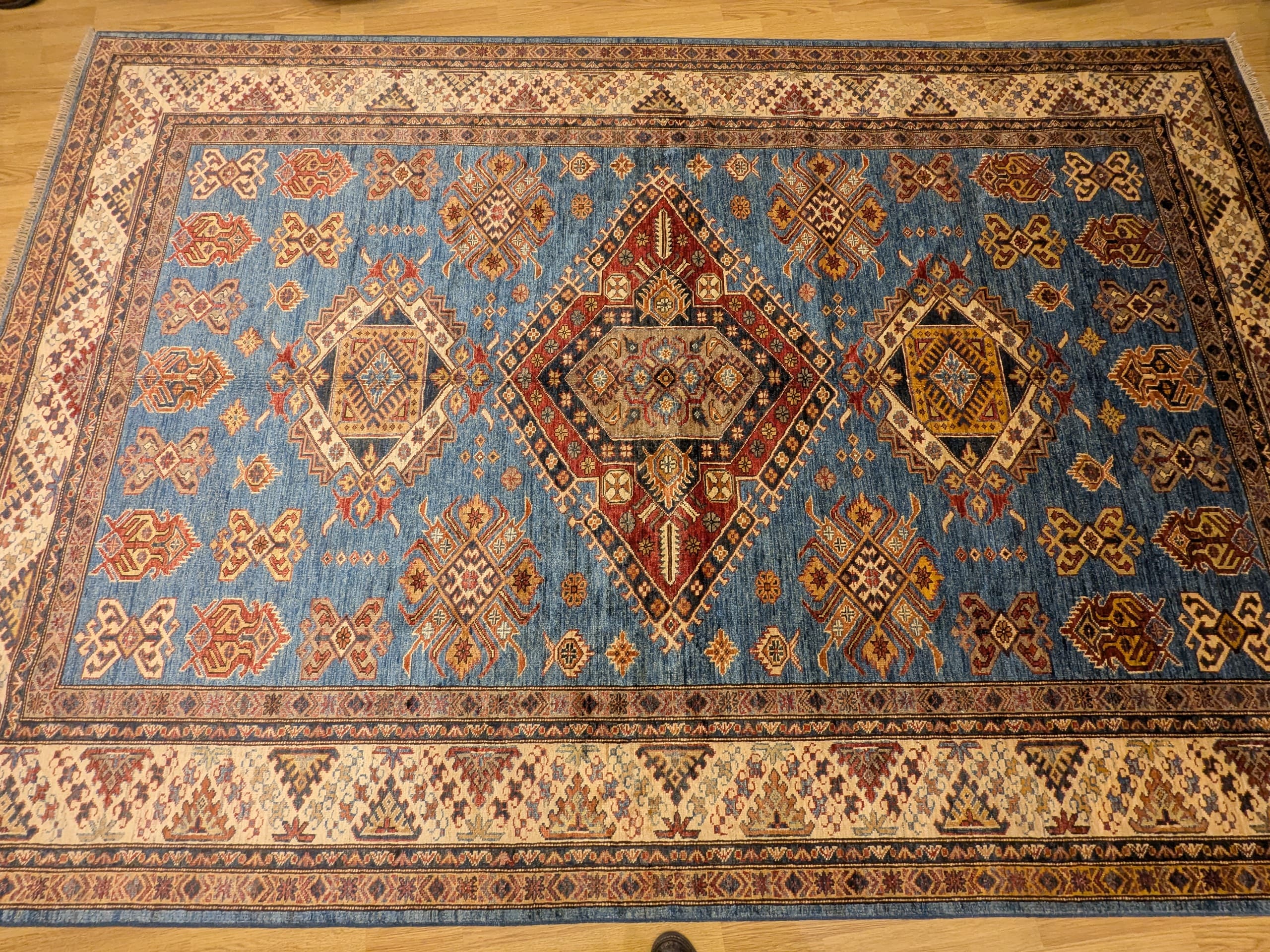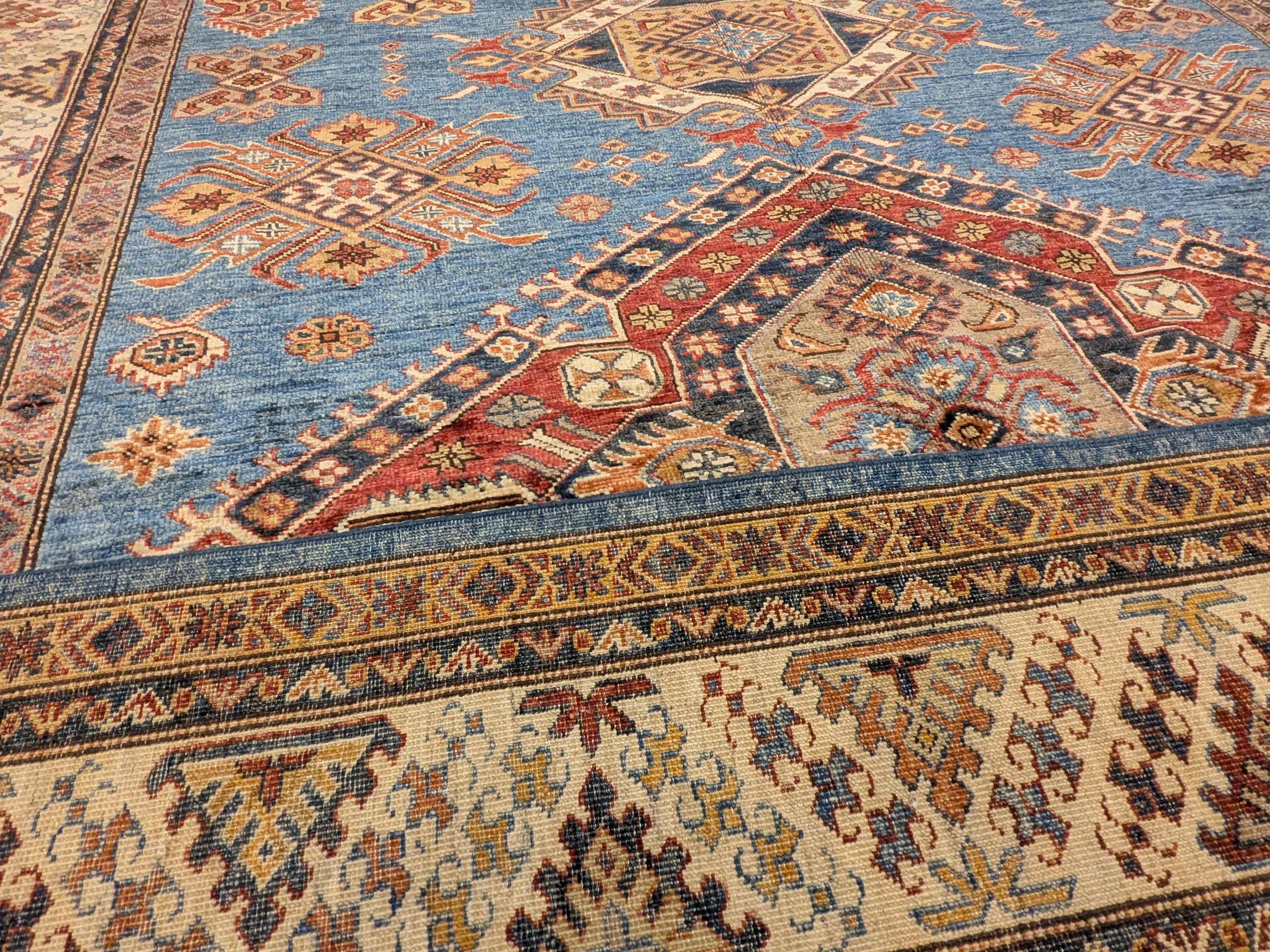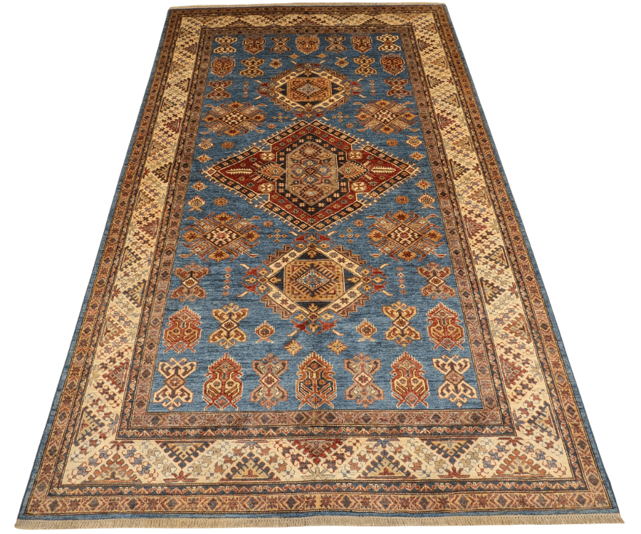 Ce tapis Kazak, noué à la main en Afghanistan, présente un fond bleu lumineux mettant en valeur un enchaînement de médaillons géométriques traditionnels. Sa composition s’articule autour de trois grands médaillons, accompagnés d’une multitude de symboles secondaires aux formes anguleuses, typiques des tapis caucasiens. La bordure crème ornée de motifs en diagonale complète le tout avec élégance.