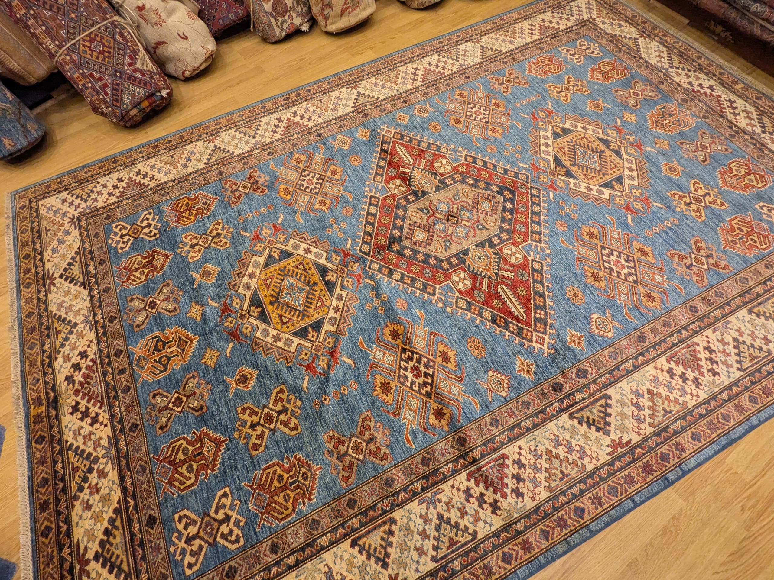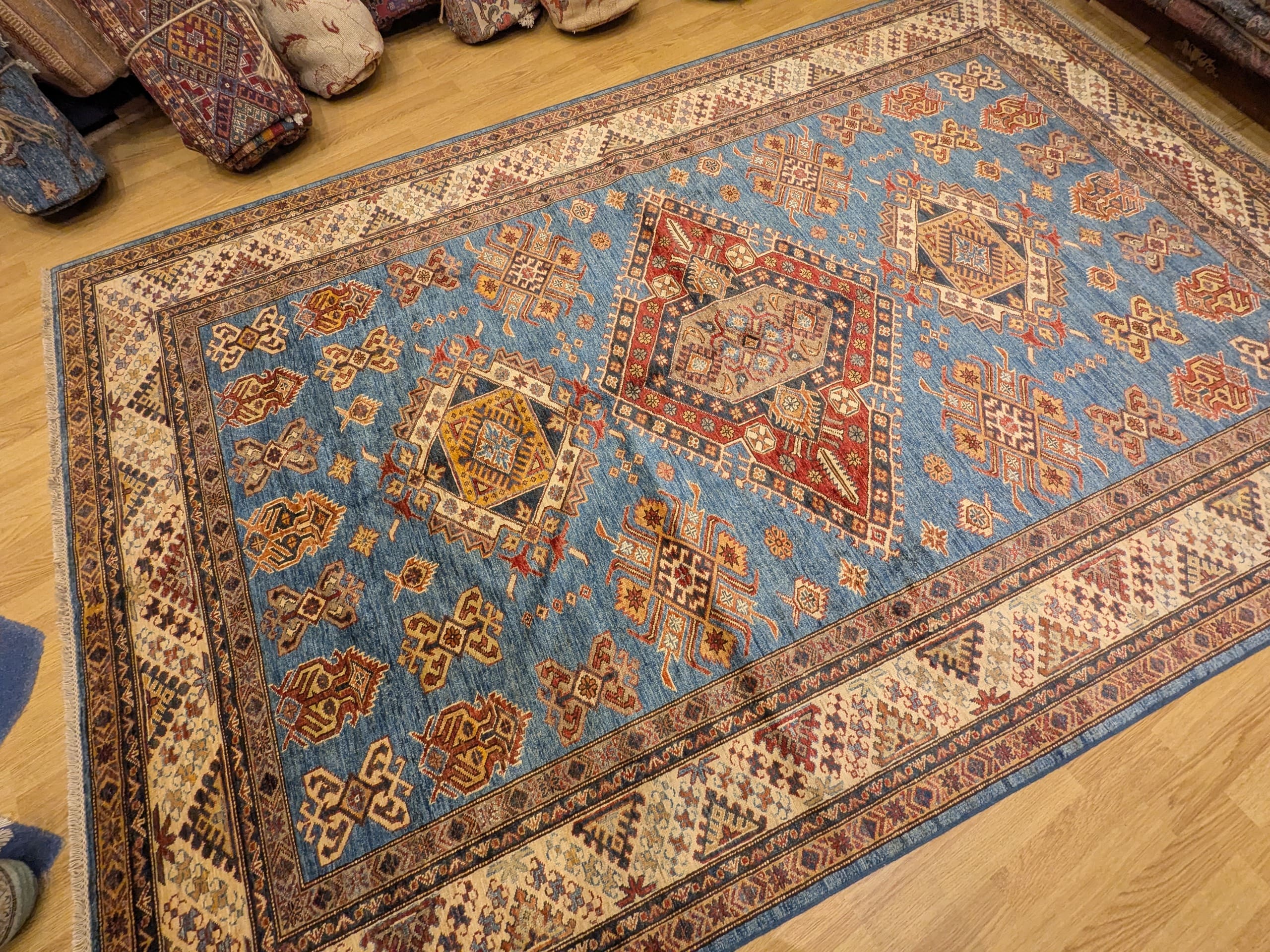 Un style authentique : Les motifs géométriques et les médaillons emblématiques du style Kazak évoquent la richesse des traditions tribales du Caucase.