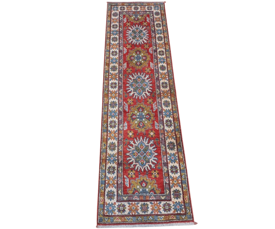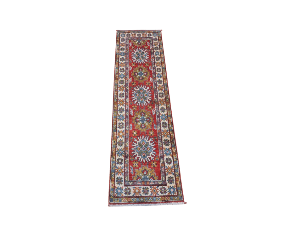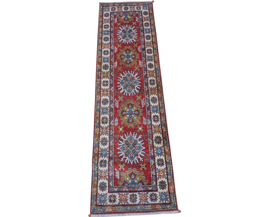 Ce tapis Kazak noué à la main en Afghanistan capte immédiatement le regard avec son fond rouge profond et ses puissants motifs géométriques. Les grands médaillons stylisés s’alignent sur l’axe central dans une symétrie précise, encadrés par des bordures ornées de rosaces multicolores. Sa composition riche et colorée s’inspire des grands classiques caucasiens tout en conservant une intensité visuelle éclatante.