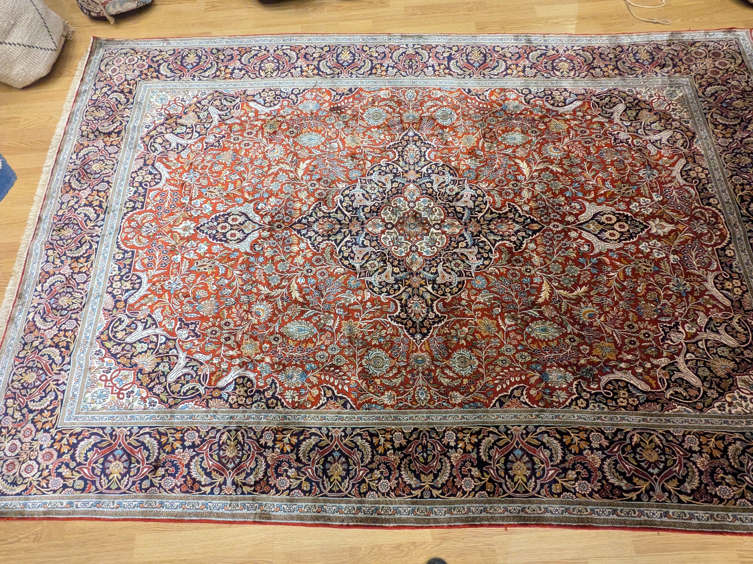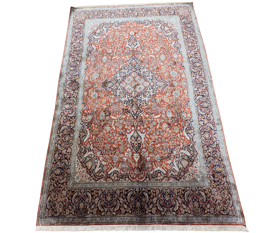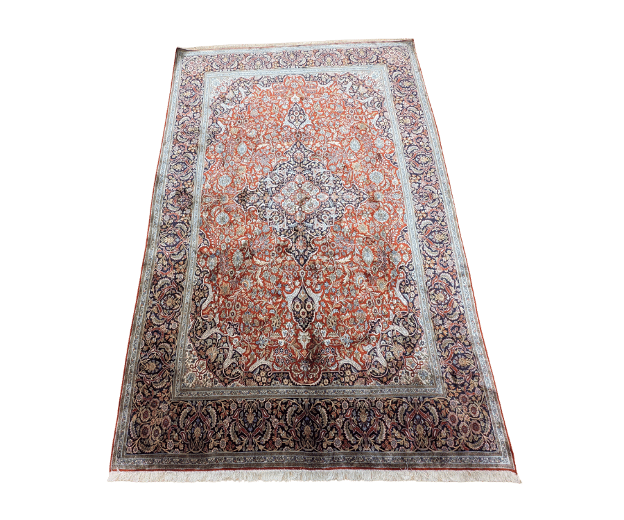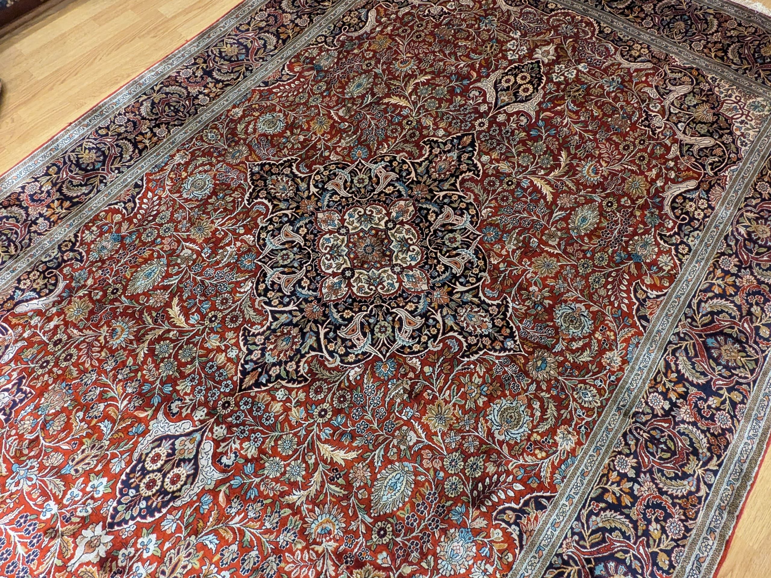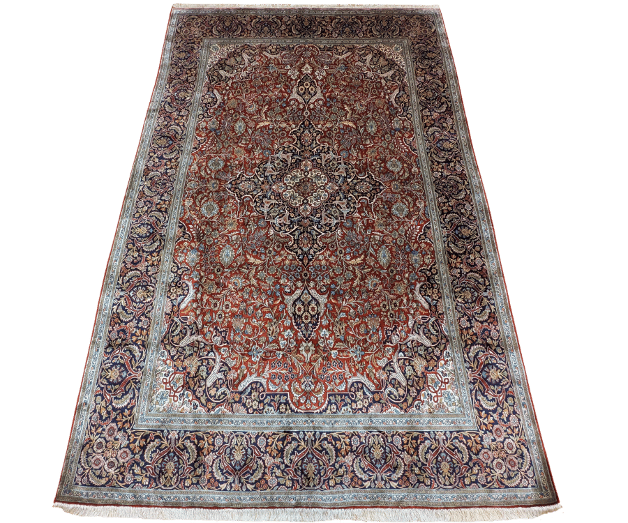 Ce tapis Keshan noué main en Iran est un exemple magnifique de savoir‑faire classique persan. Il présente un fond rouge chaud richement décoré, dont la teinte profonde donne à l’ensemble une présence forte et élégante. Un médaillon central complexe s’impose au cœur du tapis, entouré d’un foisonnement de motifs floraux délicats et structurés, qui se déploient jusqu’à la bordure. L’ensemble est généreusement rempli de détails, avec des ornements floraux secondaires qui créent un effet visuel riche et chargé, typique du style Keshan.