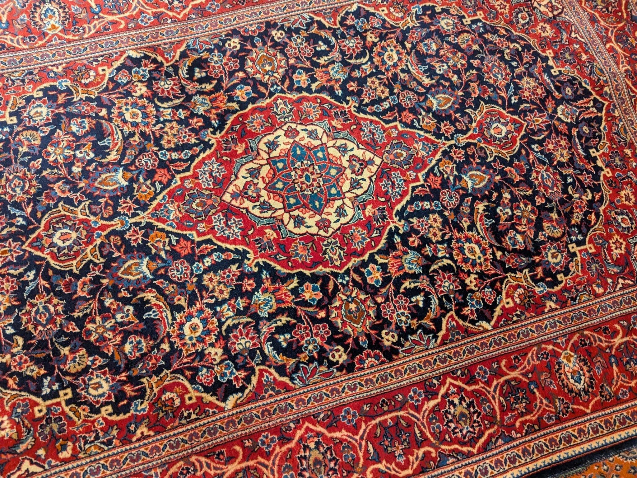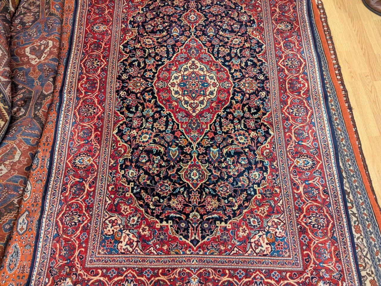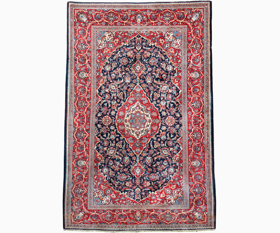 Ce tapis Keshan ancien iranien se distingue par son fond bleu profond, sublimé par un riche décor floral organisé autour d’un médaillon central finement dessiné. Les arabesques végétales s’entrelacent avec une grande précision, créant un ensemble dense et harmonieux, typique des grands tapis classiques persans. Les nuances de rouge, d’ivoire et de bleu clair viennent illuminer la composition et souligner la finesse des détails.