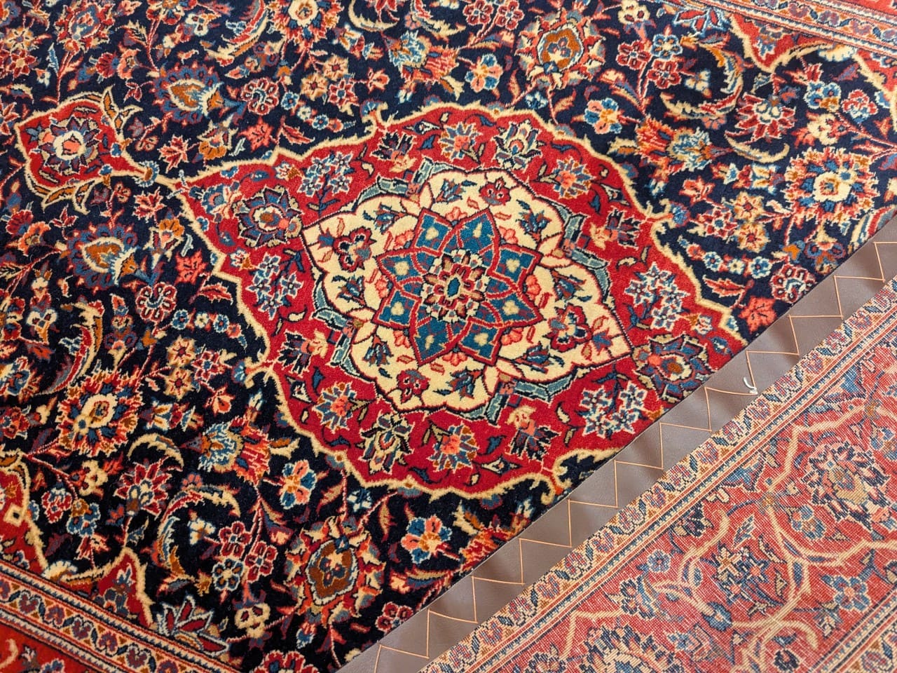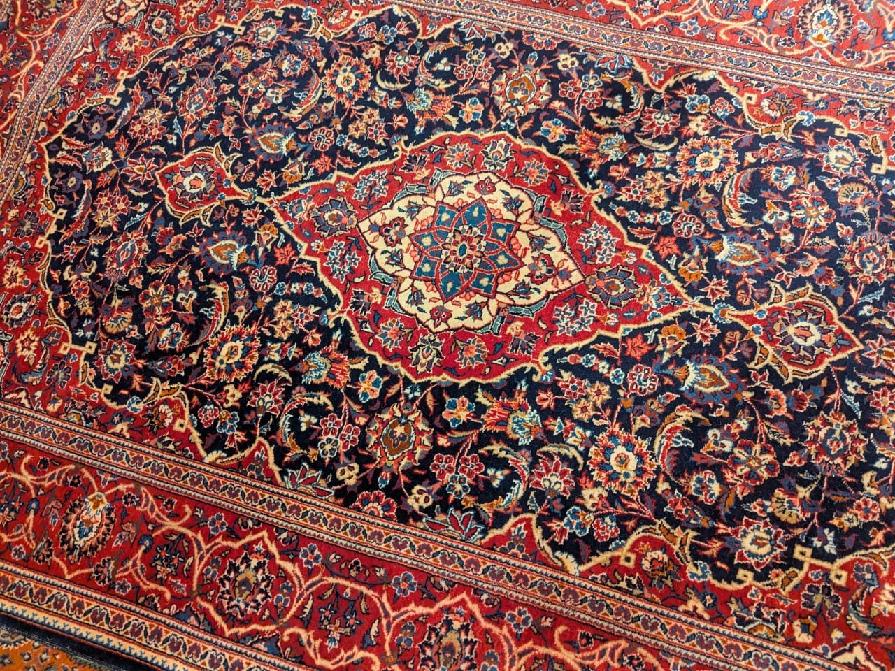 Un grand classique persan : Le médaillon central associé aux motifs floraux crée une composition intemporelle et raffinée