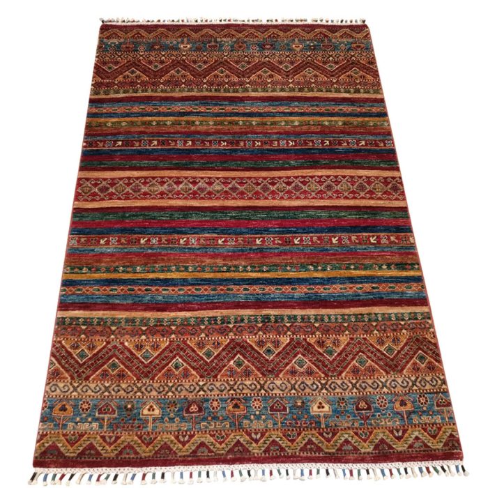 Composé de plusieurs bandes de couleurs avec petits motifs , ce beau tapis afghan moderne séduit avec ce mélange subtil entre tapis moderne et tapis classique.