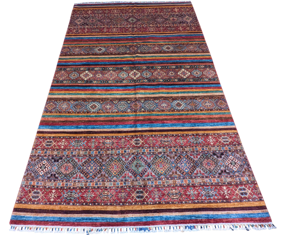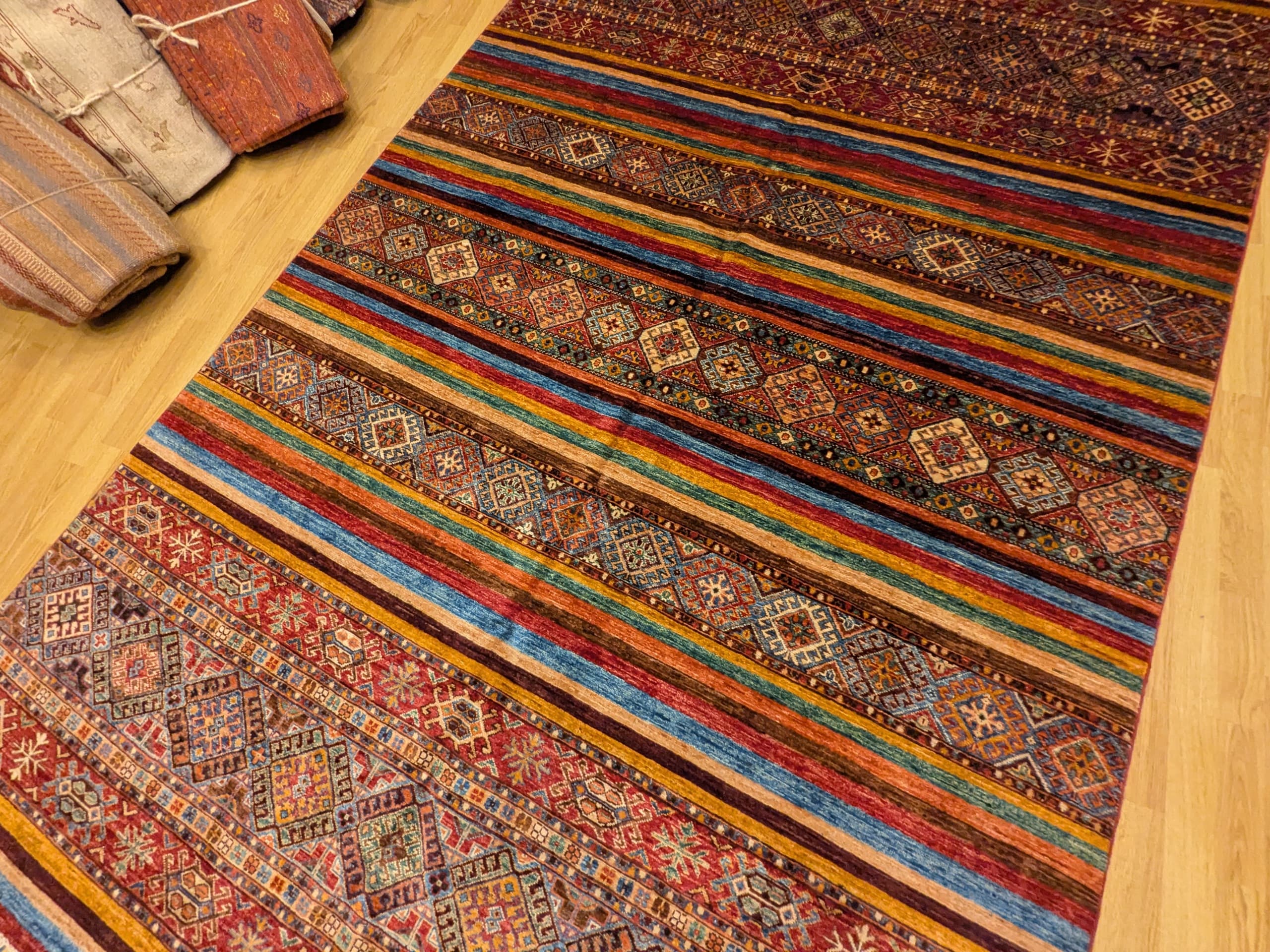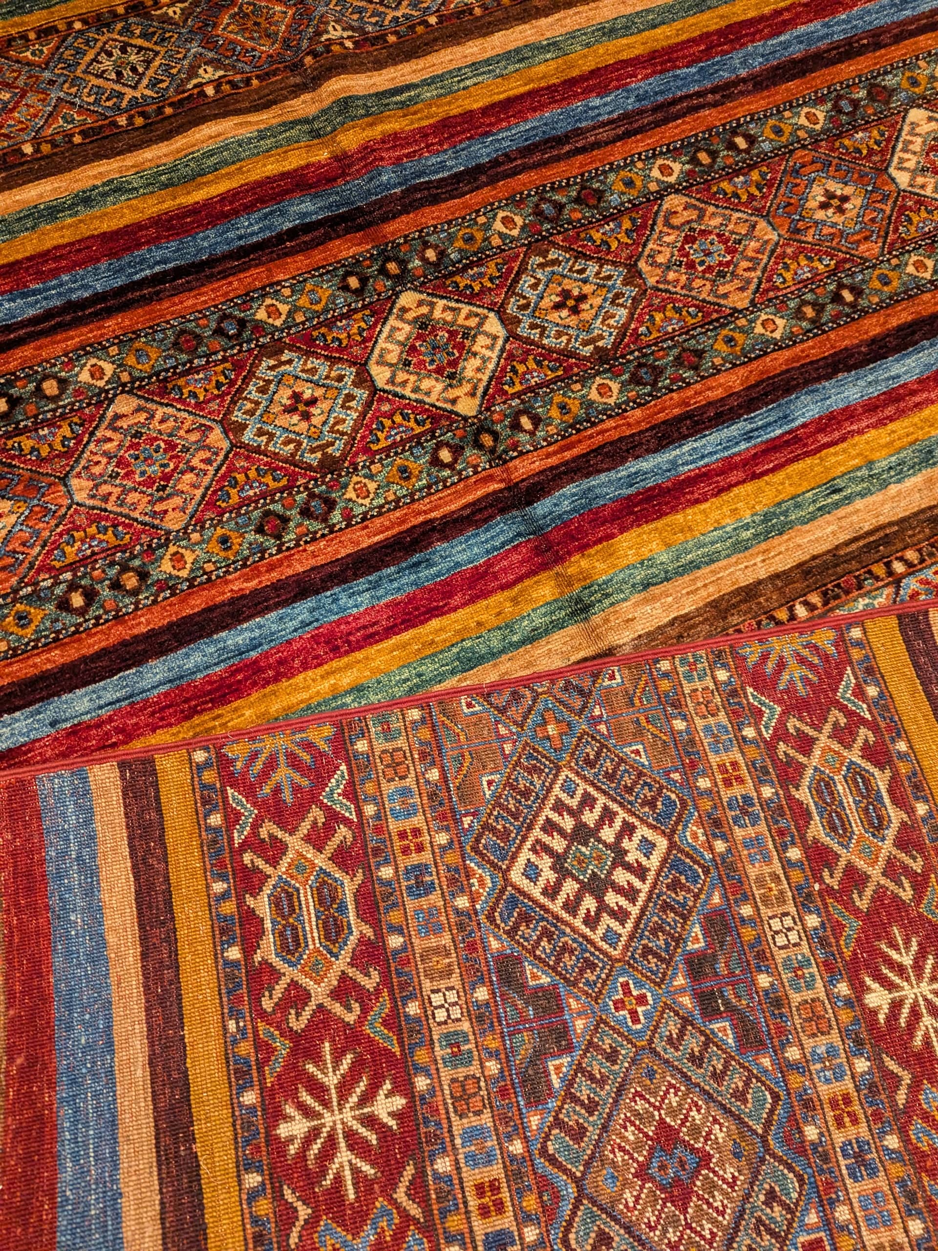 Ce tapis Khorjin afghan est une explosion de couleurs et de motifs inspirés des sacs de selle traditionnels des tribus nomades. Il se distingue par ses bandes horizontales multicolores et son enchevêtrement de motifs géométriques qui lui confèrent un style à la fois vivant et authentique. Chaque rayure est un hommage aux palettes tribales, combinant avec audace rouge brique, bleu indigo, jaune safran et vert profond.
