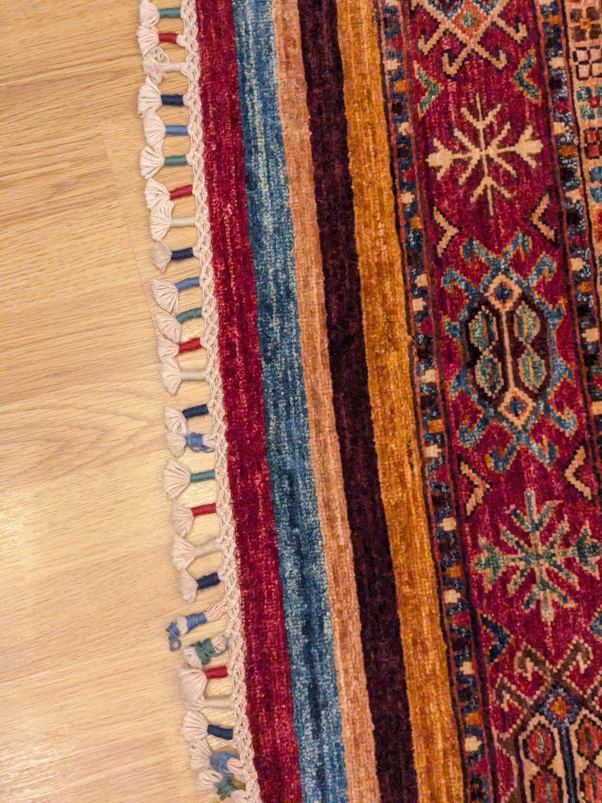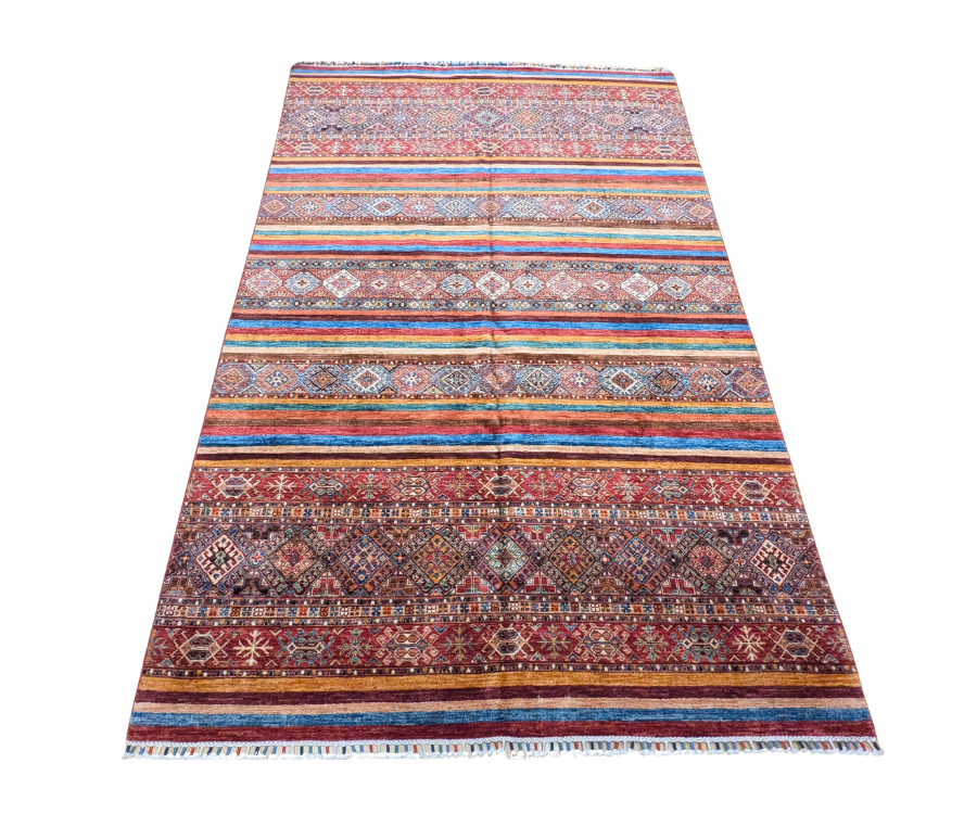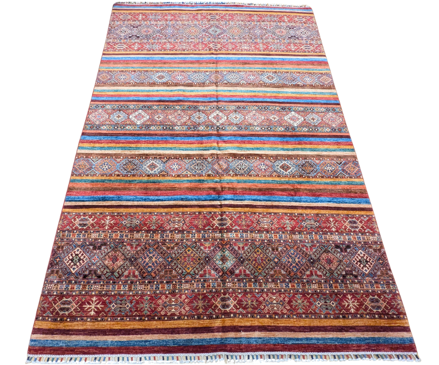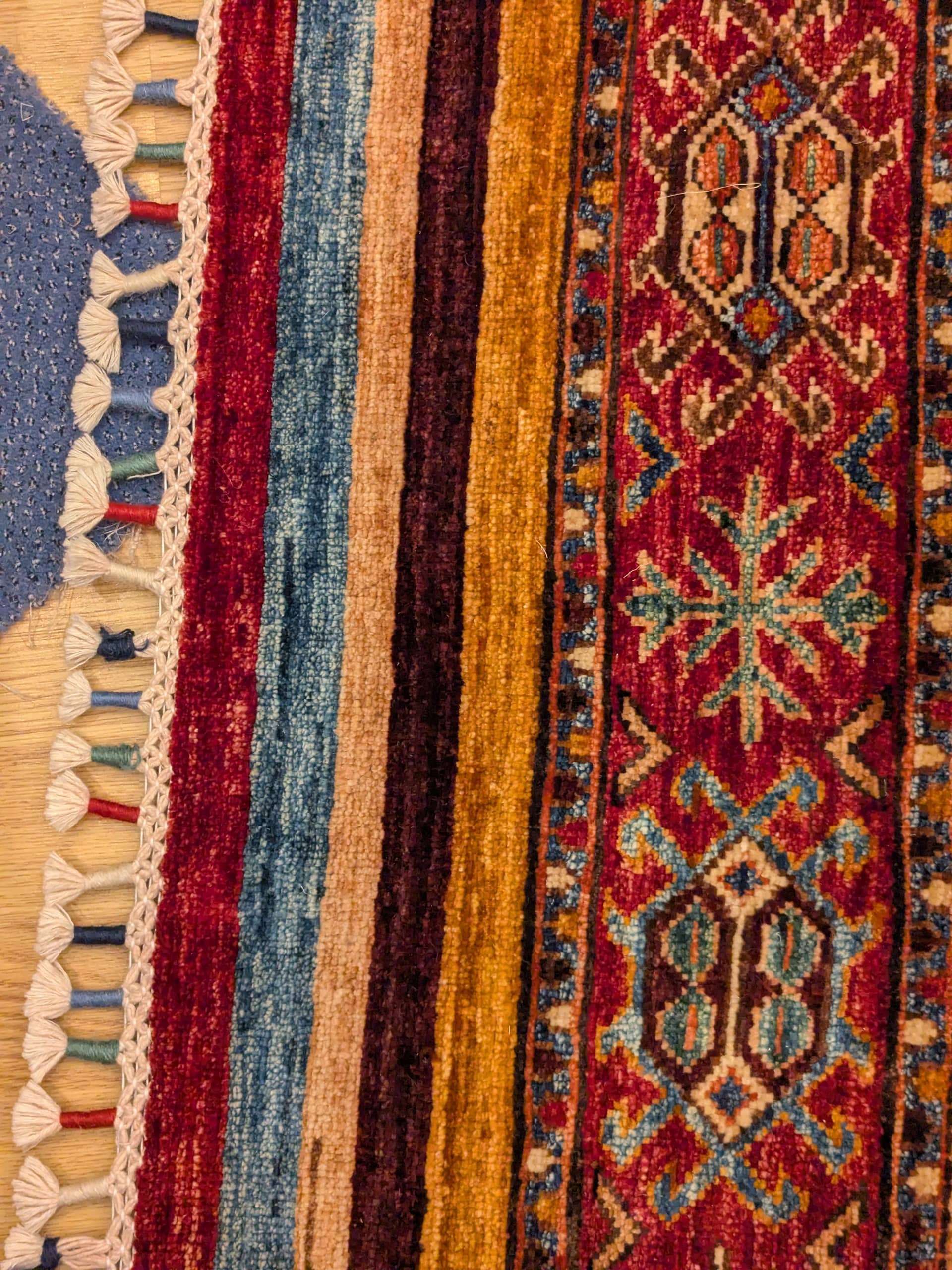 Ce tapis Khorjin afghan est une explosion de couleurs et de motifs inspirés des sacs de selle traditionnels des tribus nomades. Il se distingue par ses bandes horizontales multicolores et son enchevêtrement de motifs géométriques qui lui confèrent un style à la fois vivant et authentique. Chaque rayure est un hommage aux palettes tribales, combinant avec audace rouge brique, bleu indigo, jaune safran et vert profond.