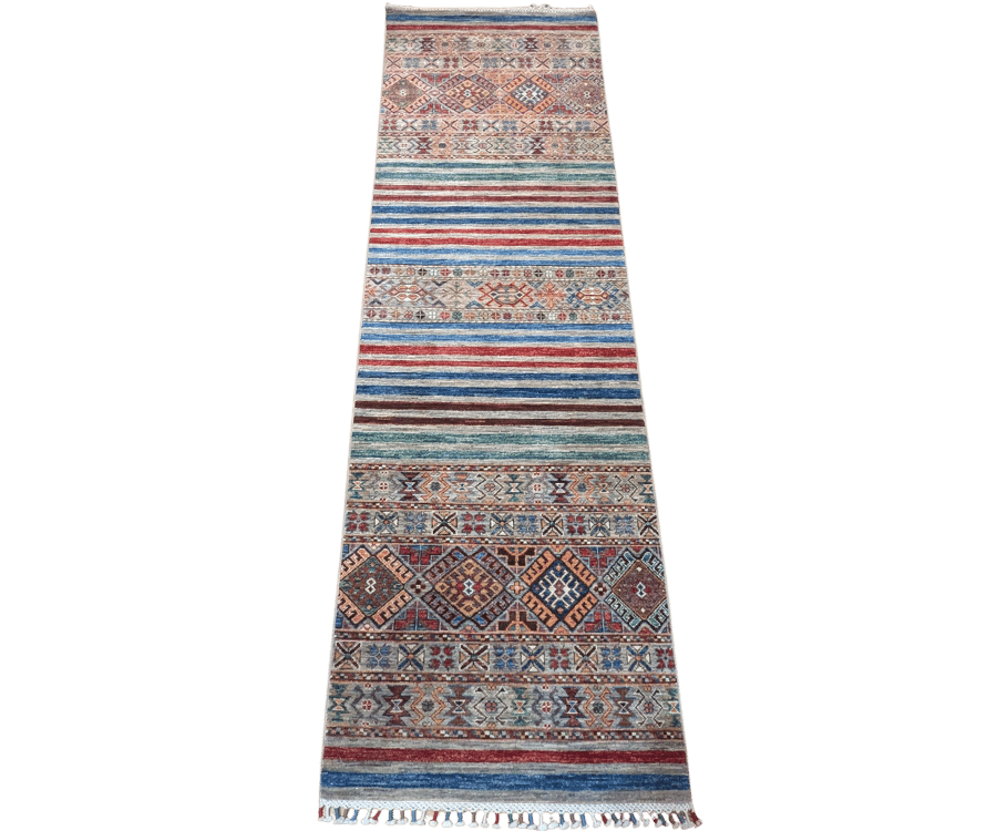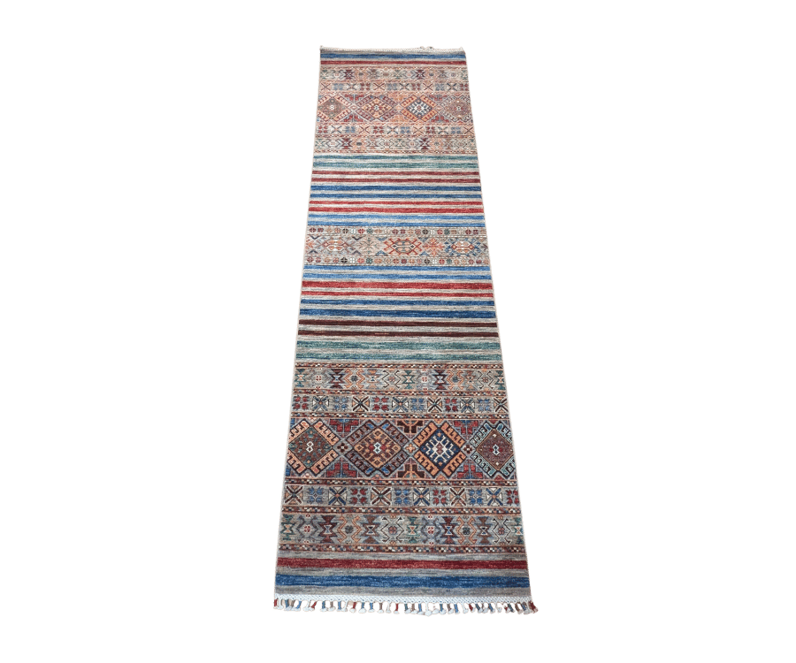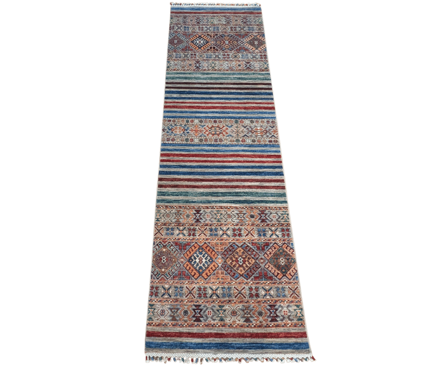 Issu de la collection Khorjin, ce tapis de couloir afghan reflète parfaitement l’esprit nomade qui l’inspire. Sa composition alterne des rayures dynamiques et des bandes de motifs géométriques traditionnels, le tout dans une explosion de couleurs riches et saturées. Chaque section semble raconter une histoire différente, faisant de ce tapis une pièce aussi décorative qu’expressive.