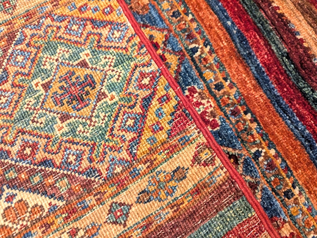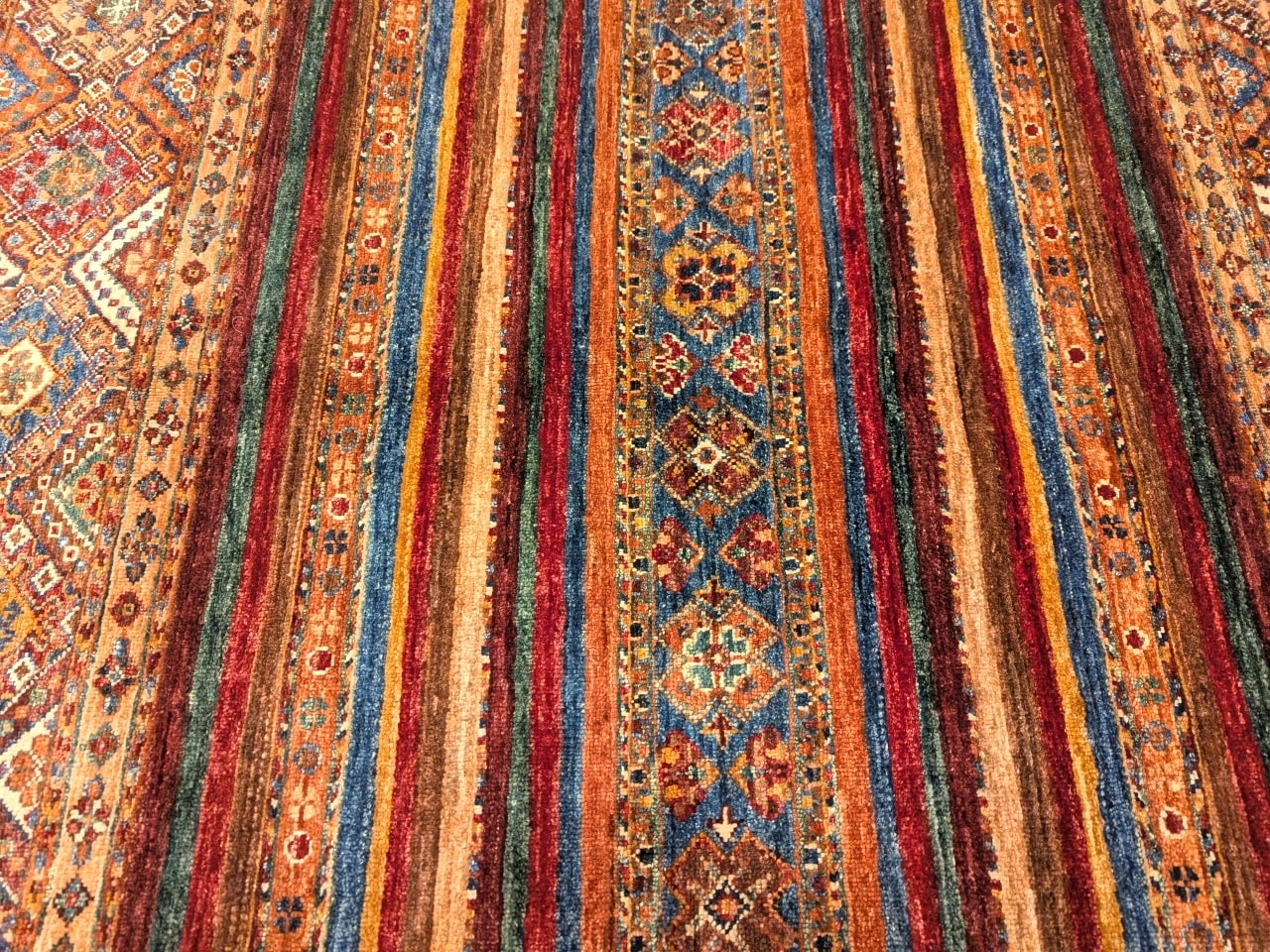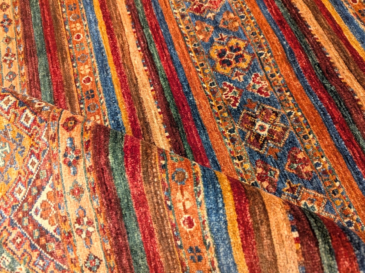Ce tapis Khorjin noué à la main en Afghanistan incarne toute la richesse artisanale et colorée des traditions nomades. Son fond orange lumineux est rythmé par une alternance de bandes rayées et de motifs géométriques complexes, dans une palette vive où s’entremêlent des tons de bleu, vert, ivoire et bordeaux.