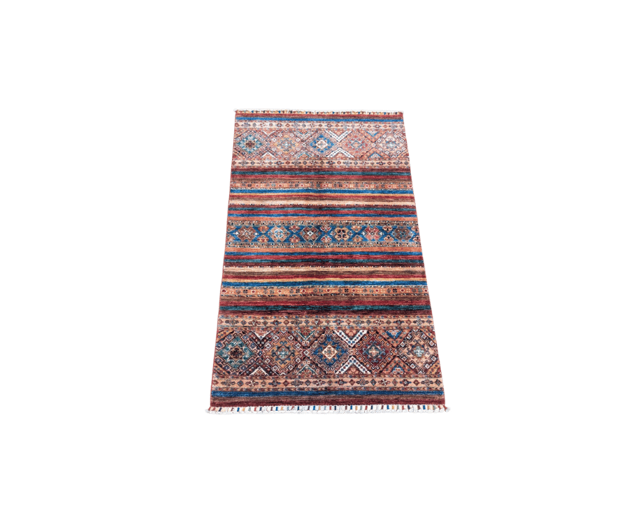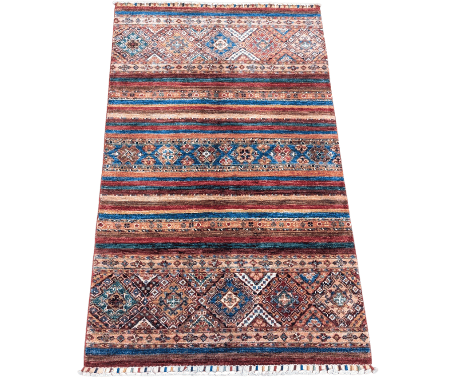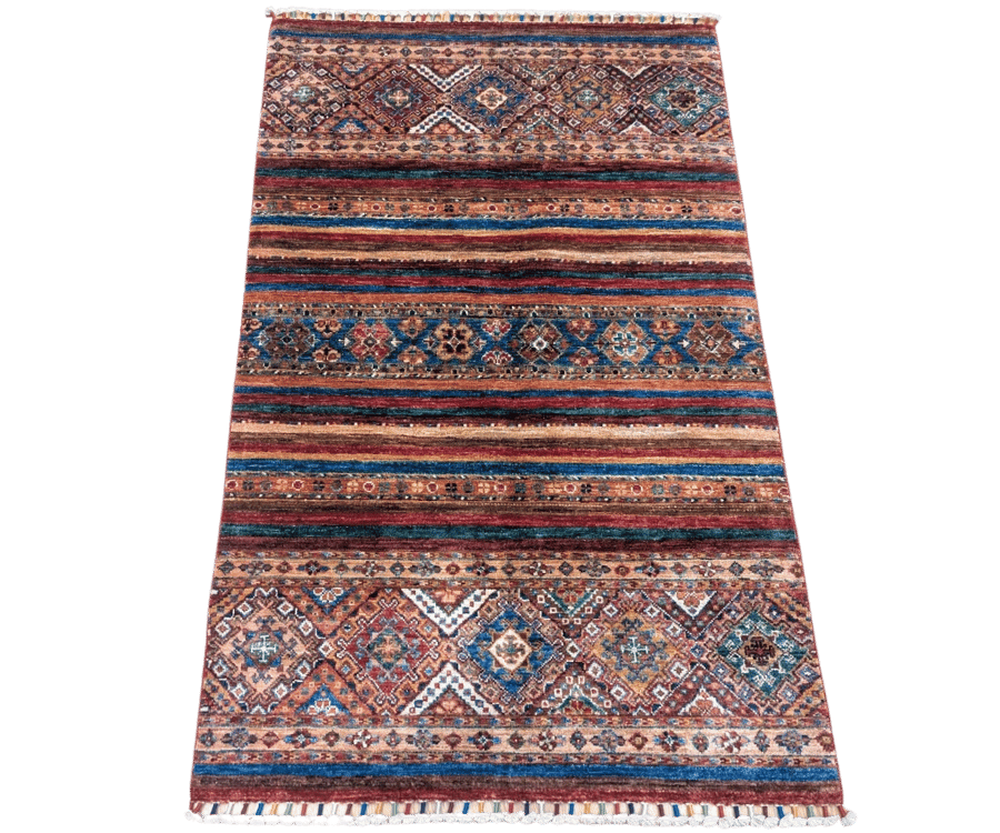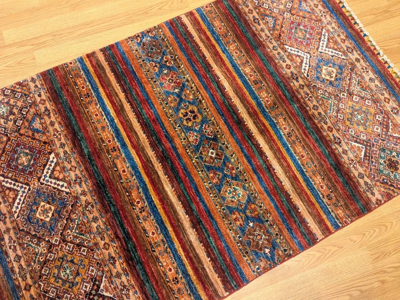Ce tapis Khorjin noué à la main en Afghanistan incarne toute la richesse artisanale et colorée des traditions nomades. Son fond orange lumineux est rythmé par une alternance de bandes rayées et de motifs géométriques complexes, dans une palette vive où s’entremêlent des tons de bleu, vert, ivoire et bordeaux.