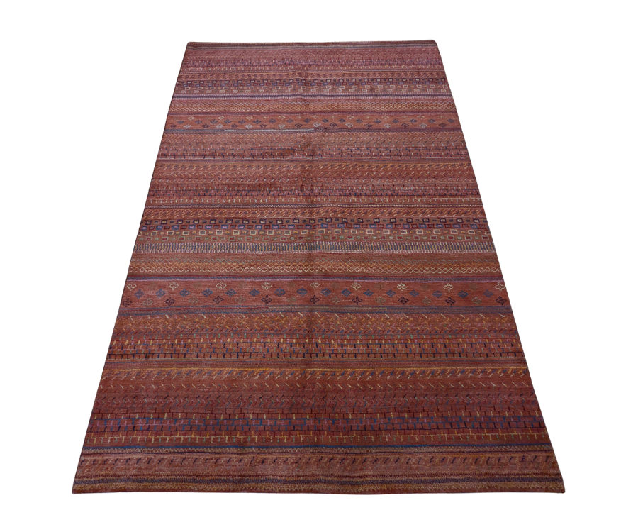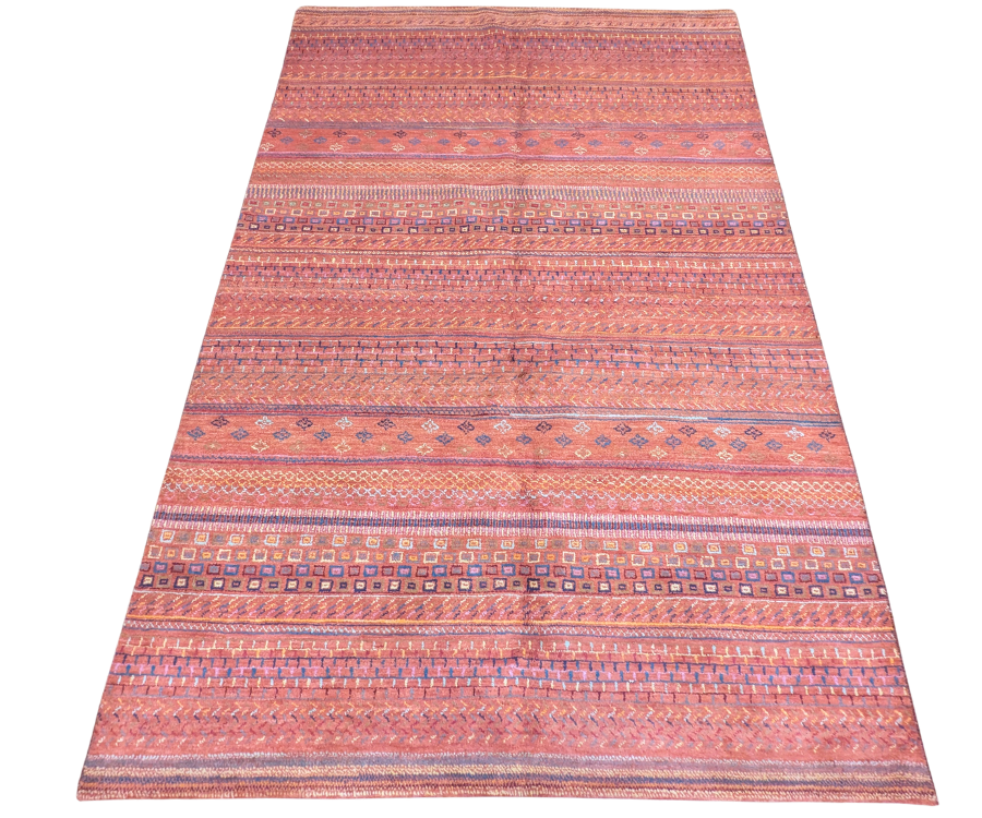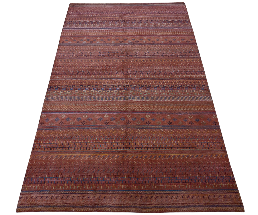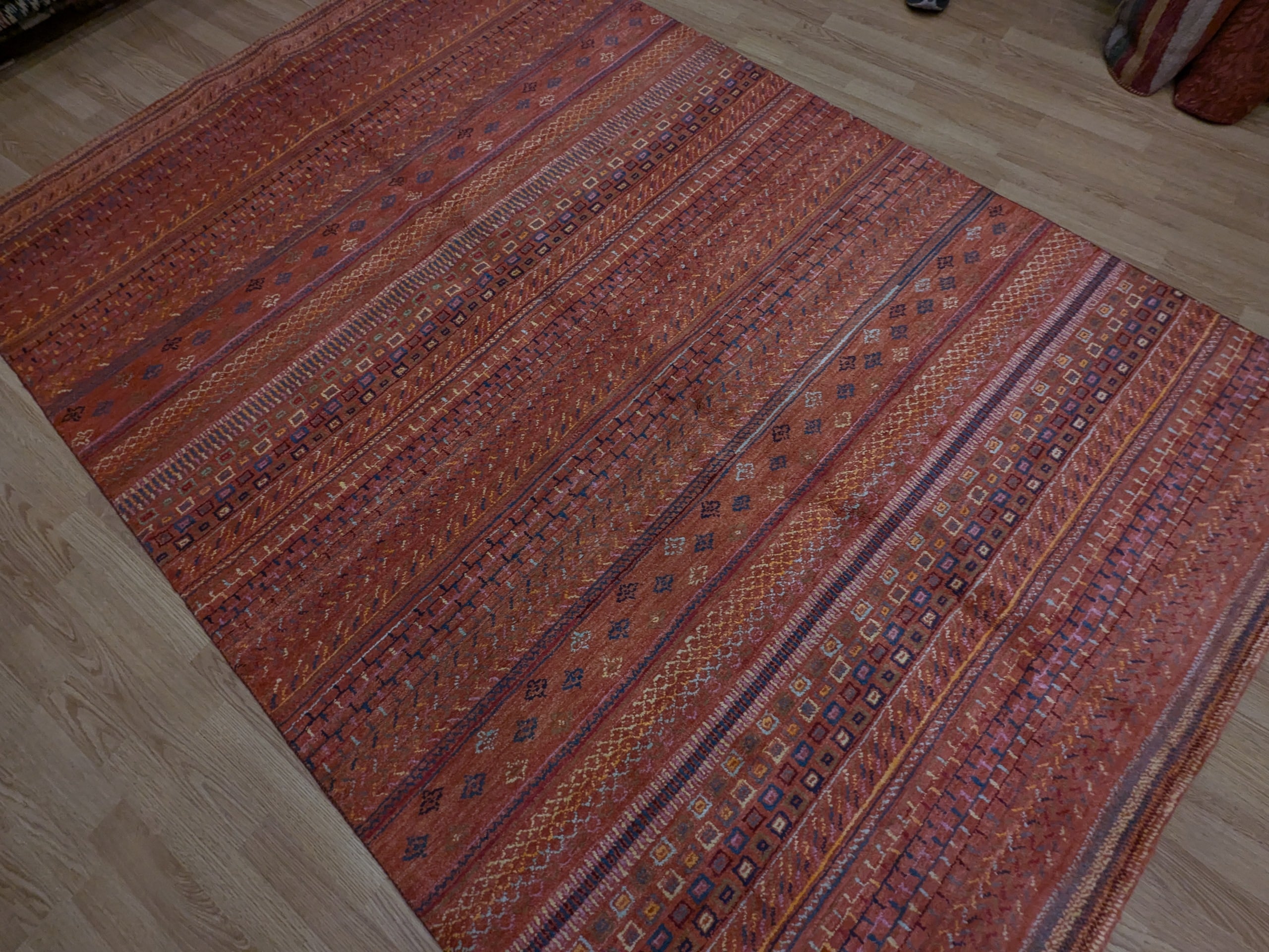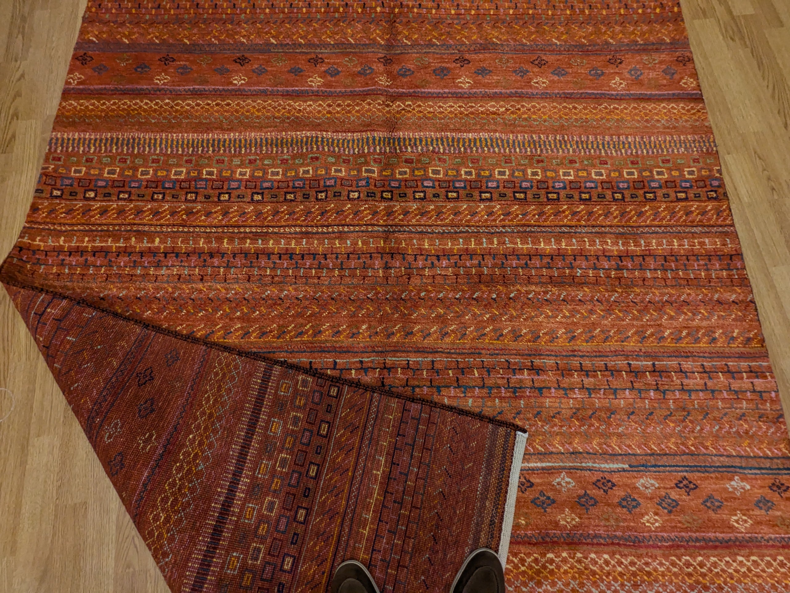Ce tapis Khyber, noué à la main en Afghanistan, se distingue par sa palette de tons orangés vibrants et sa richesse graphique. Il présente une alternance dense de bandes aux motifs géométriques minutieusement travaillés, dans des nuances de brique, de rouille, de safran et de brun. Un tapis chaleureux et expressif, parfait pour injecter du caractère dans un intérieur.