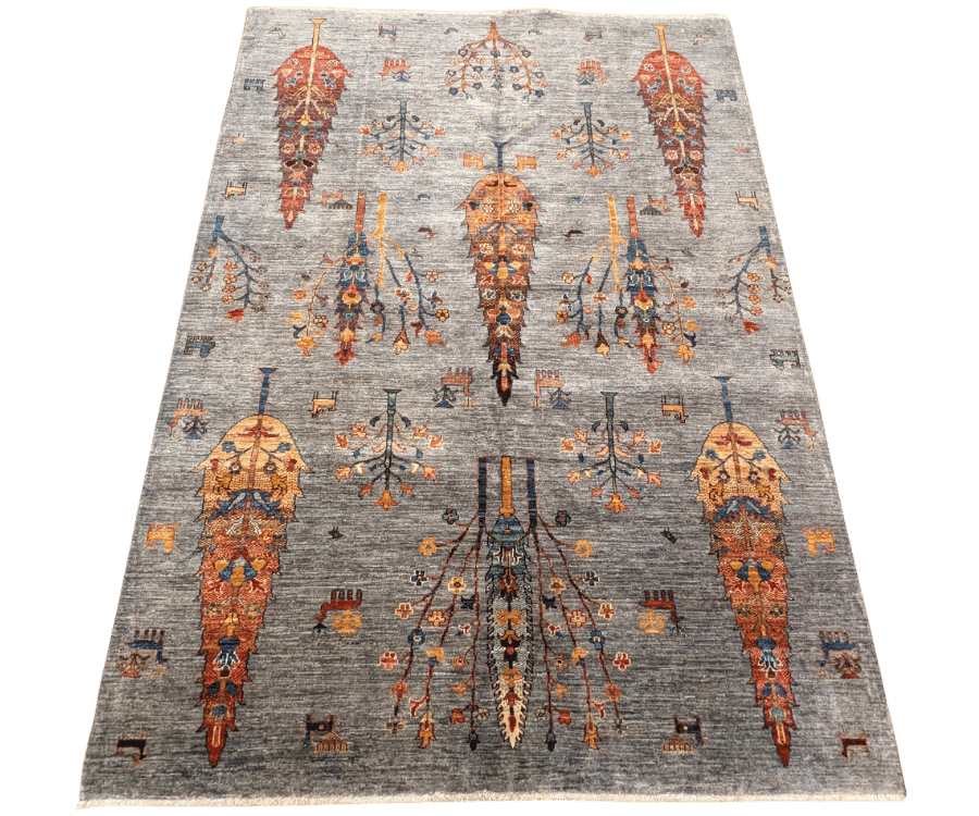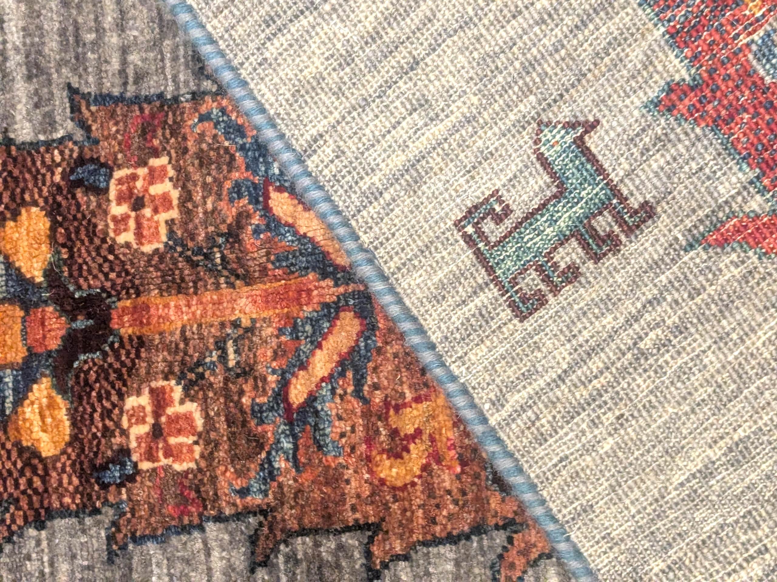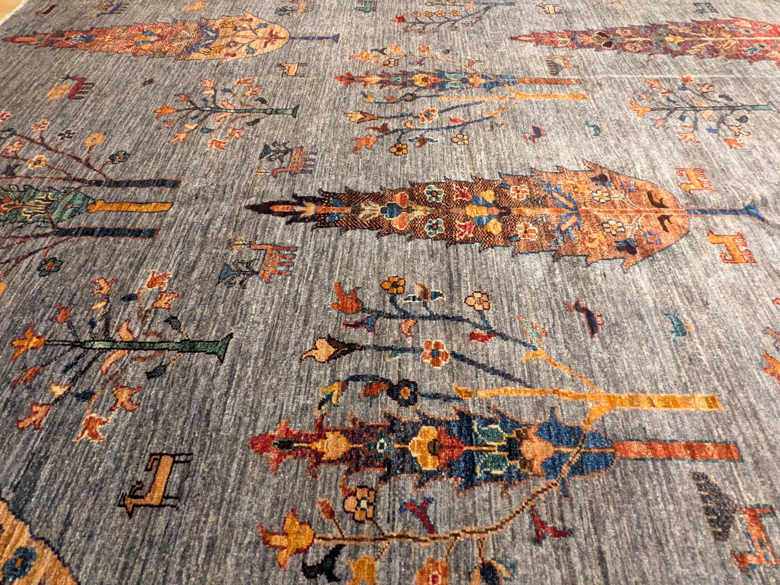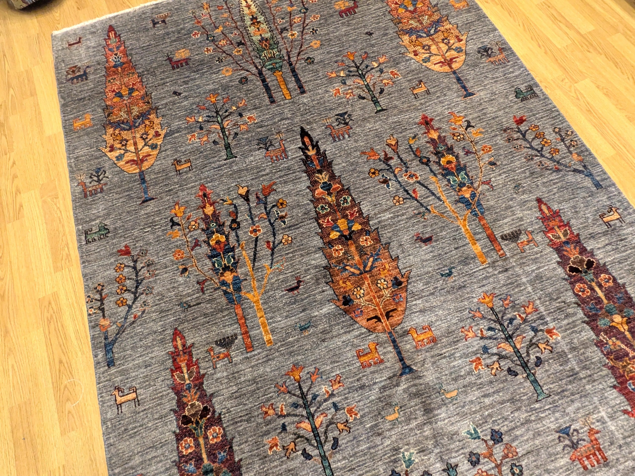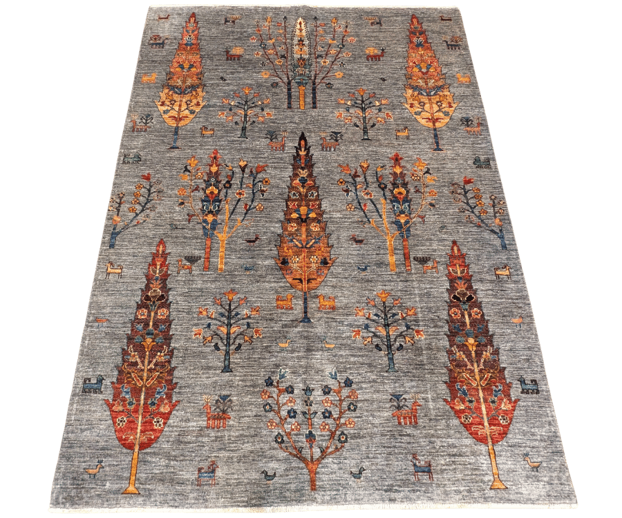Ce tapis Loribaft d’Afghanistan se distingue par son décor poétique et narratif. Sur un fond gris neutre et texturé, une série d’arbres stylisés et d’éléments figuratifs (animaux, oiseaux, petits motifs symboliques) tissés à la main crée une scène à la fois artistique et vivante. Chaque motif semble raconter une histoire, dans une palette chaleureuse de brique, ocres, bleus et jaunes qui contraste subtilement avec la sobriété du fond.
