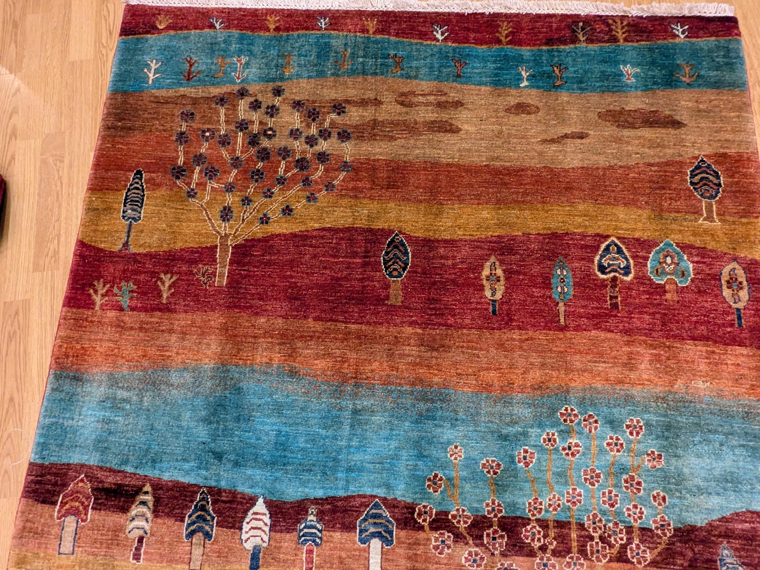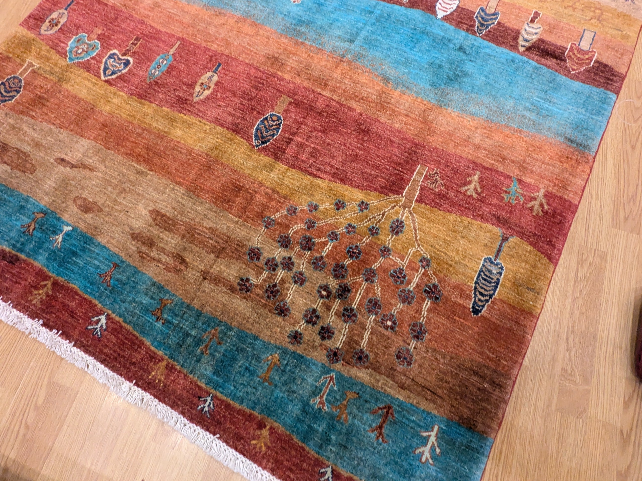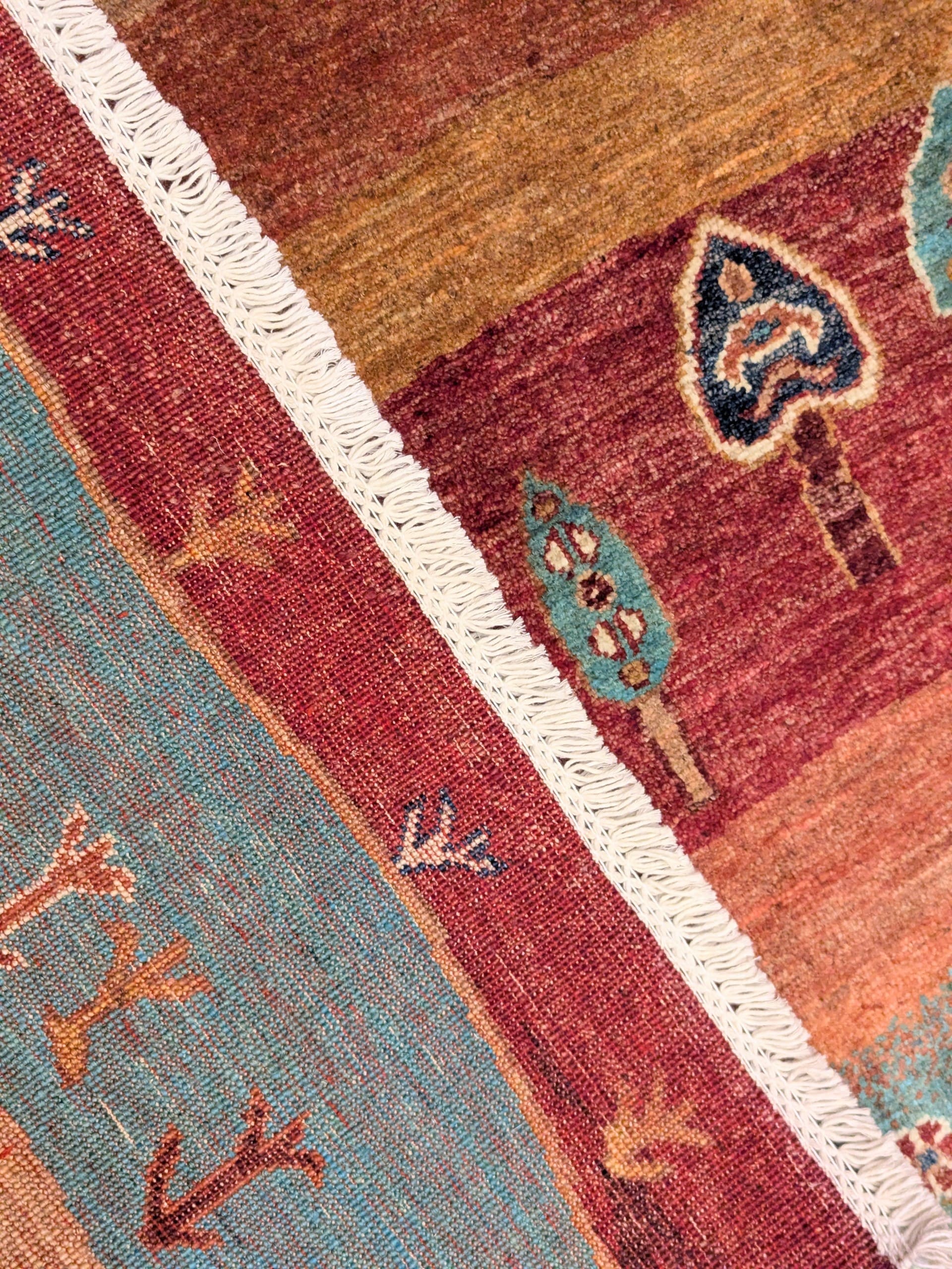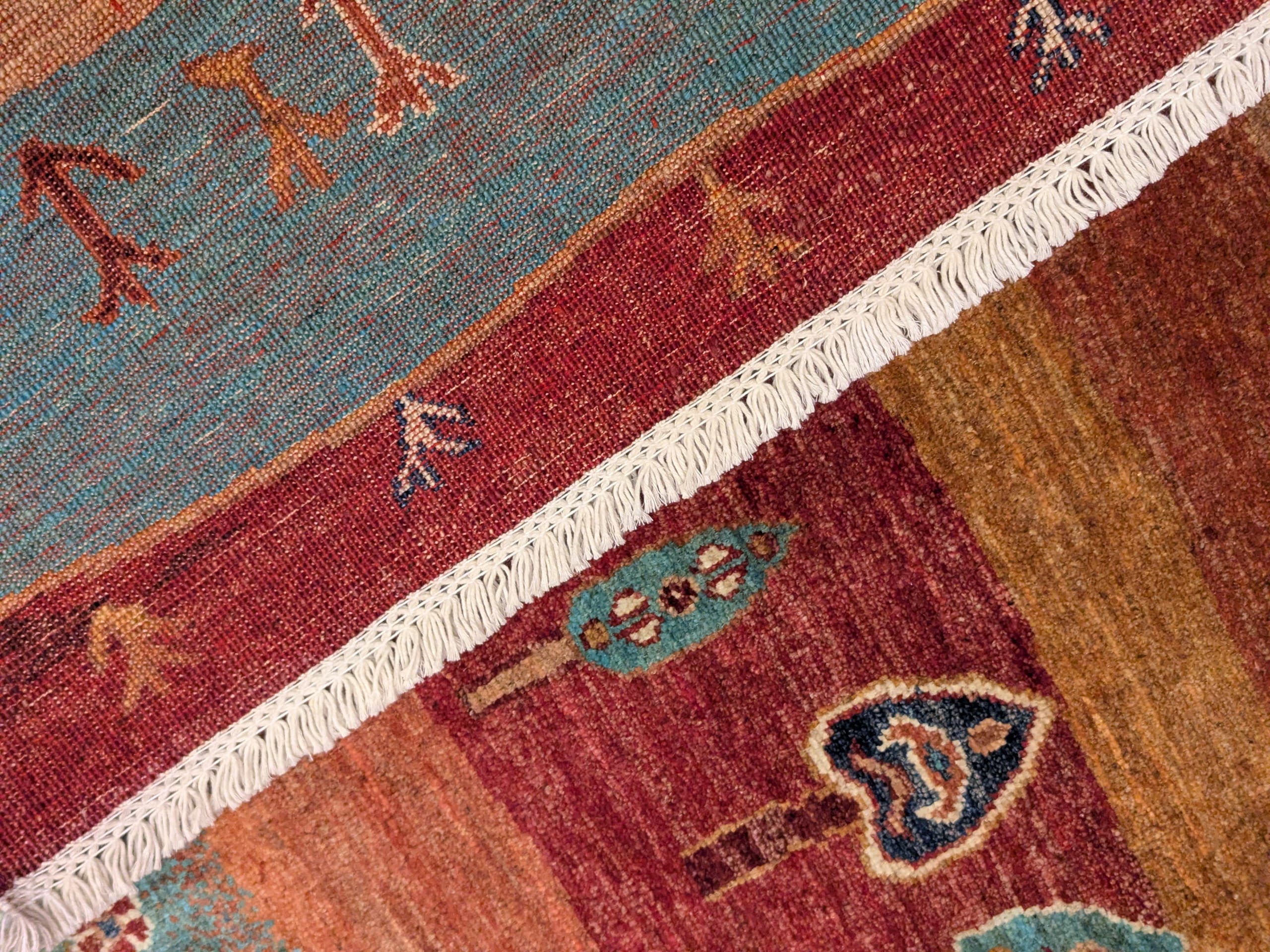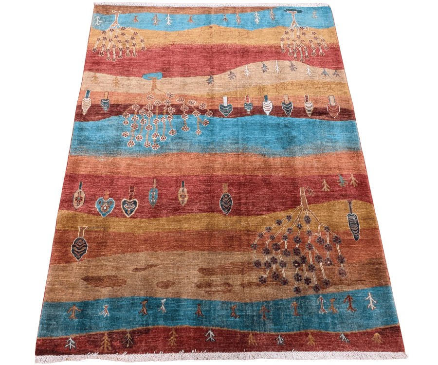 Ce tapis dans notre collection Manzar noué main en Afghanistan joue sur l’alternance de bandes colorées audacieuses et de symboles figuratifs inspirés des tapis orientaux. Chaque ligne raconte une histoire, entre arbres stylisés, maisons, cœurs et motifs tribaux. Sa palette chaude et vive dynamise immédiatement l’espace.