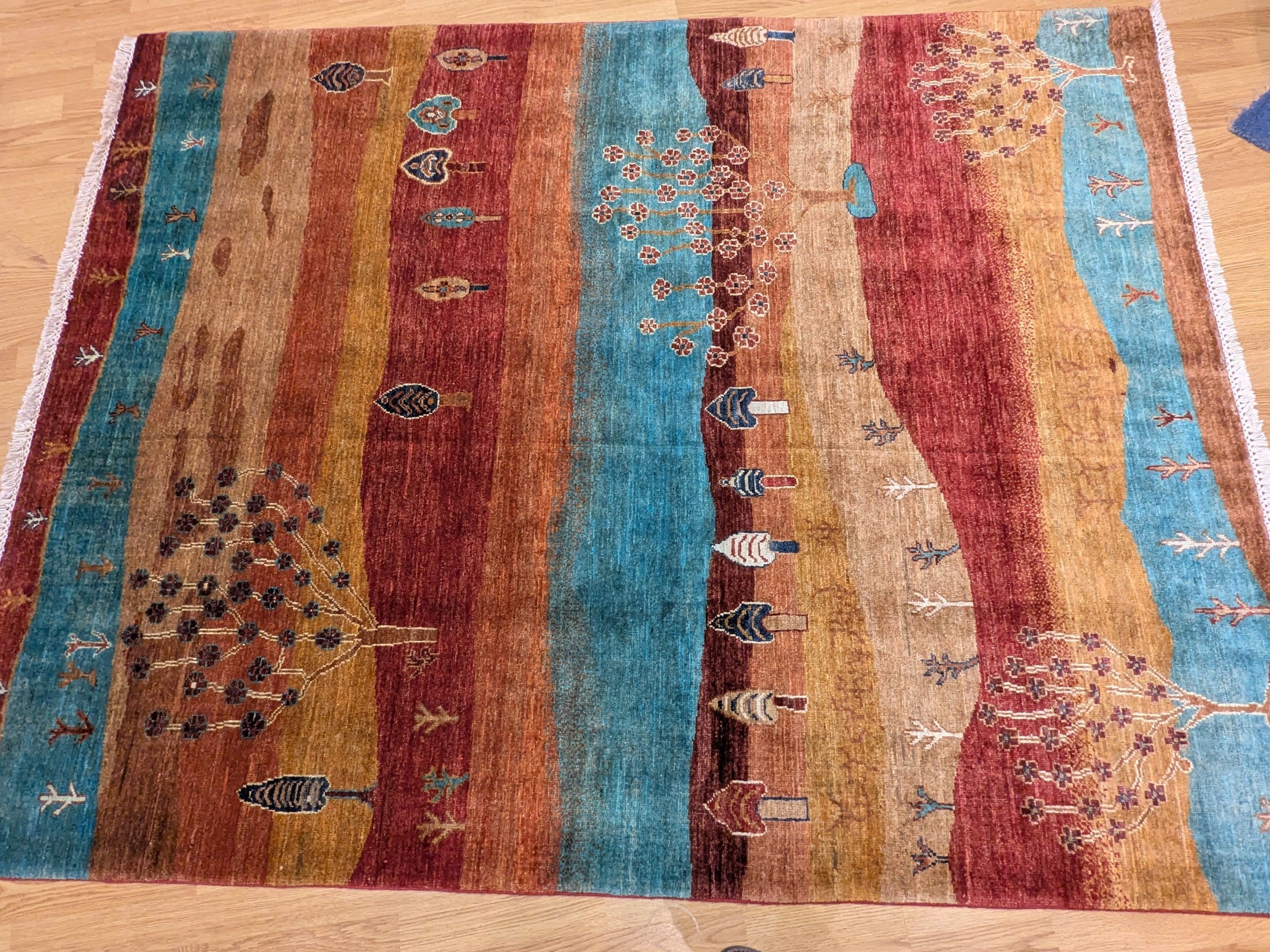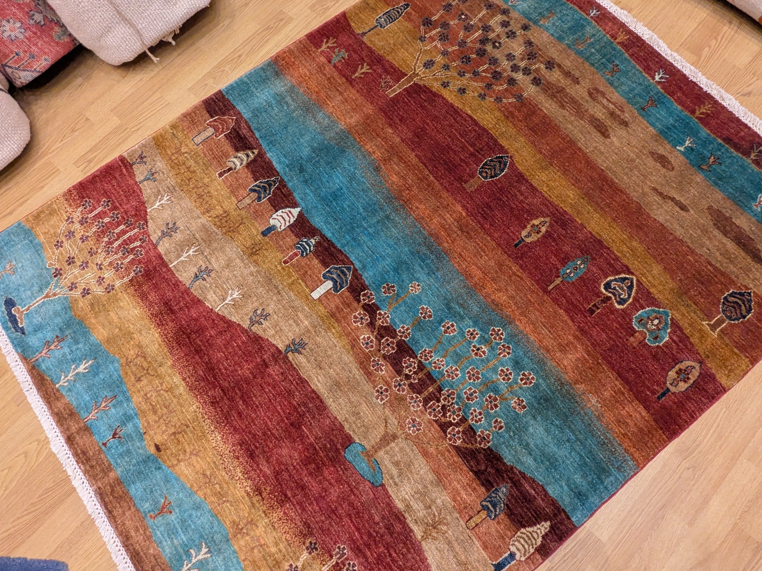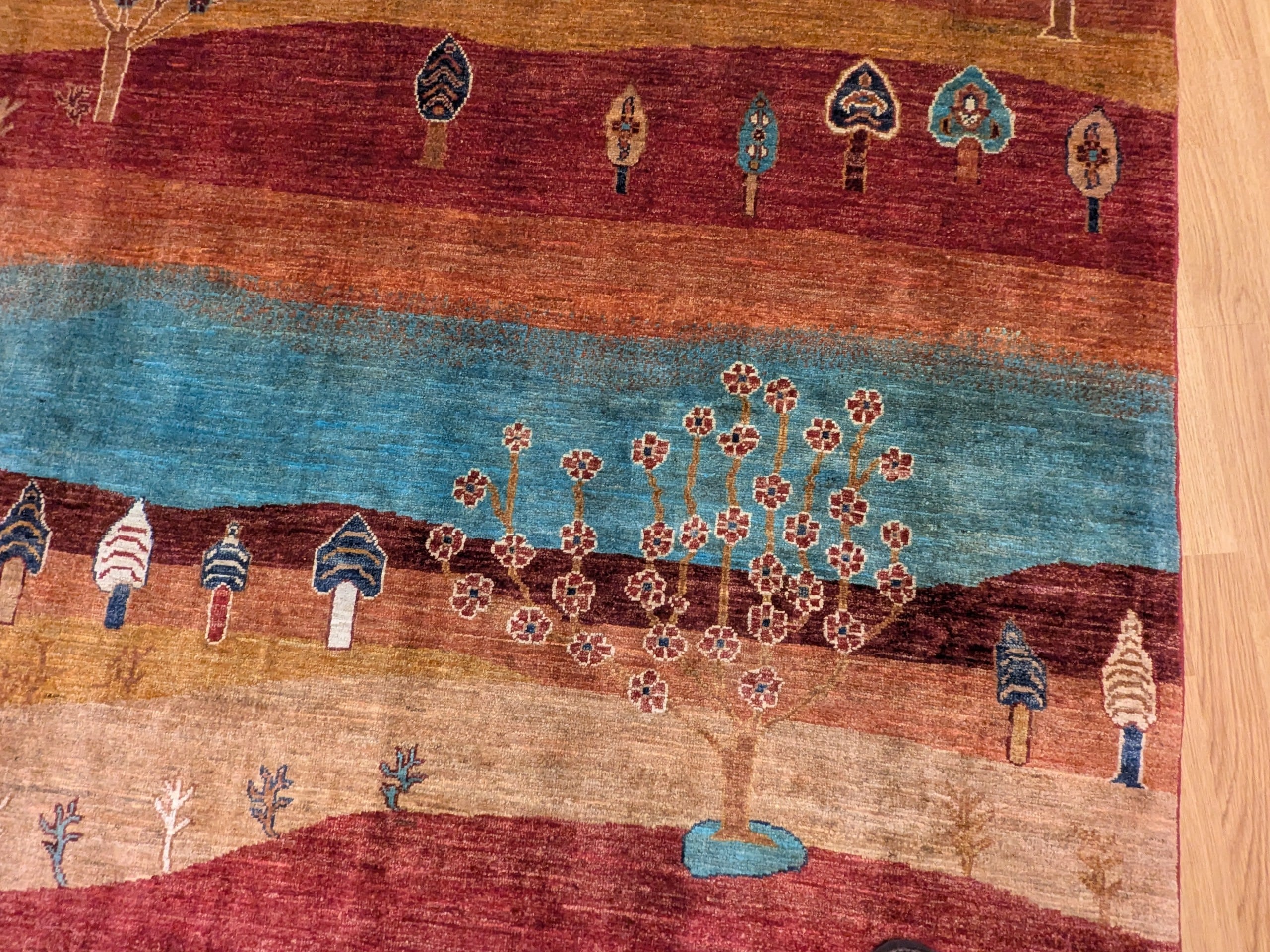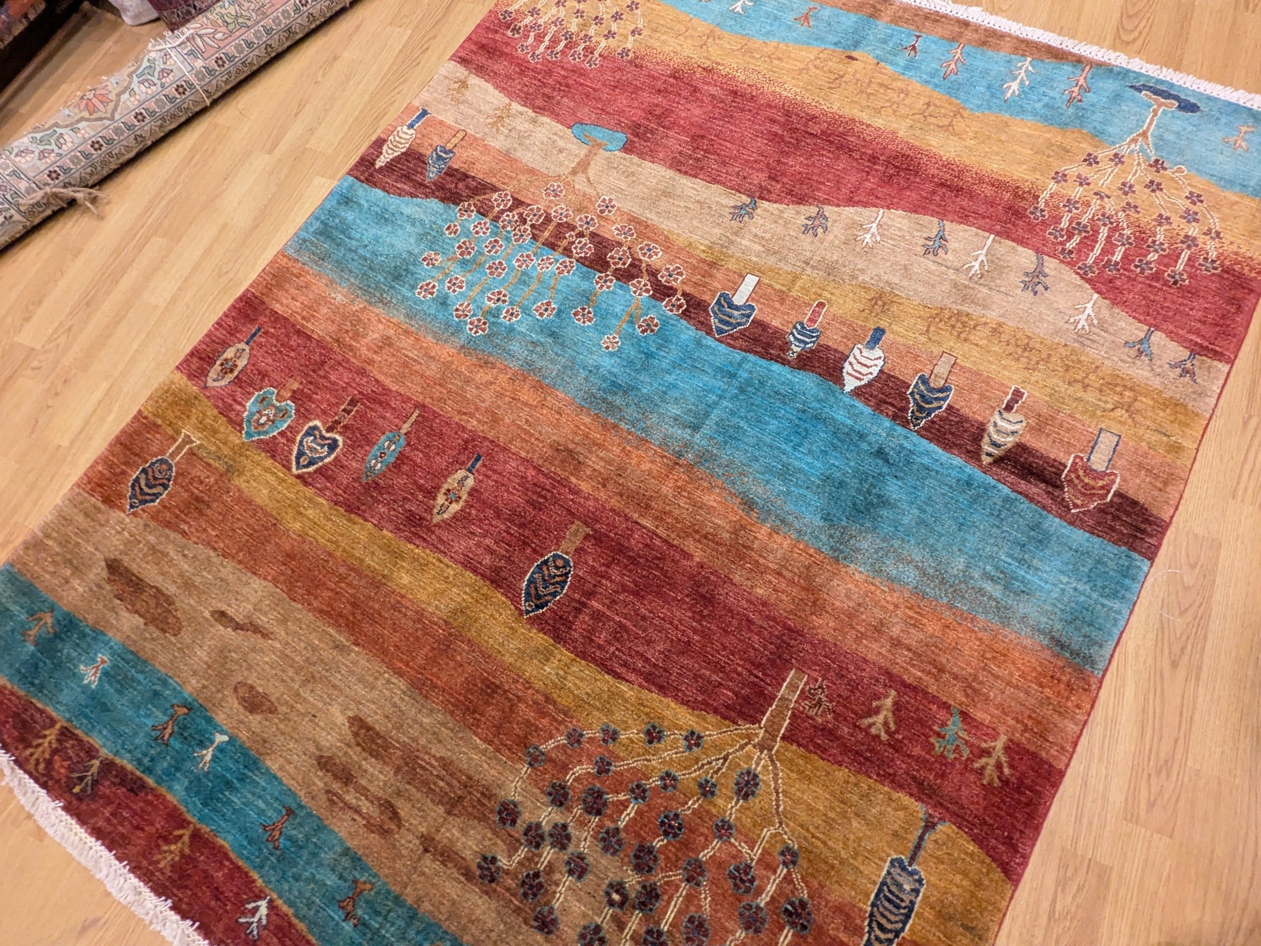 Ce tapis dans notre collection Manzar noué main en Afghanistan joue sur l’alternance de bandes colorées audacieuses et de symboles figuratifs inspirés des tapis orientaux. Chaque ligne raconte une histoire, entre arbres stylisés, maisons, cœurs et motifs tribaux. Sa palette chaude et vive dynamise immédiatement l’espace.