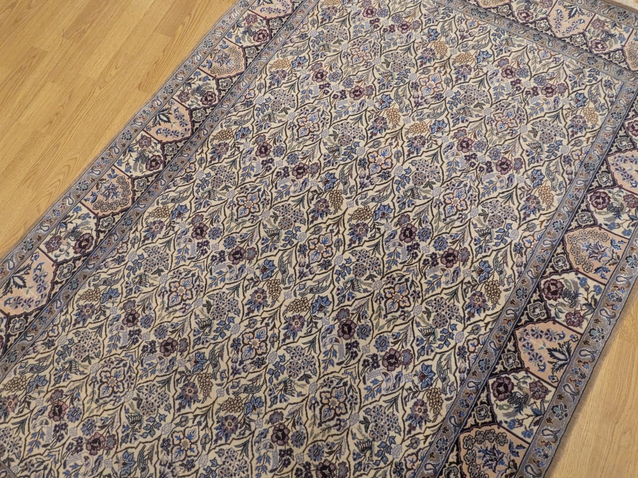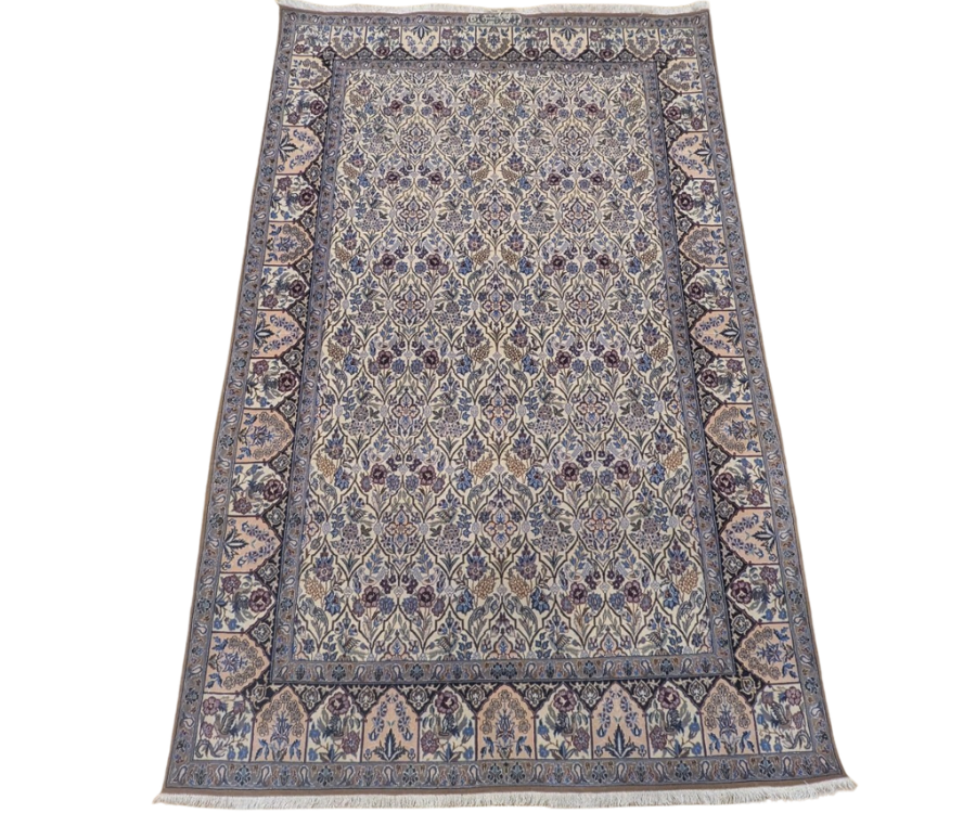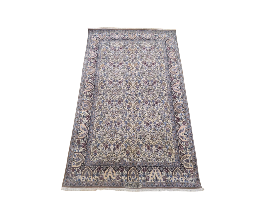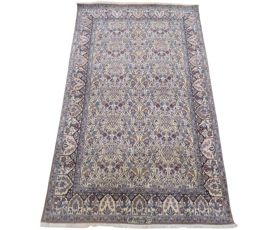 Ce tapis persan Naïn, noué à la main, reflète la finesse emblématique de cette prestigieuse région iranienne. Sur un fond beige clair, s’épanouissent des motifs floraux d’une grande régularité, dans des tons froids de bleu, violet et gris perle. L’ensemble dégage une impression de pureté et d’élégance sobre, caractéristique des tapis Naïn à trame fine.