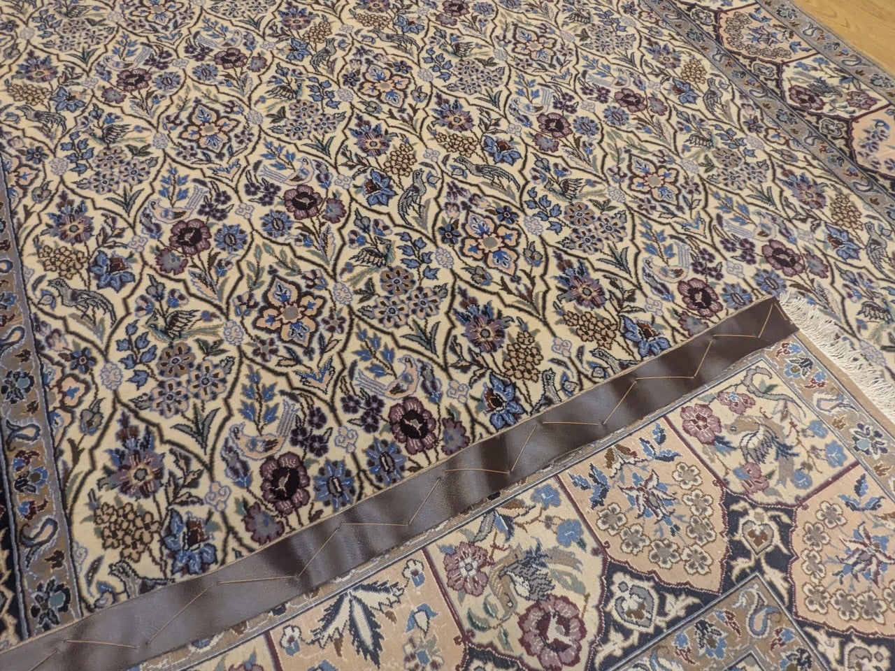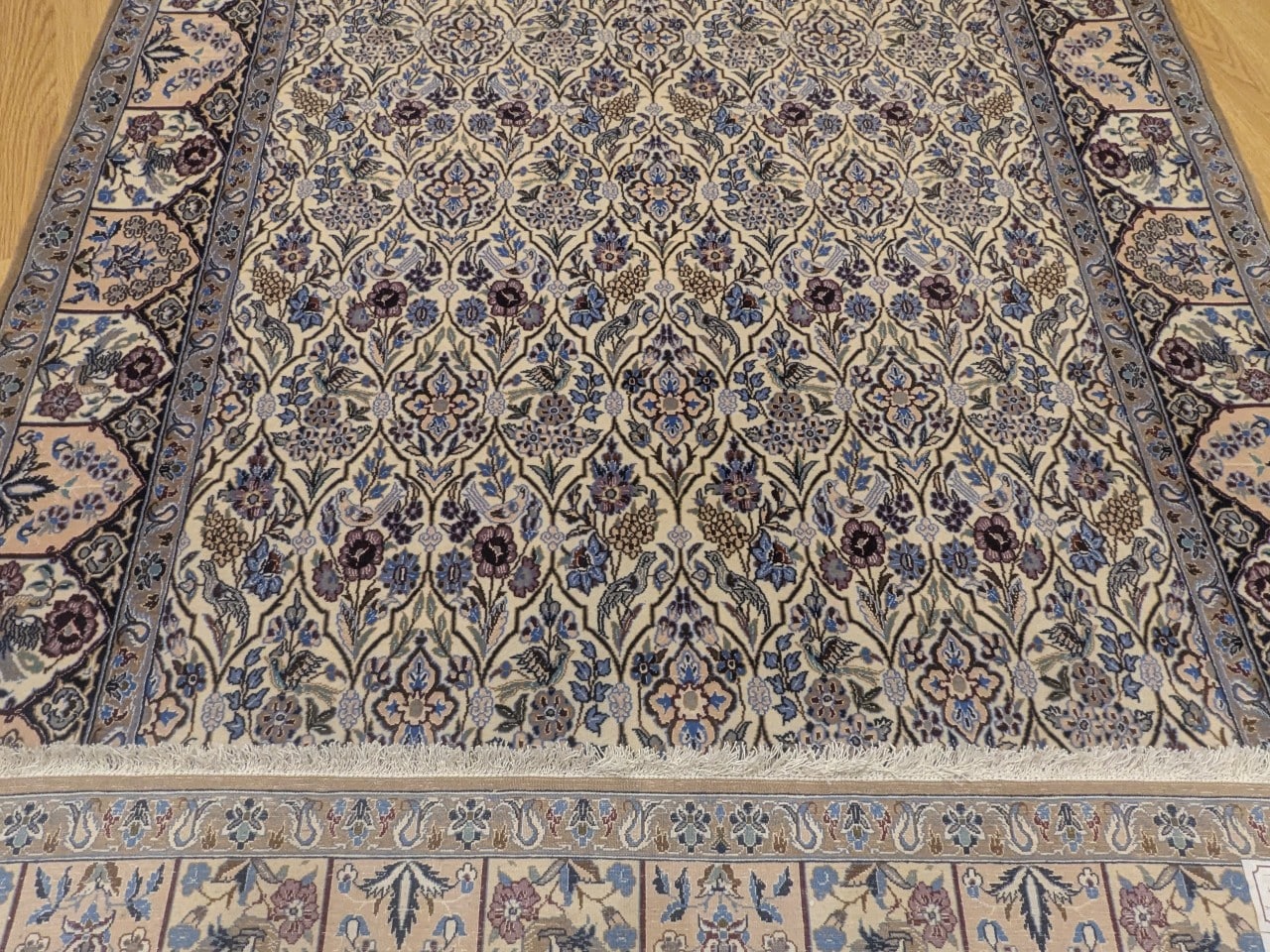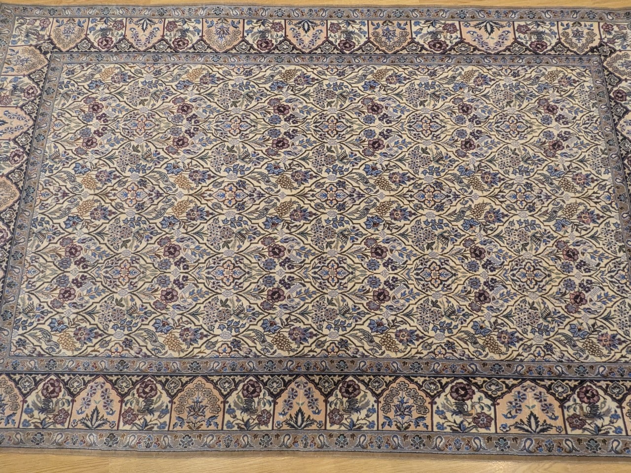 Ce tapis persan Naïn, noué à la main, reflète la finesse emblématique de cette prestigieuse région iranienne. Sur un fond beige clair, s’épanouissent des motifs floraux d’une grande régularité, dans des tons froids de bleu, violet et gris perle. L’ensemble dégage une impression de pureté et d’élégance sobre, caractéristique des tapis Naïn à trame fine.