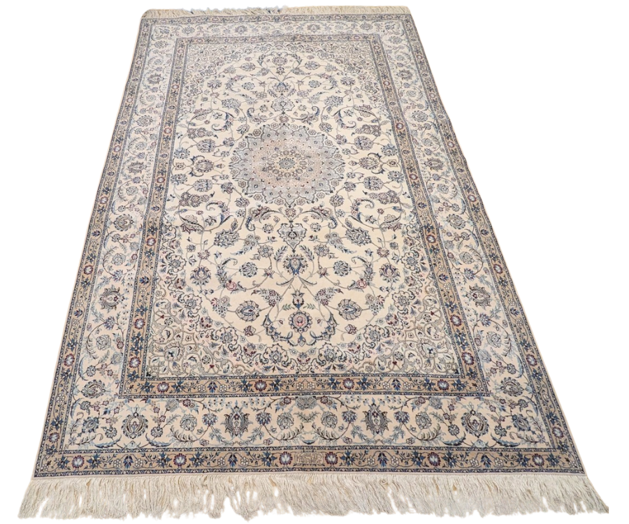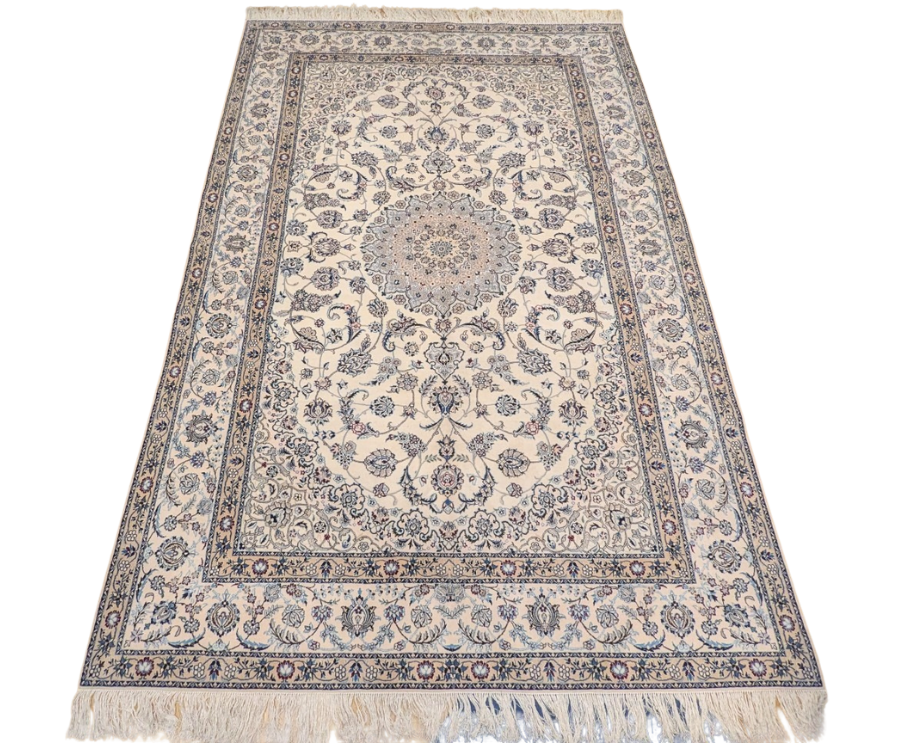 Le tapis Naïn – Isdan est un modèle emblématique du raffinement persan, entièrement noué à la main en Iran. Son fond blanc rehaussé de motifs bleu ciel et marine met en valeur un superbe médaillon central, symbole d’équilibre et de symétrie. Ce tapis incarne l’élégance subtile et la maîtrise technique propre à l’école de Naïn, réputée pour la pureté de ses compositions et la finesse de ses nœuds.