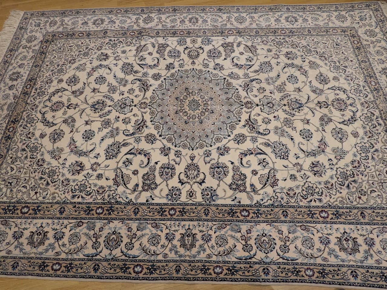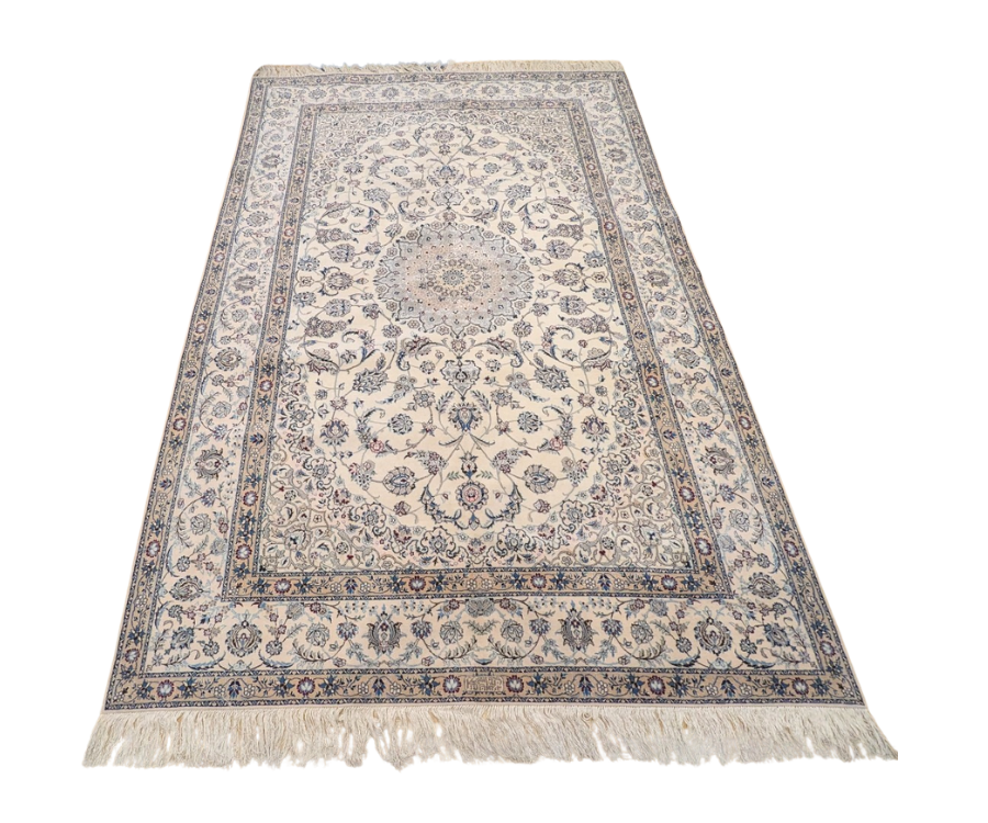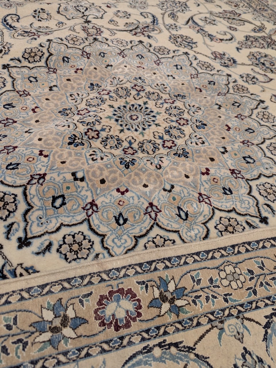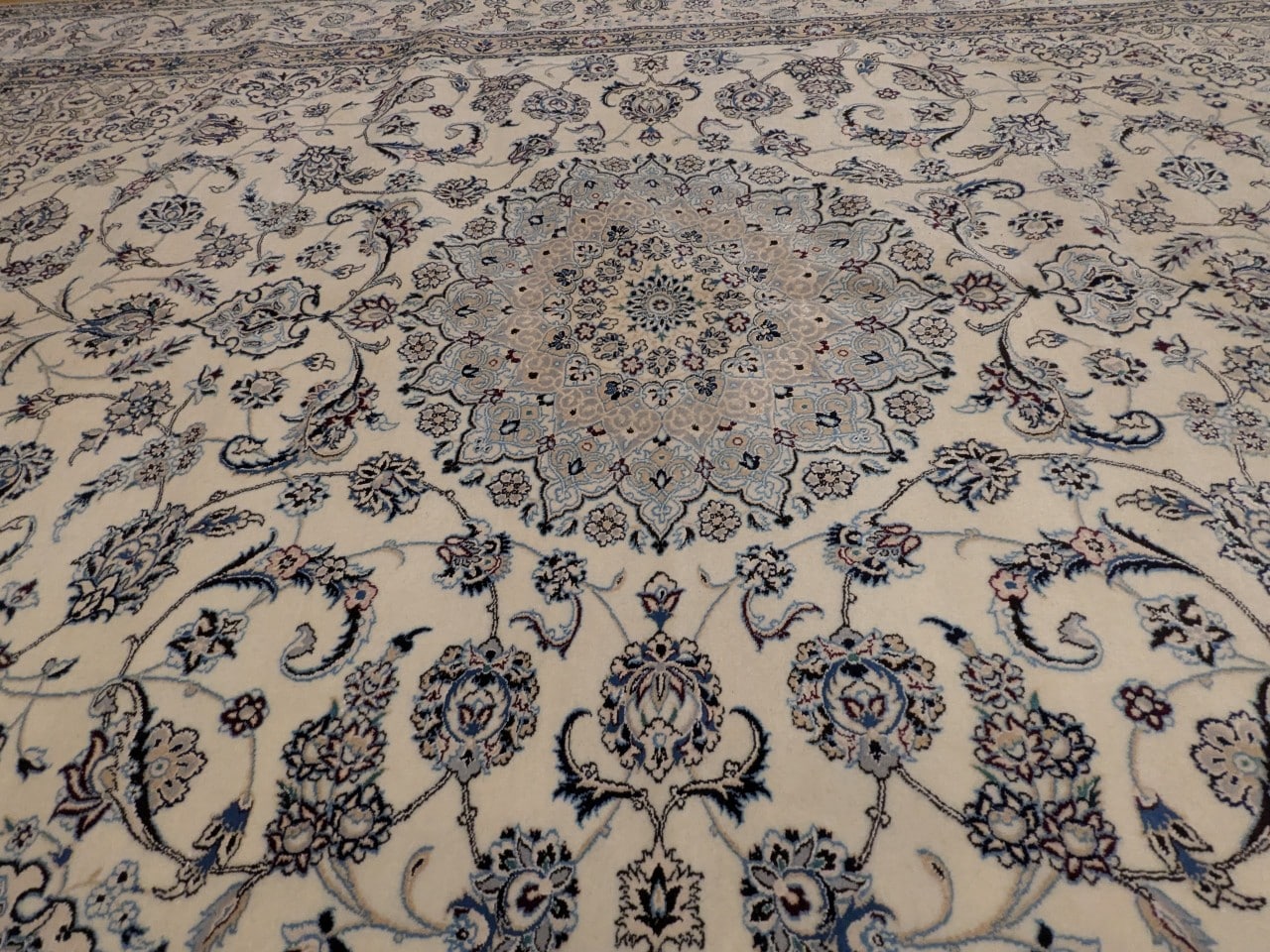 • Un dessin équilibré et précis : Les arabesques florales sont tissées avec une régularité parfaite, typique des ateliers Naïn.