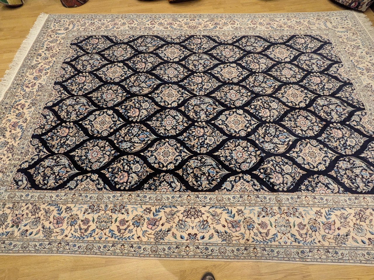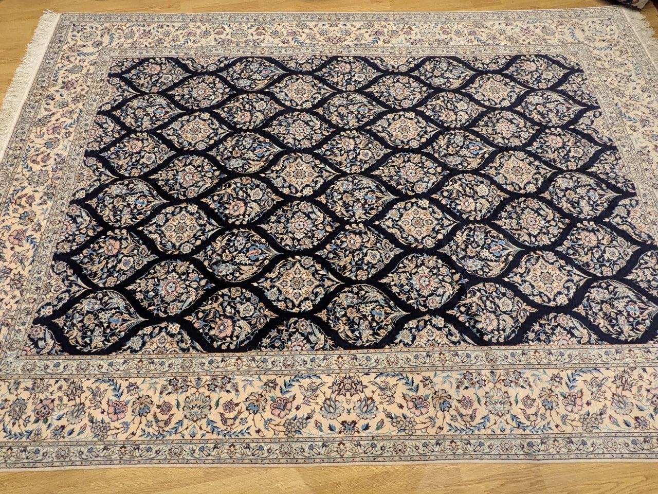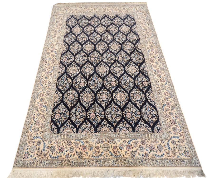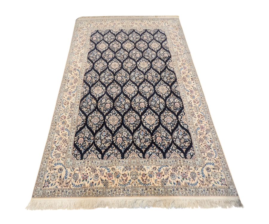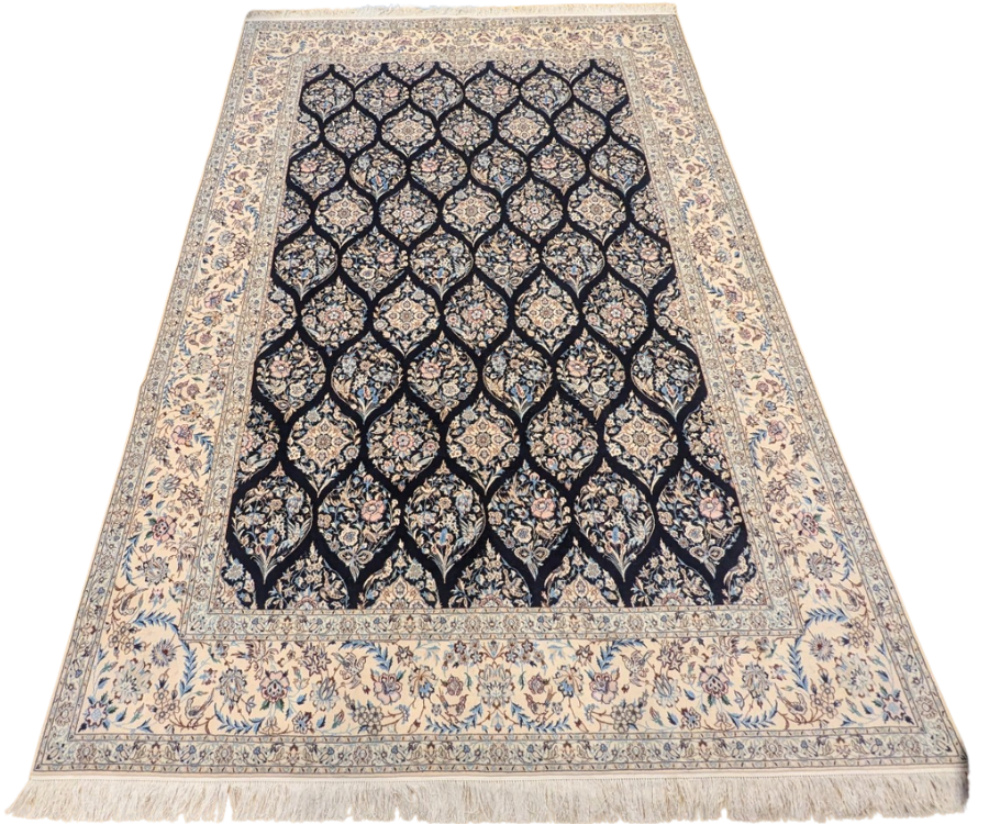 Ce somptueux tapis Naïn iranien se distingue par un fond bleu nuit profond orné de motifs floraux ivoire et pastel, typiques du raffinement persan. La régularité du dessin en losanges floraux lui confère un équilibre parfait entre symétrie et richesse décorative. Noué à la main avec une densité de nœuds élevée, ce tapis incarne la précision et la délicatesse propres aux ateliers de Naïn.