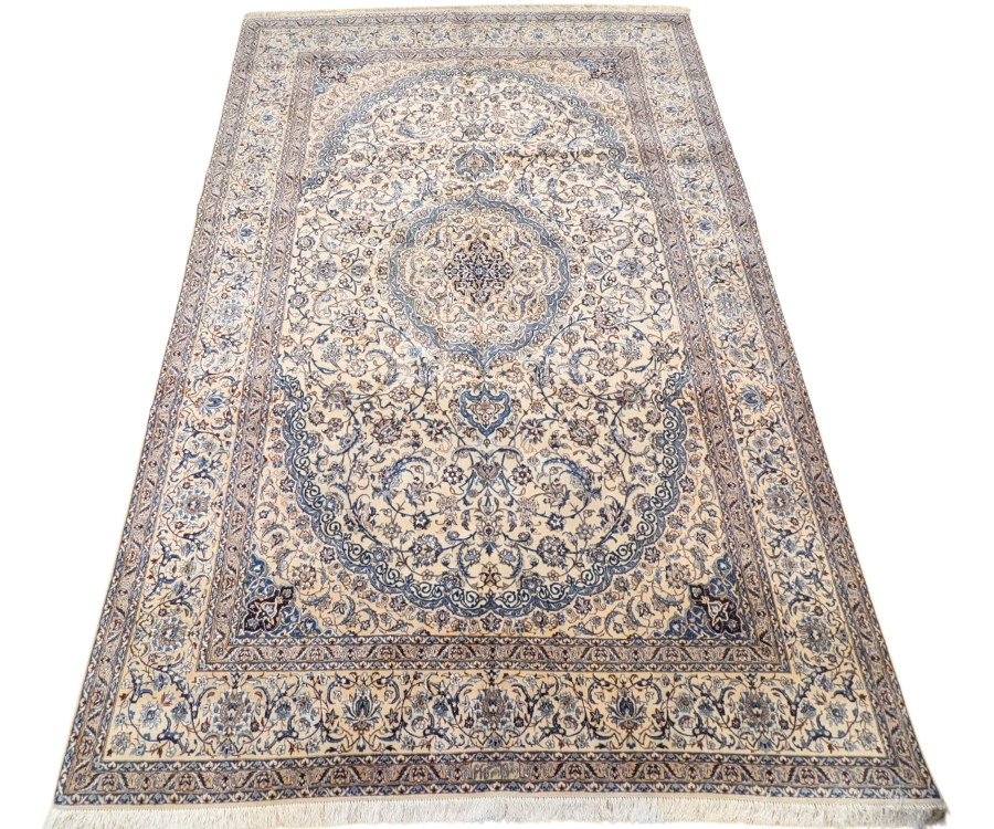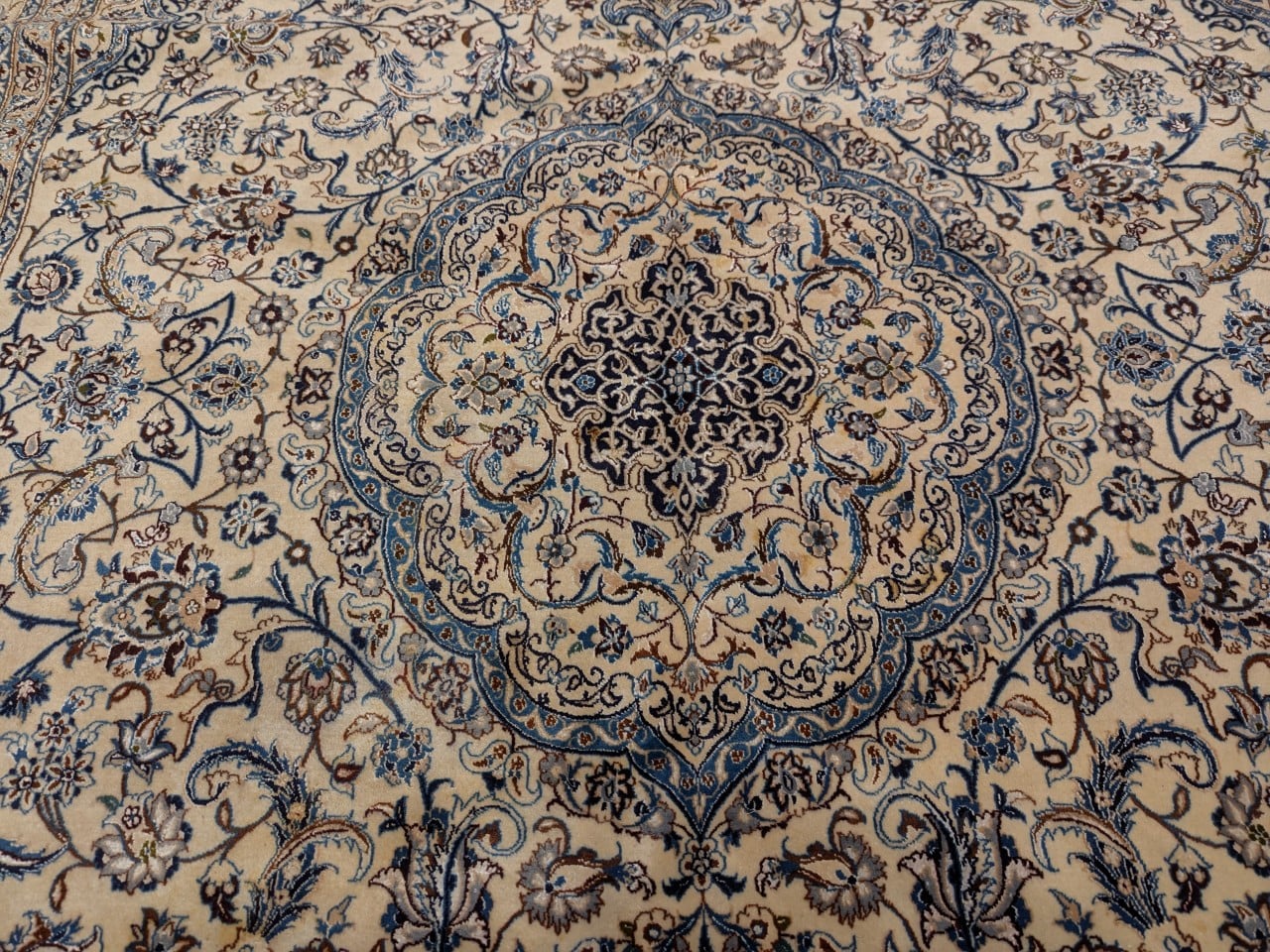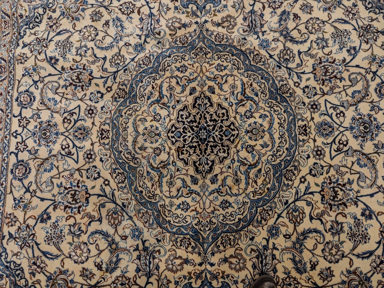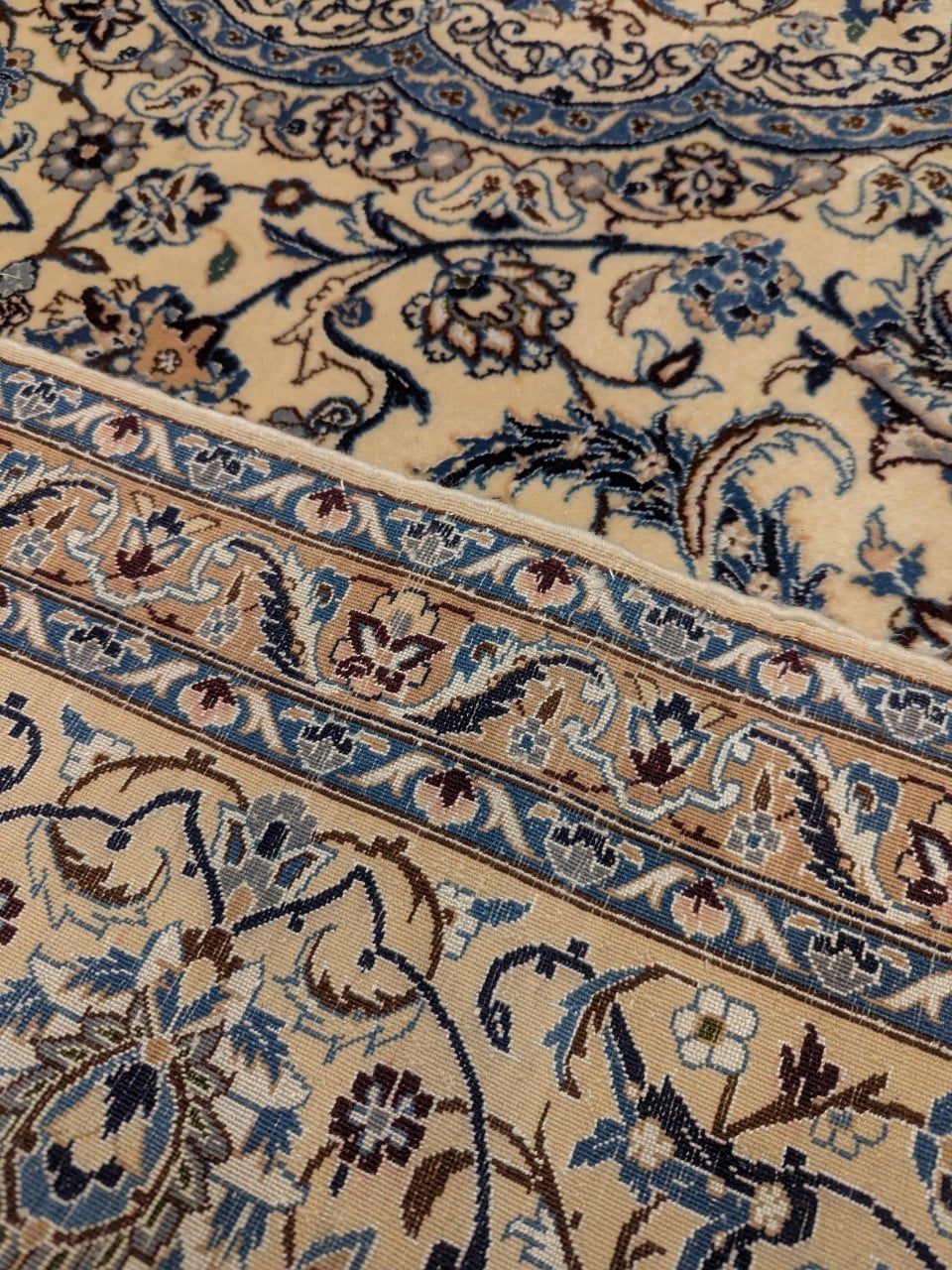 Ce tapis Naïn, noué à la main en Iran, est un exemple raffiné du savoir-faire traditionnel persan. Son fond beige lumineux sert d’écrin à un médaillon central majestueux entouré d’arabesques florales bleutées. La finesse de ses détails et l’élégance de sa palette en font une pièce aussi sobre qu’élégante.