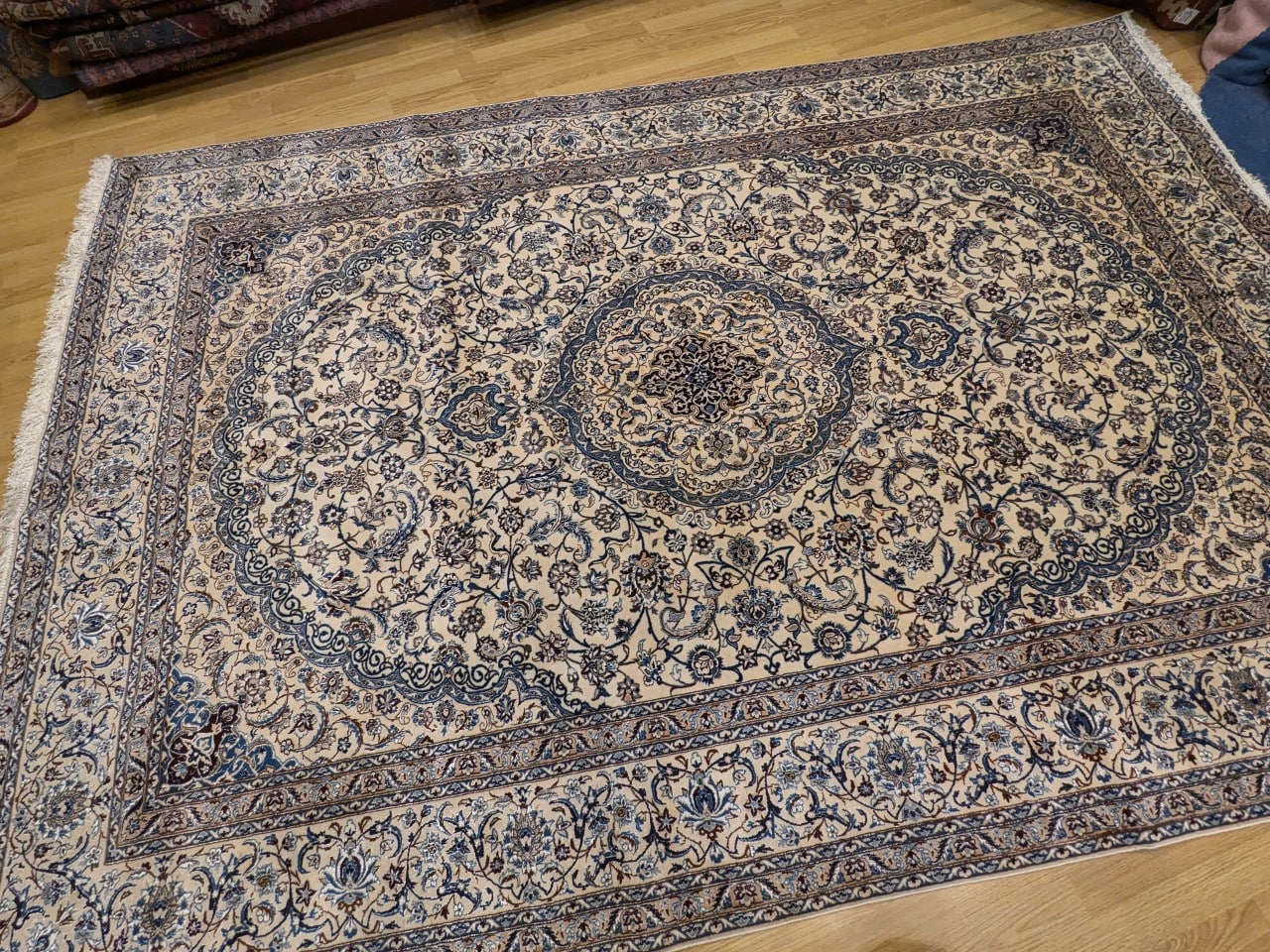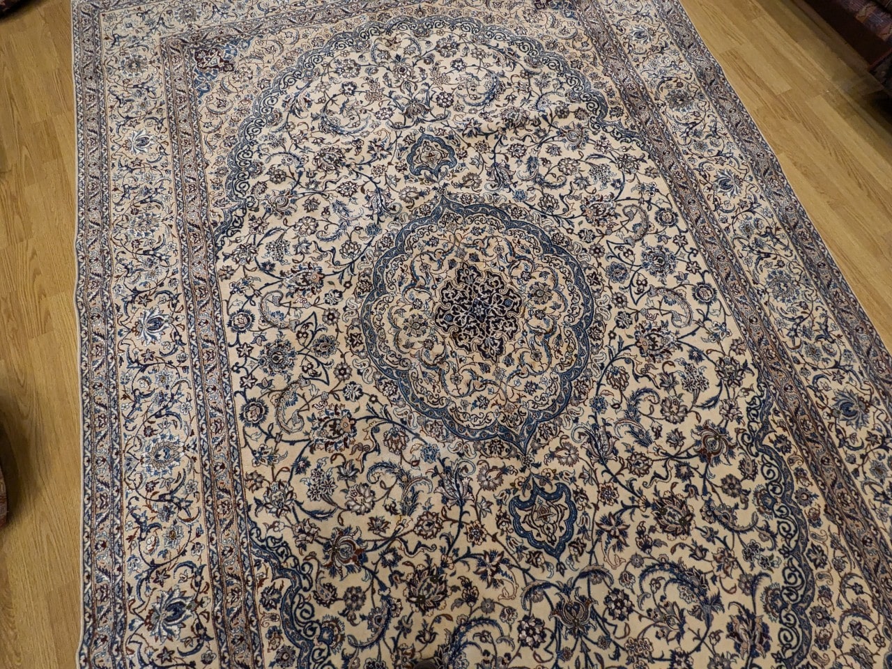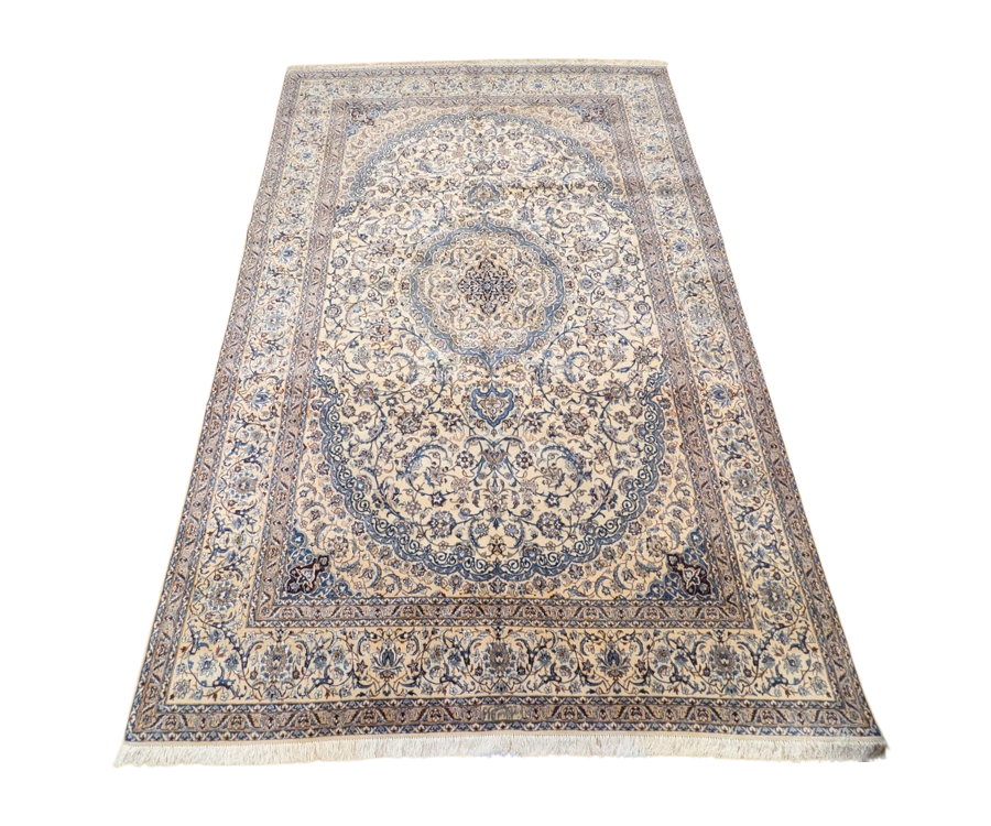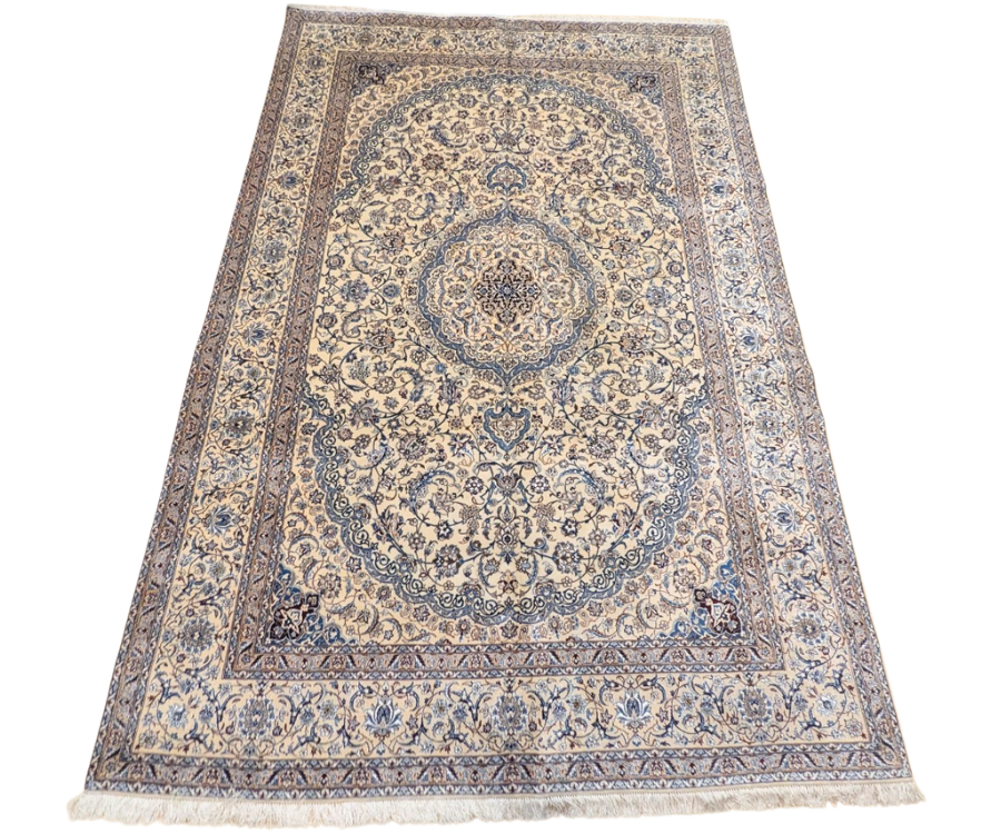 Ce tapis Naïn, noué à la main en Iran, est un exemple raffiné du savoir-faire traditionnel persan. Son fond beige lumineux sert d’écrin à un médaillon central majestueux entouré d’arabesques florales bleutées. La finesse de ses détails et l’élégance de sa palette en font une pièce aussi sobre qu’élégante.