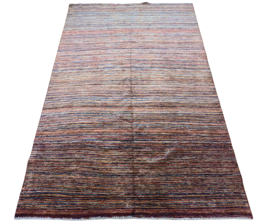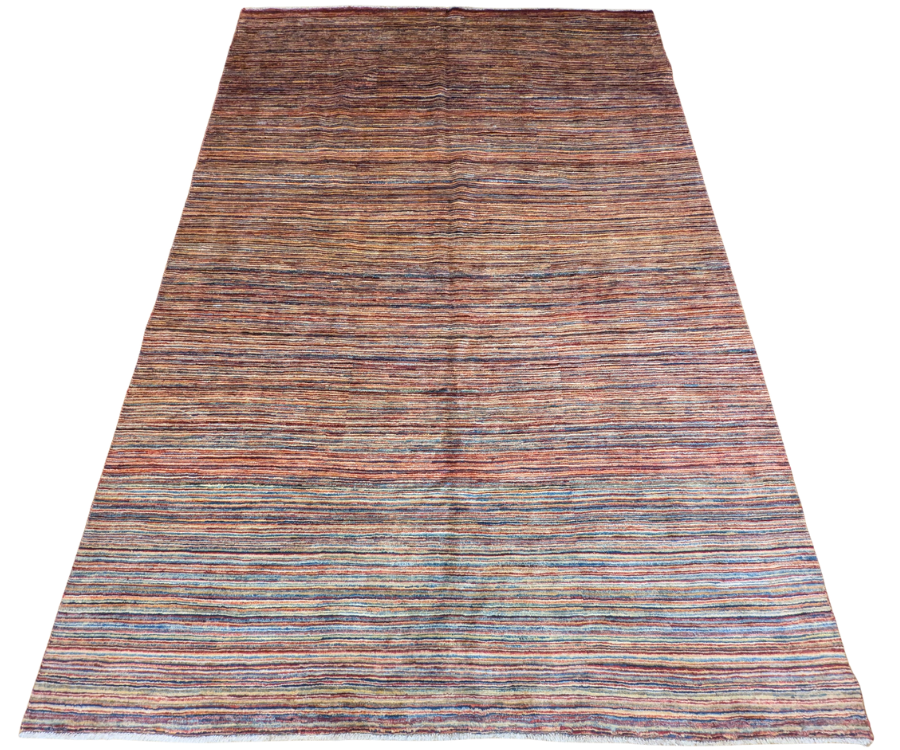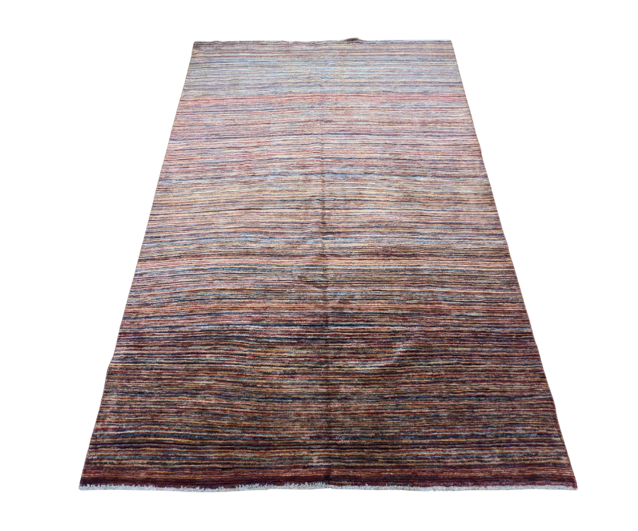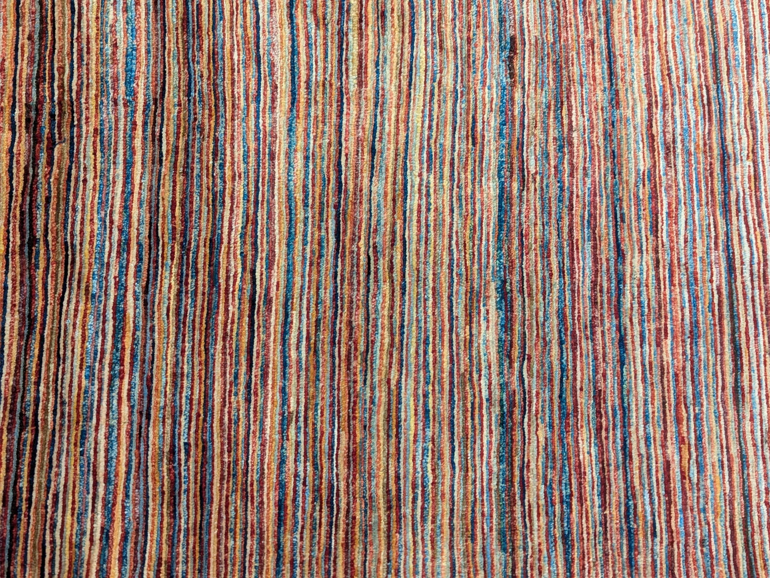 Ce tapis Parsa multicolore noué à la main en Afghanistan se distingue par ses fines rayures linéaires qui mêlent avec subtilité le bleu, le rouge, le beige et le brun. Chaque teinte semble vibrer en harmonie, créant une surface animée et lumineuse. Grâce à sa palette audacieuse et à sa composition structurée, ce tapis combine force visuelle et équilibre.
