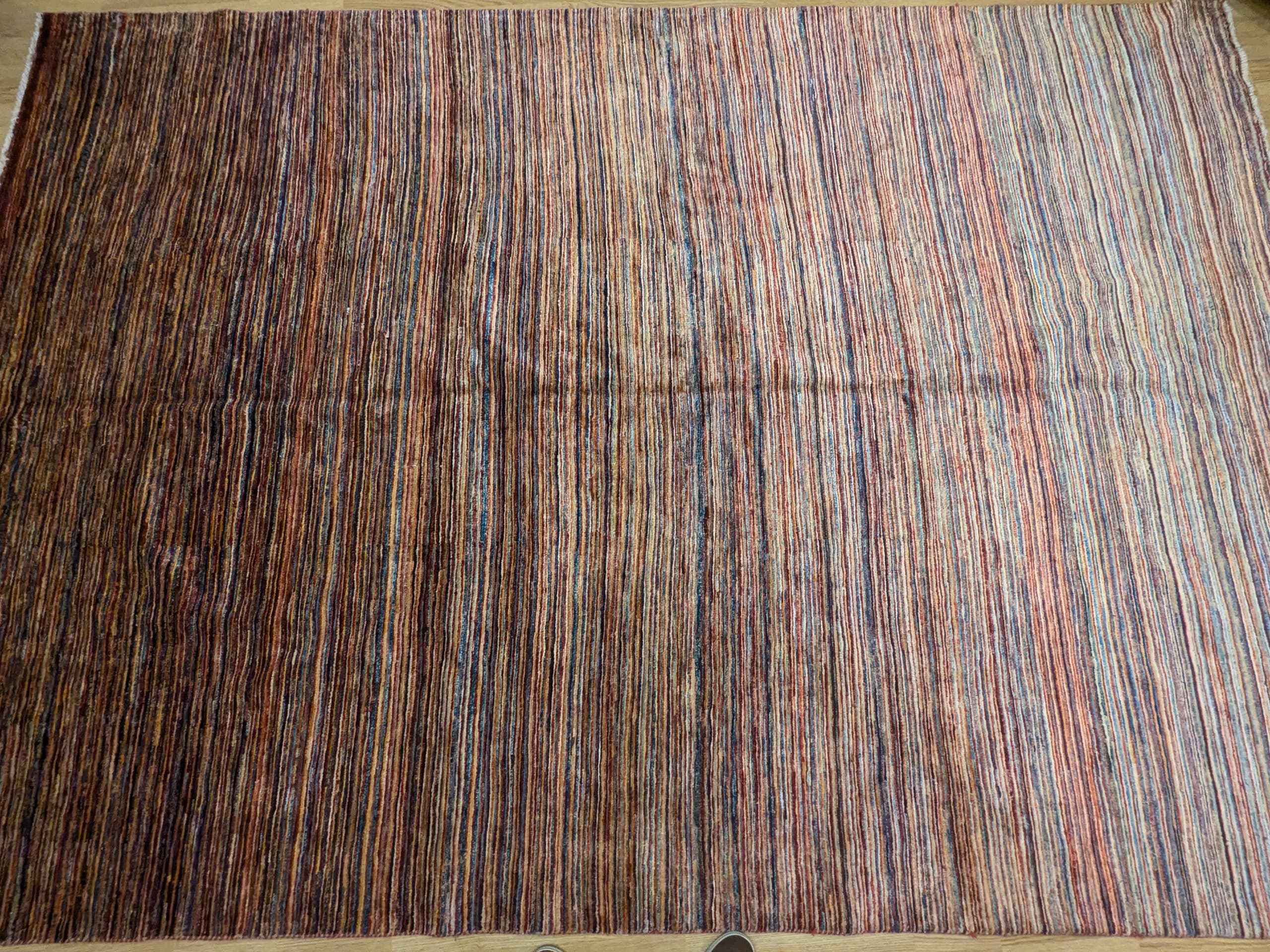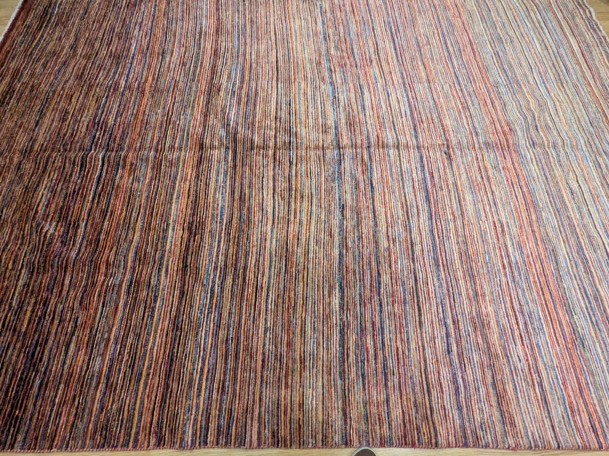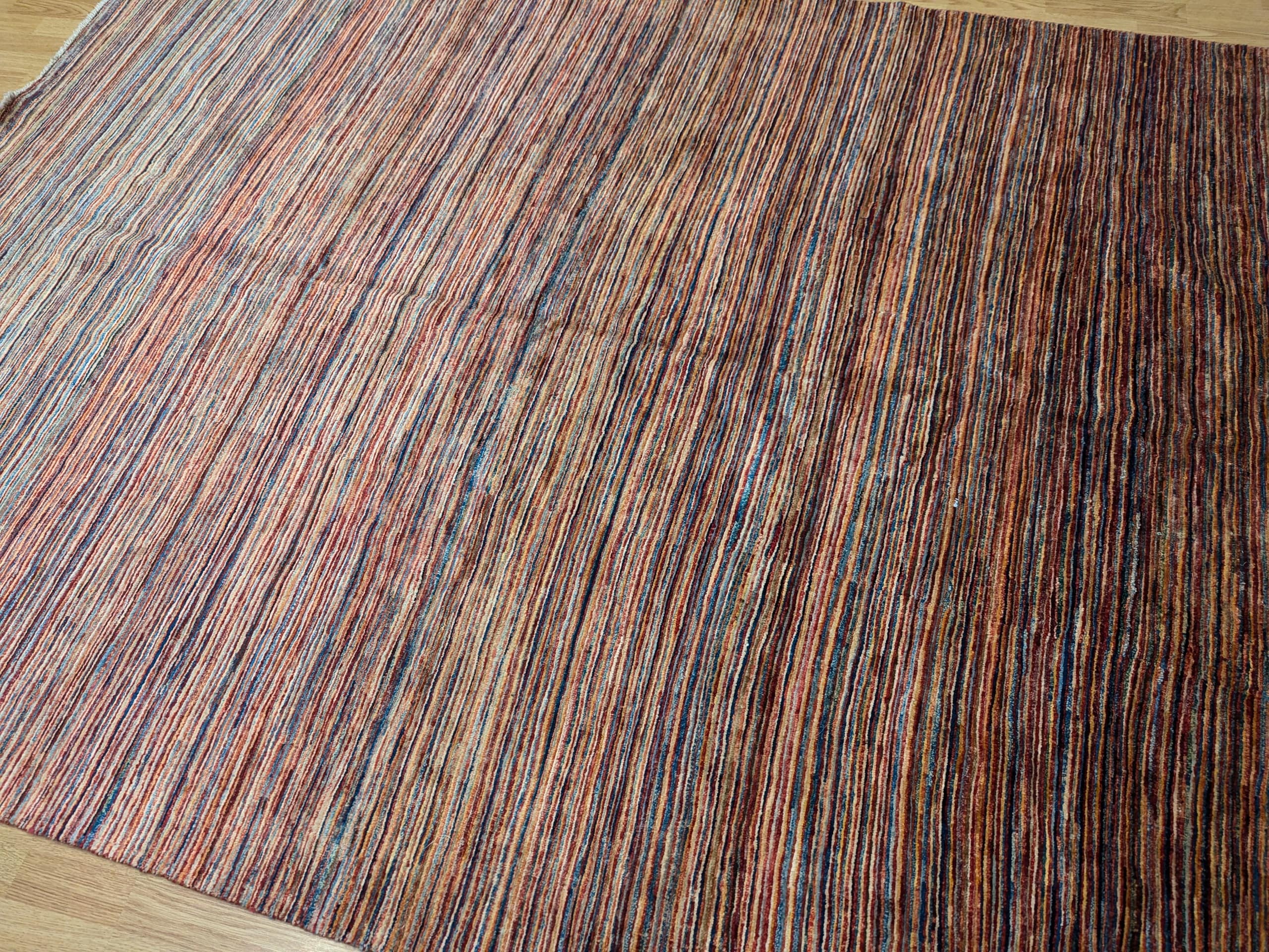 Ce tapis Parsa multicolore noué à la main en Afghanistan se distingue par ses fines rayures linéaires qui mêlent avec subtilité le bleu, le rouge, le beige et le brun. Chaque teinte semble vibrer en harmonie, créant une surface animée et lumineuse. Grâce à sa palette audacieuse et à sa composition structurée, ce tapis combine force visuelle et équilibre.