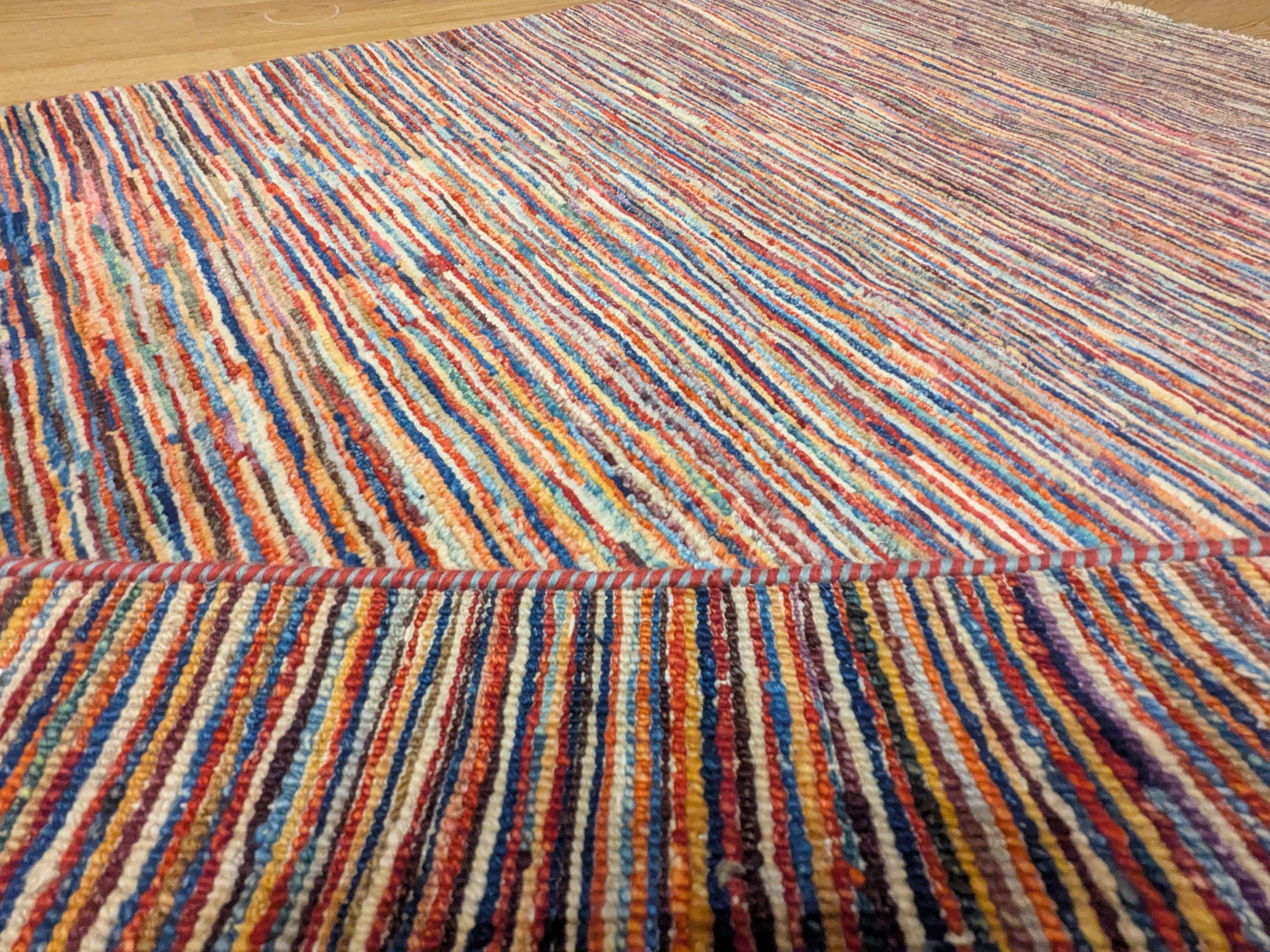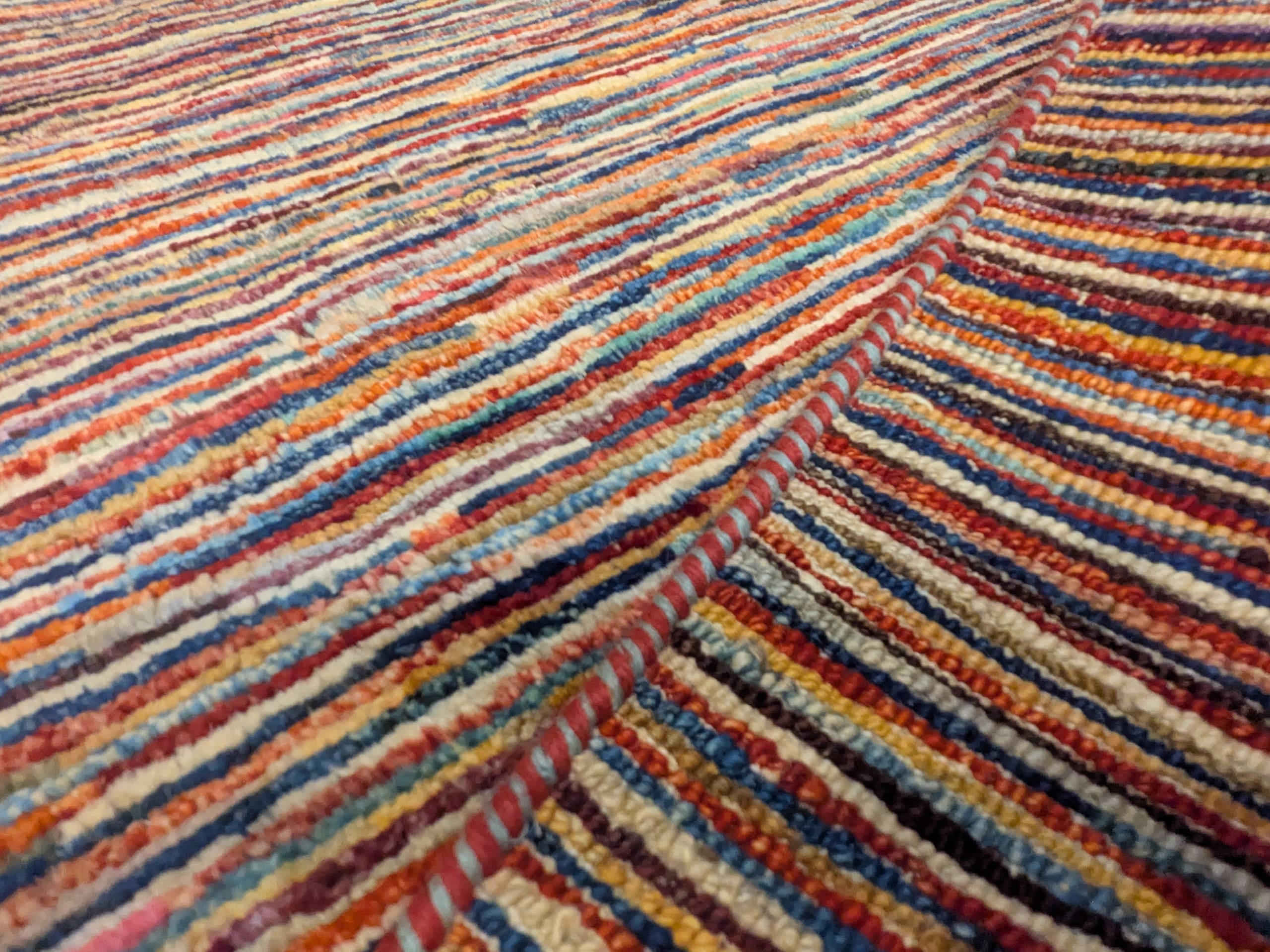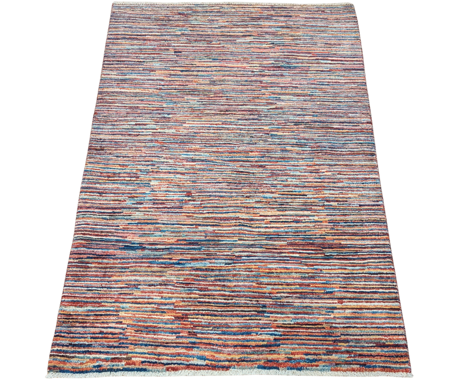 Ce tapis Parsa d’Afghanistan se distingue par son design contemporain composé d’une multitude de fines rayures multicolores. Les nuances de bleu, rouge, orange, beige et brun s’entremêlent dans un jeu subtil de lignes irrégulières qui crée un effet visuel vivant et dynamique.