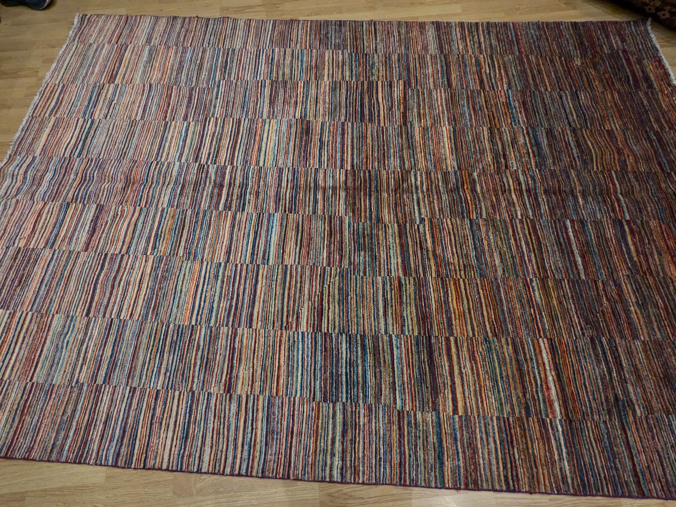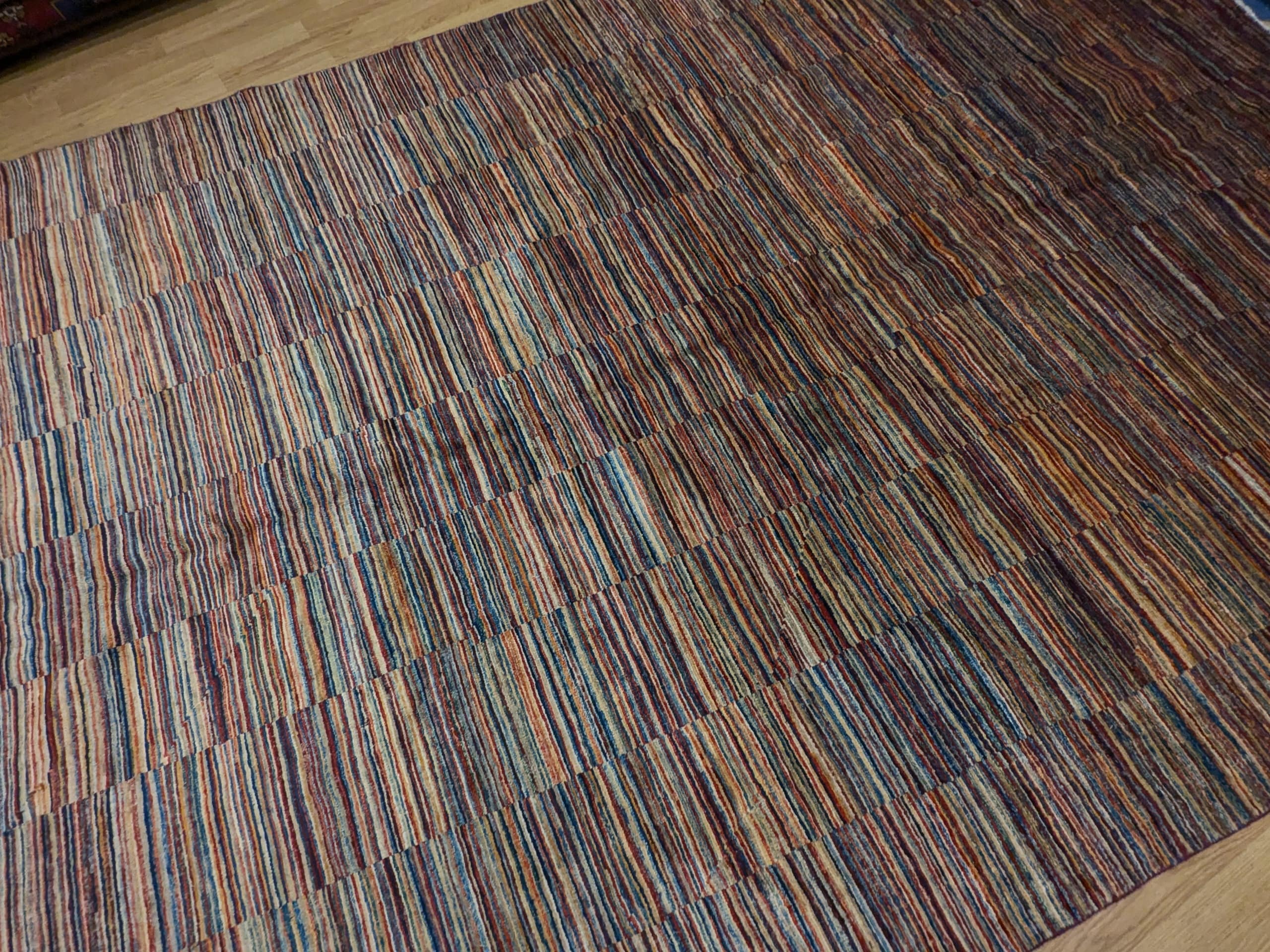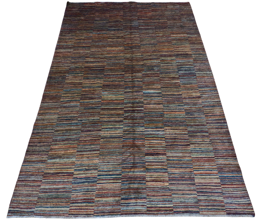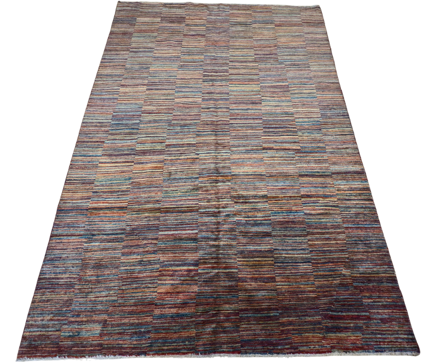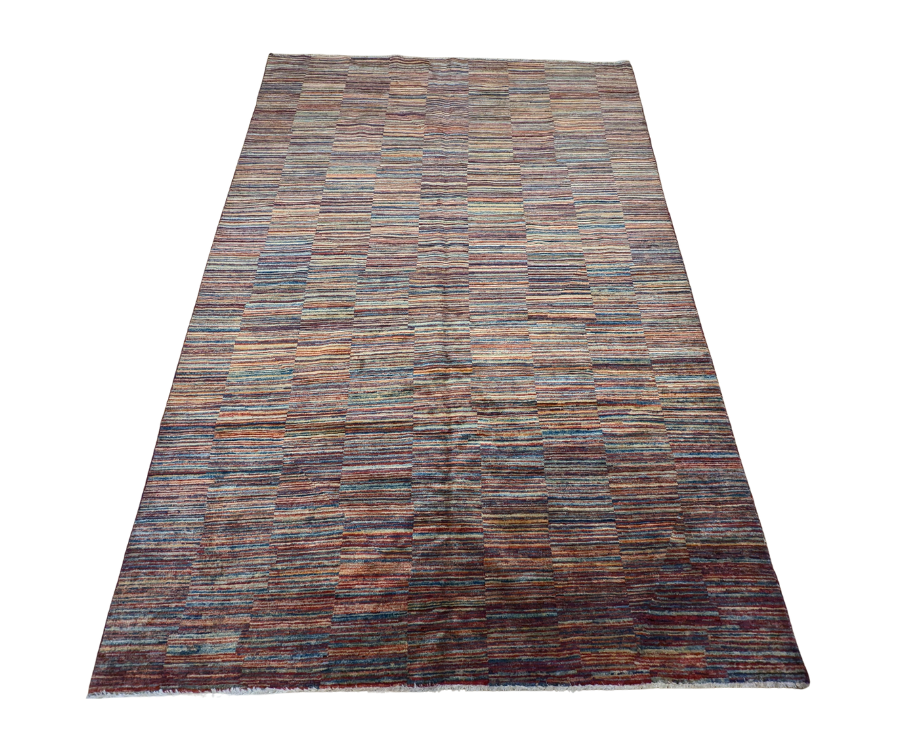 Ce tapis Parsa noué main en Afghanistan séduit par sa modernité audacieuse et sa construction graphique subtile. Son jeu de bandes colorées, construites en rectangles réguliers, crée une illusion visuelle entre rayures et damiers, renforçant son caractère contemporain. Il mêle harmonieusement des tons vifs de bleu, jaune, rouge et beige pour un rendu vivant mais équilibré.