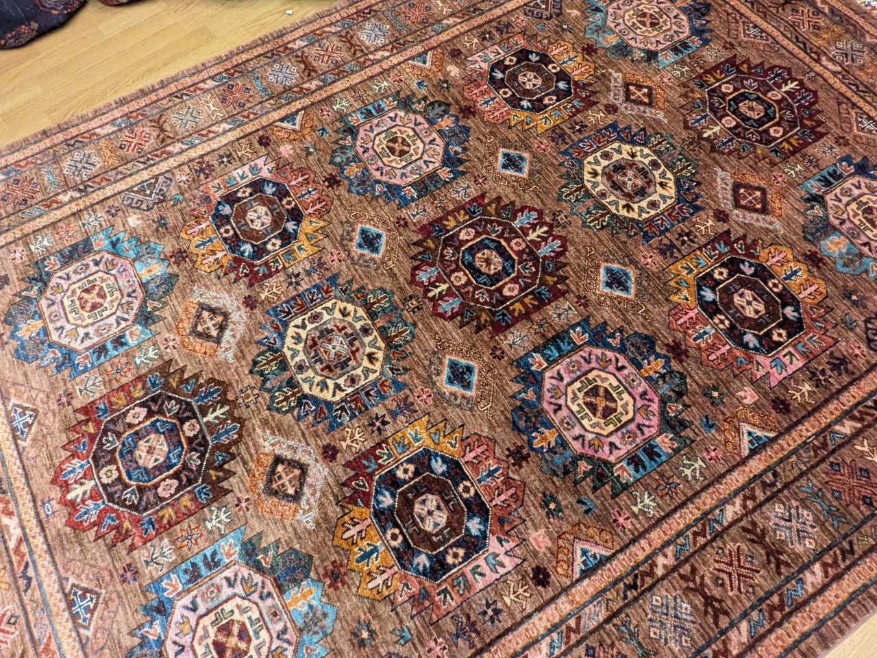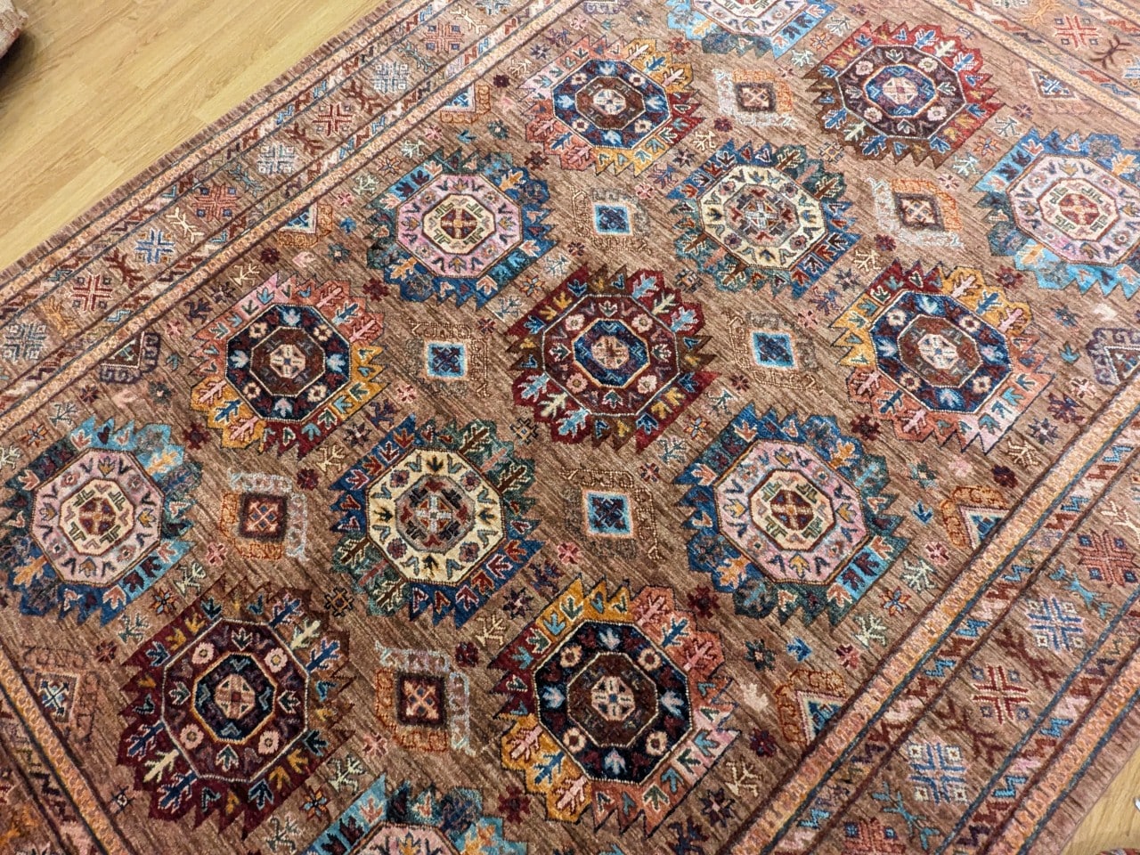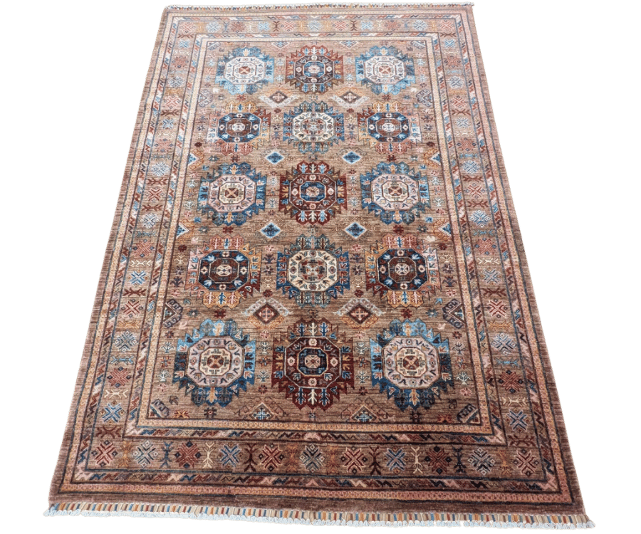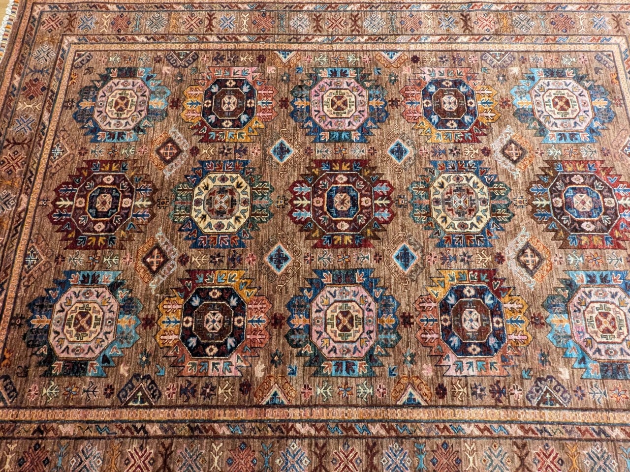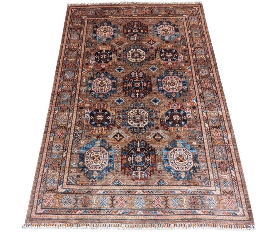 Ce tapis afghan de la collection Saray incarne toute la richesse du style tribal avec son fond brun chaleureux et sa succession de médaillons colorés aux contours géométriques. Tissé à la main avec une grande précision, il mêle des tons profonds de marron, brique, bleu et ivoire, créant un équilibre subtil entre tradition et puissance graphique. Un tapis dense et expressif qui trouve naturellement sa place dans les intérieurs sophistiqués.